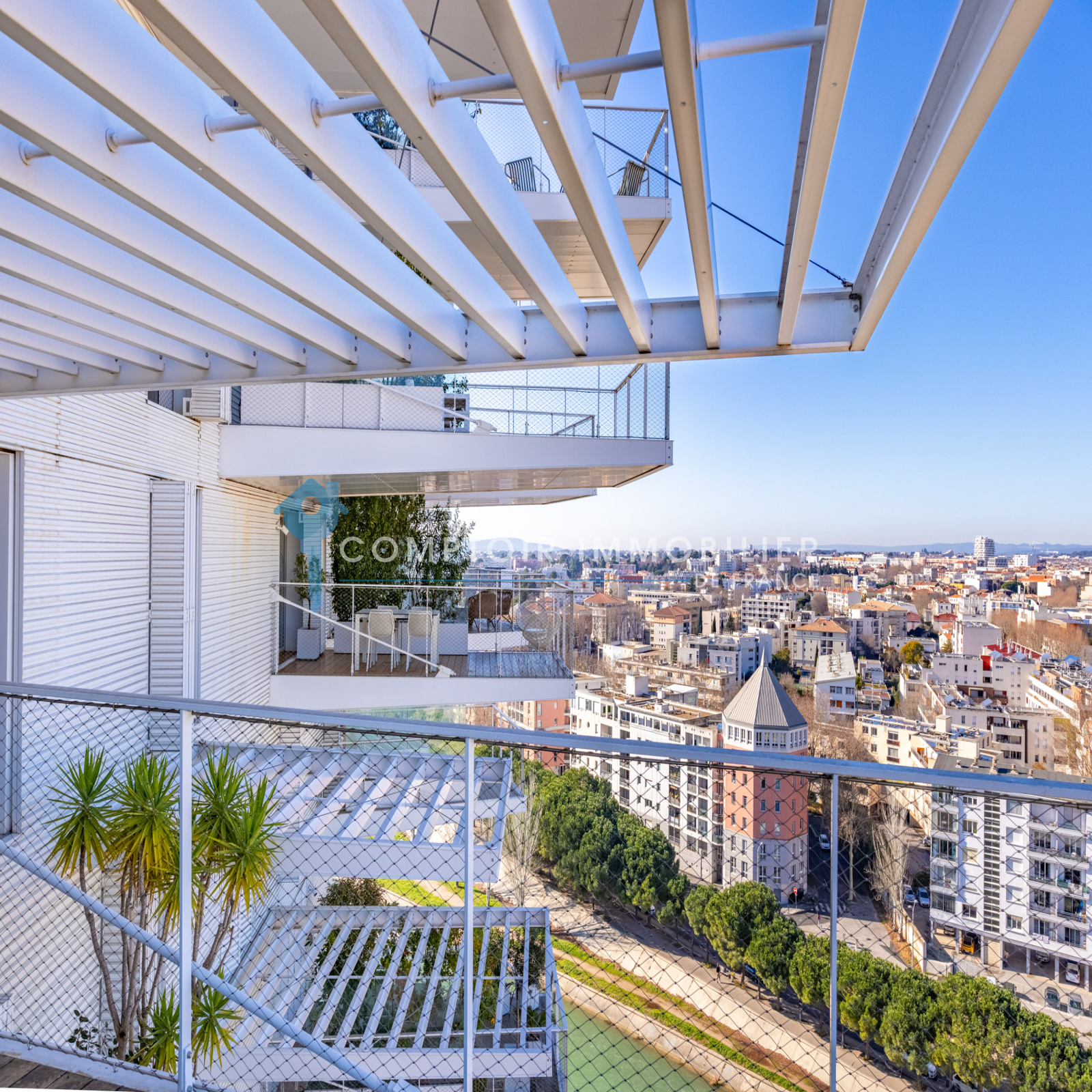 Perché sur les plus hautes branches de l'arbre, cet appartement aux prestations haut de gamme se compose de 4 pièces pour une surface de plus de 150M², aux volumes généreux, baigné de lumière, offrant ainsi une vue panoramique et imprenable à 180 degrés sur la ville de Montpellier.