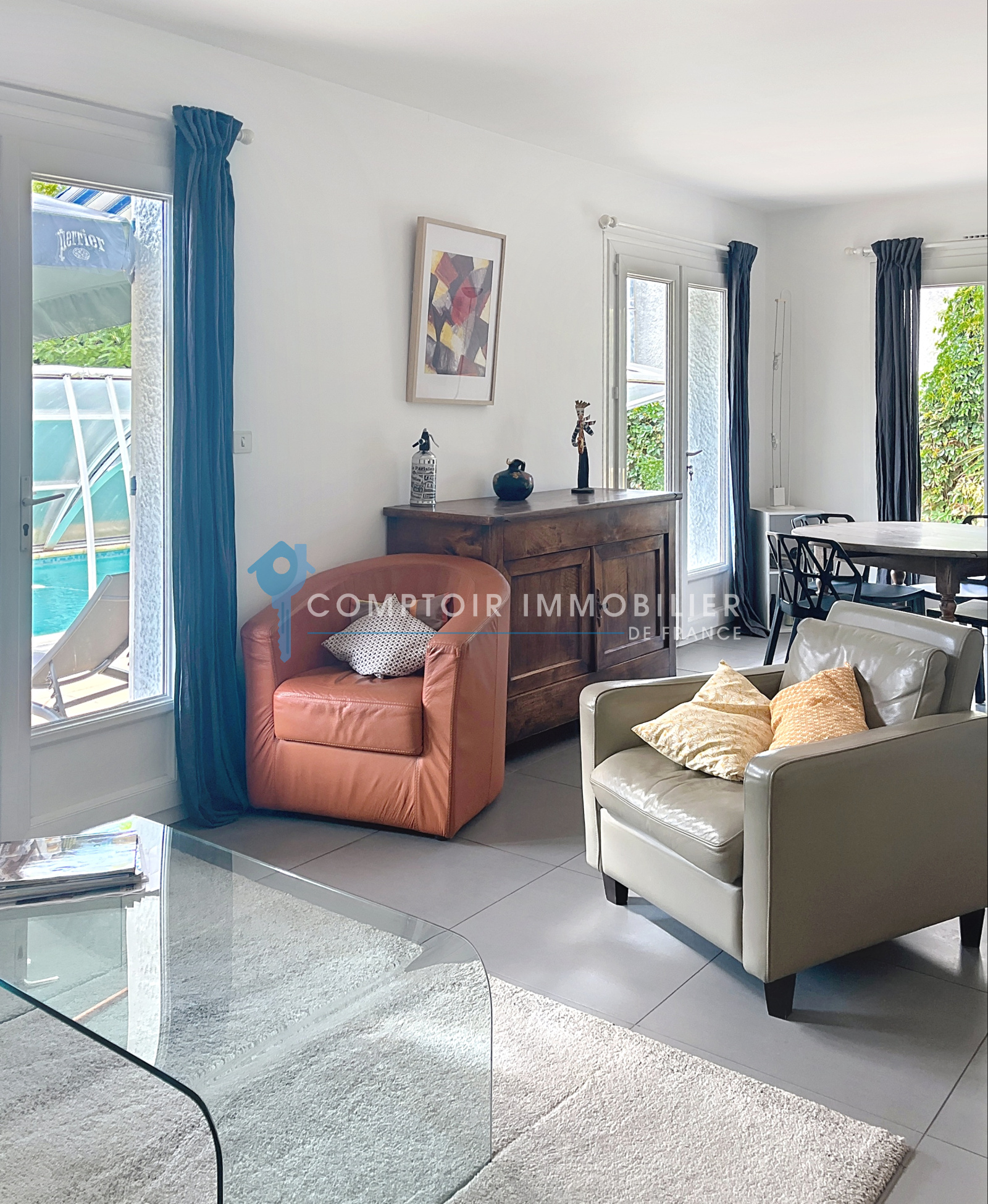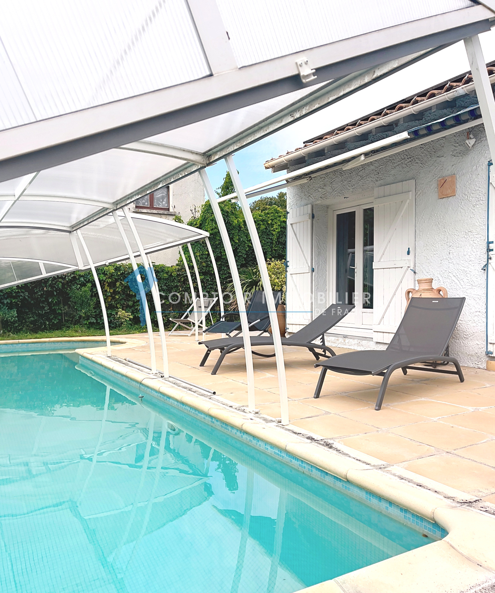 Villa très lumineuse avec de beaux espaces et très bien équipée. Piscine couverte, borne de recharge pour voiture electrique, panneaux photovoltaïques, arrosage automatique, forage, jardin arboré, climatisation, cheminée avec insert.