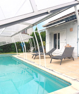 Un grand garage avec une pièce de stockage pour machines à laver et un pool house complète ce bien.