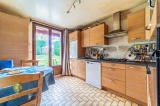 Une cuisine avec porte-fenêtre donnant directement sur la terrasse ;