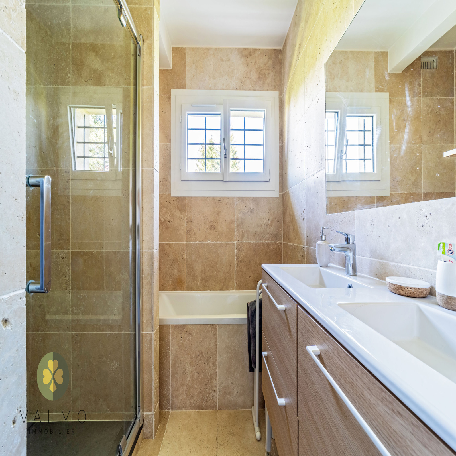 Entrée séparée, cuisine dinatoire aménagée équipée et séparée, un salon ouvert sur salle à manger avec ouverture sur terrasse abritée, chambre de 13m², salle de bain et de douche avec double vasque, et un wc.