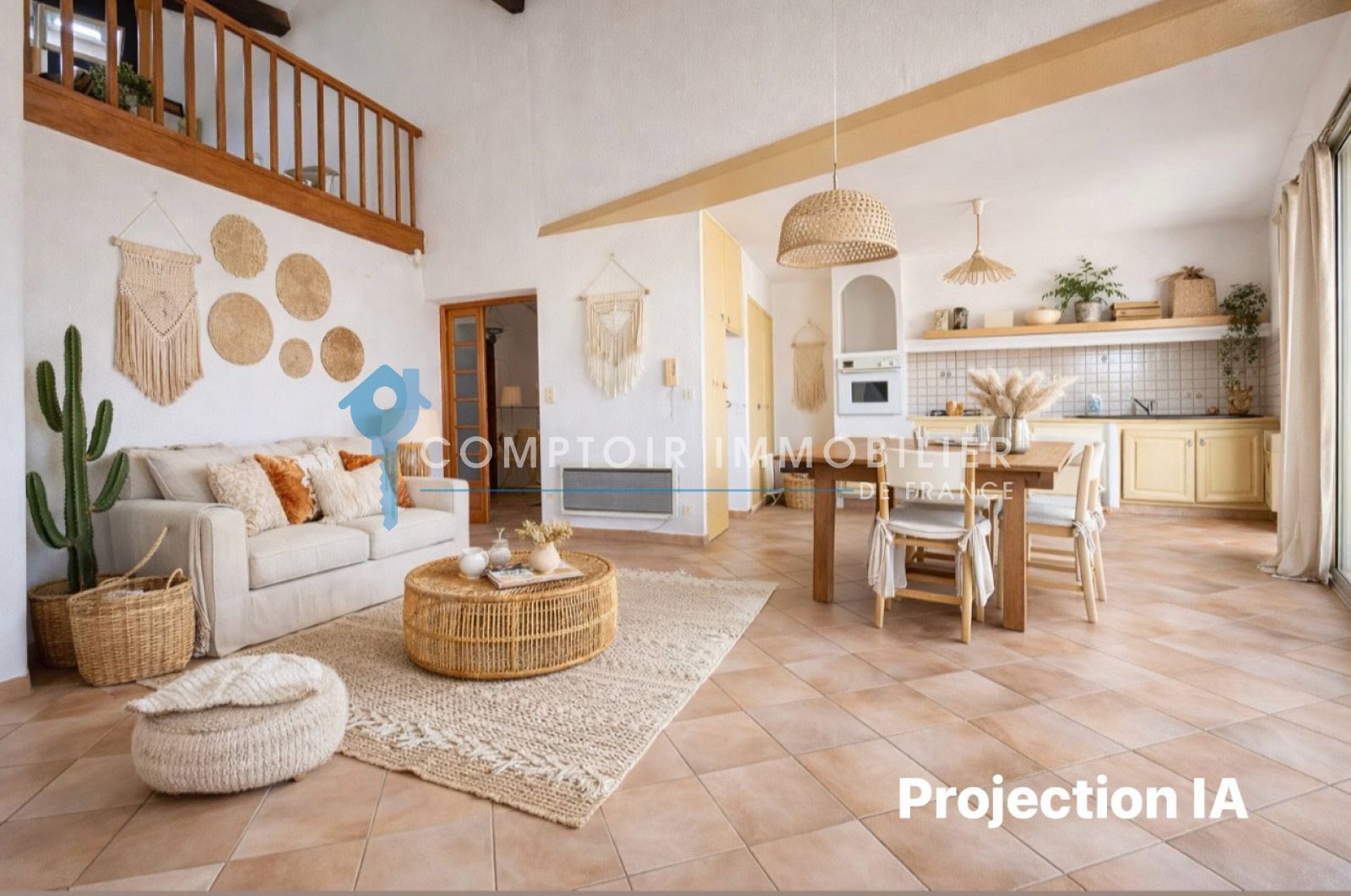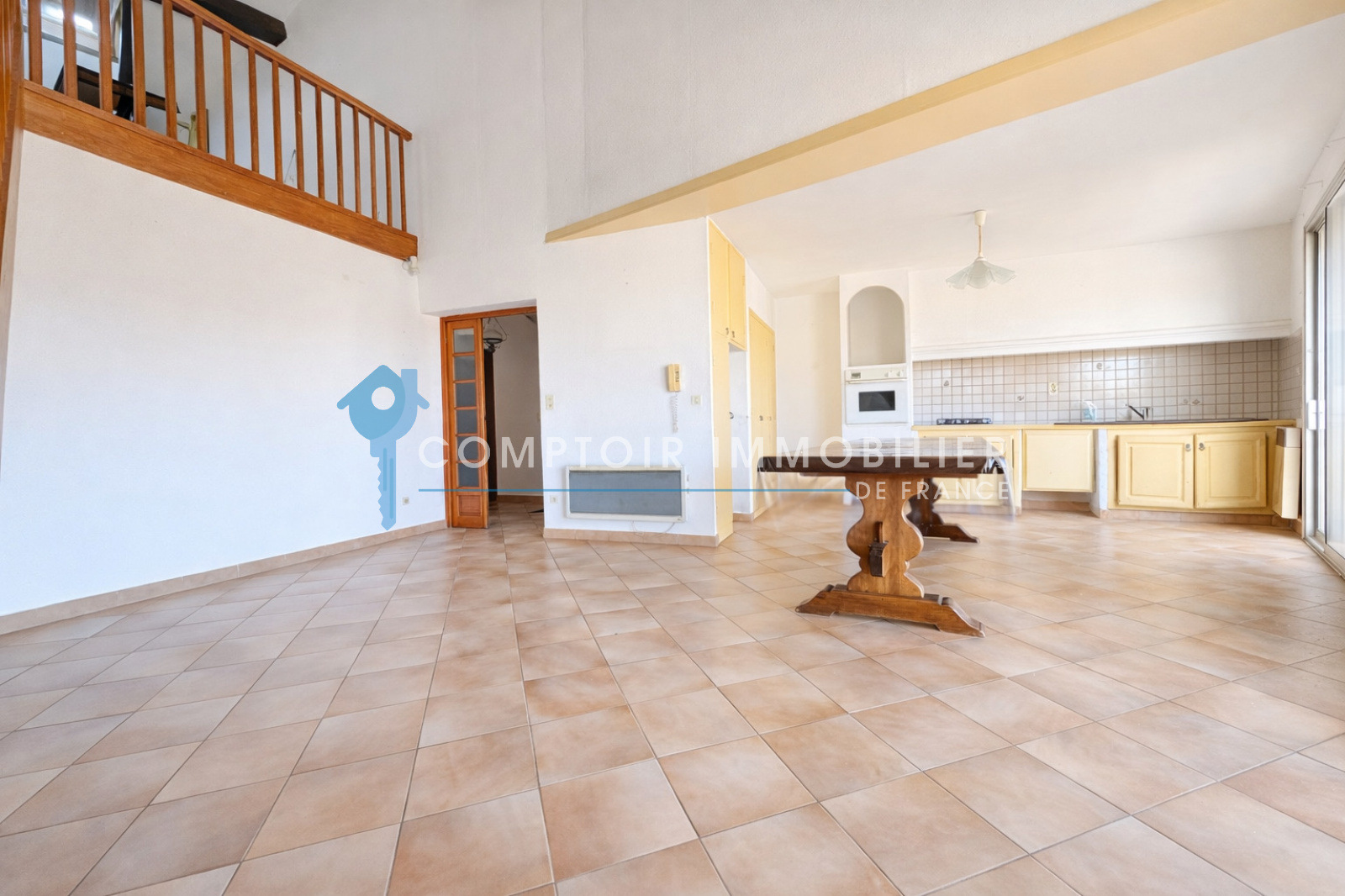 A l'étage une pièce de vie ouverte sur la cuisine avec haut plafond et mezzanine