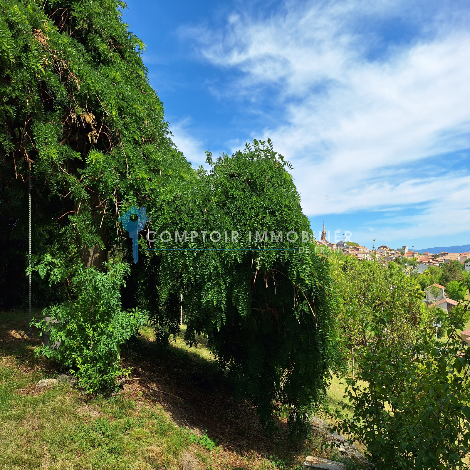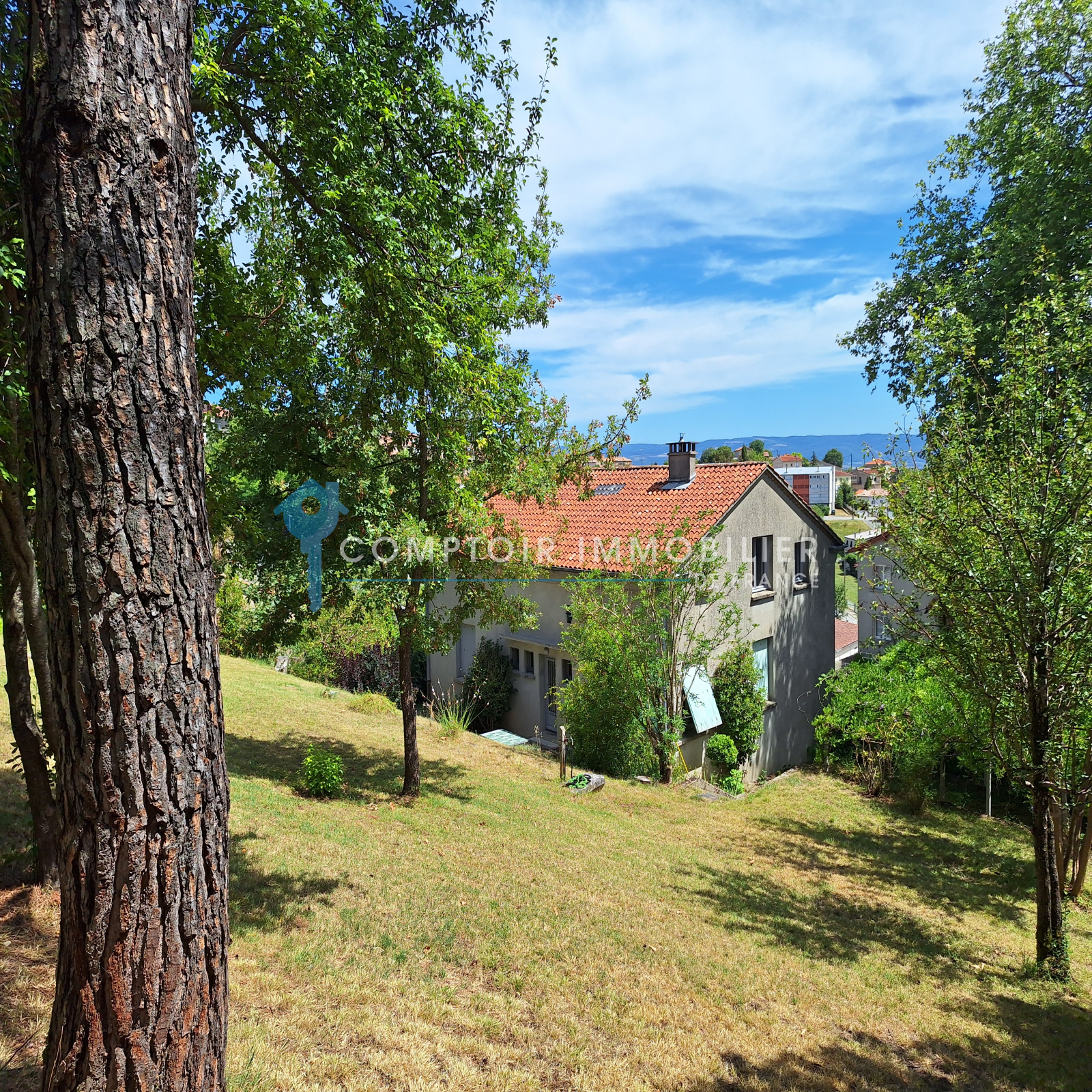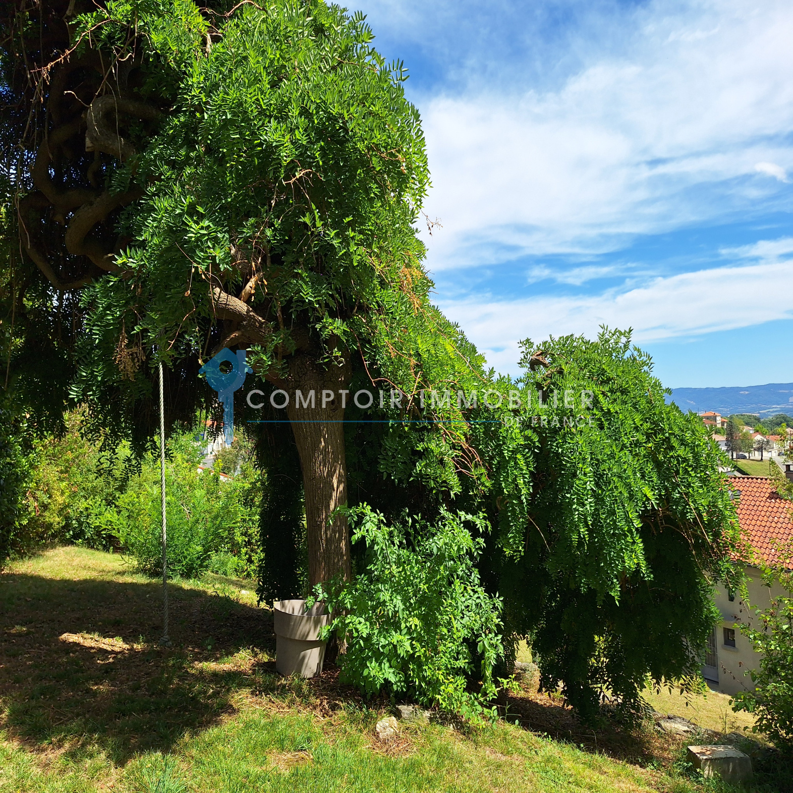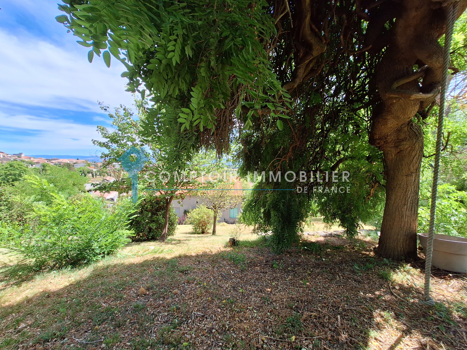 Le grand jardin de 1350m² est arboré et clotûré, avec 2 accès possibles dont 1 en voiture. Il se décline en plusieurs "coins/ambiances" reliés (terrasse, pergola naturelle, espaces plats et espaces en pente).