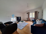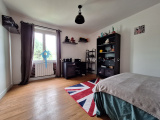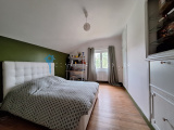 Au premier étage, une autre porte d'entrée ouvre sur une cuisine aménagée, un WC, et un palier qui dessert le salon, la salle à manger avec poêle à pellets et 2 grandes chambres toutes deux reliées par une salle d'eau avec WC.
