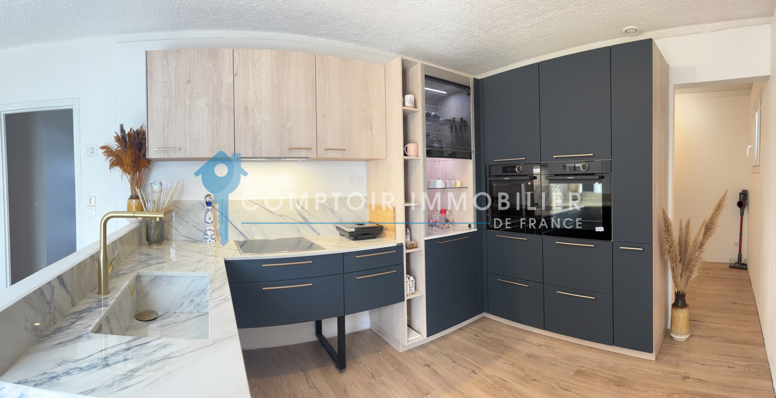 Cette maison présente un séjour/salle à manger avec cheminée, ainsi qu une cuisine séparée, équipée, aux lignes éleguantes et contemporaines.