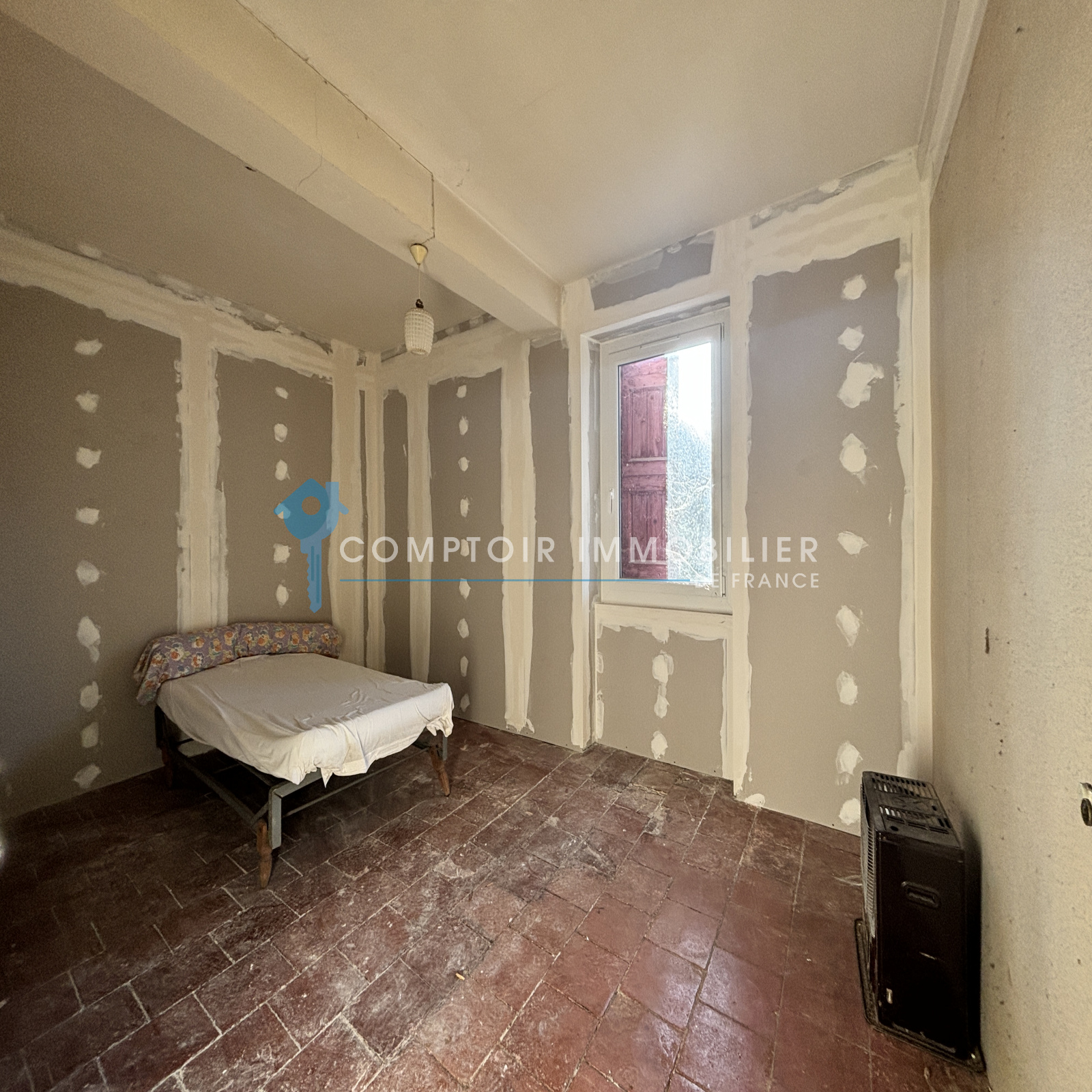 Au RDC: d'une entrée, cuisine, pièce de vie, salle d'eau, WC, et d'une chambre.