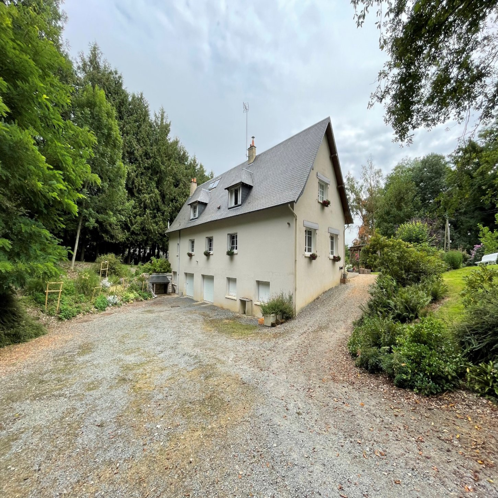 Un sous-sol semi-enterré de 150 m² complète l’ensemble : deux garages, chaufferie, cave et pièce chauffée.