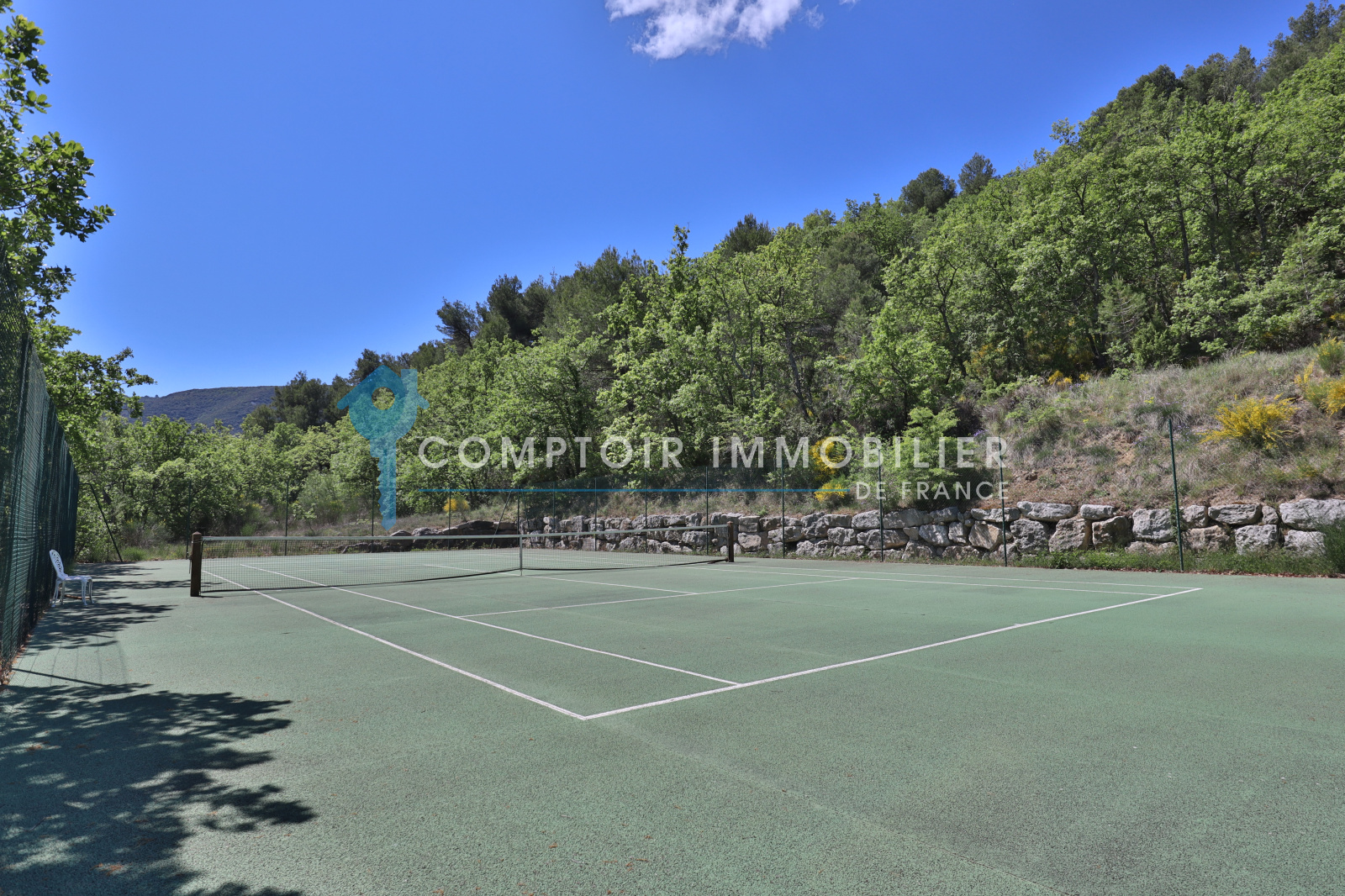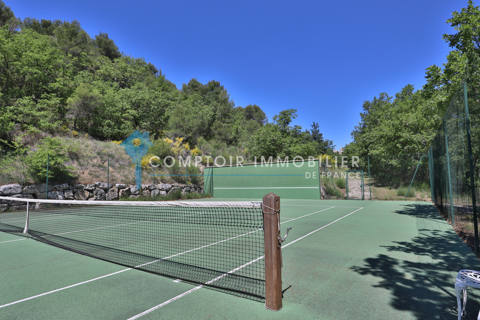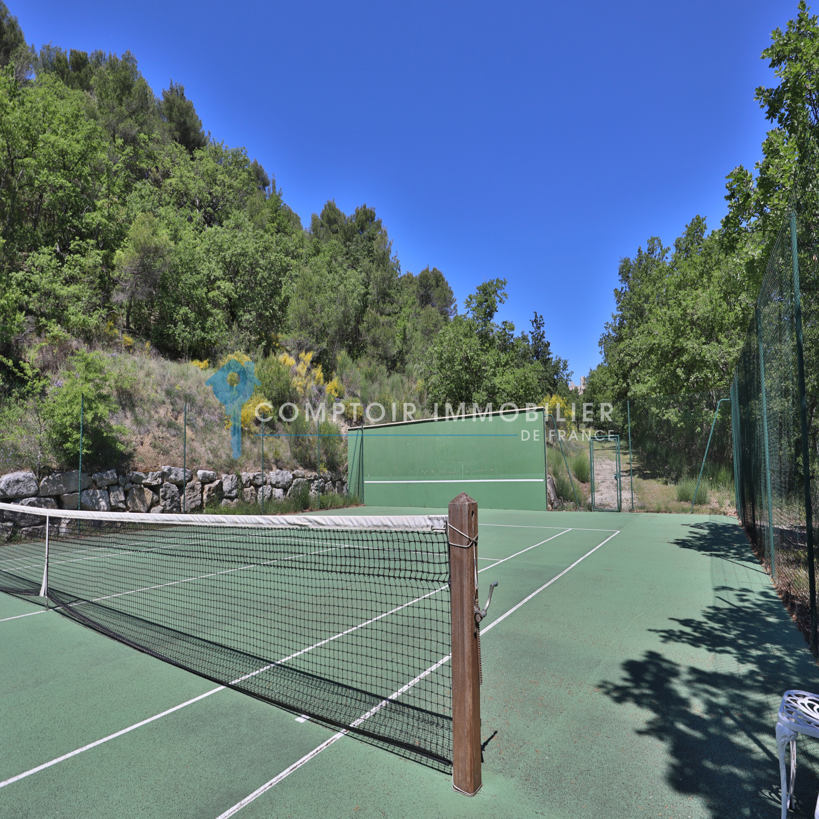 Dans le prolongement du terrain se trouve à distance de la maison un court de tennis avec mur d’entrainement.