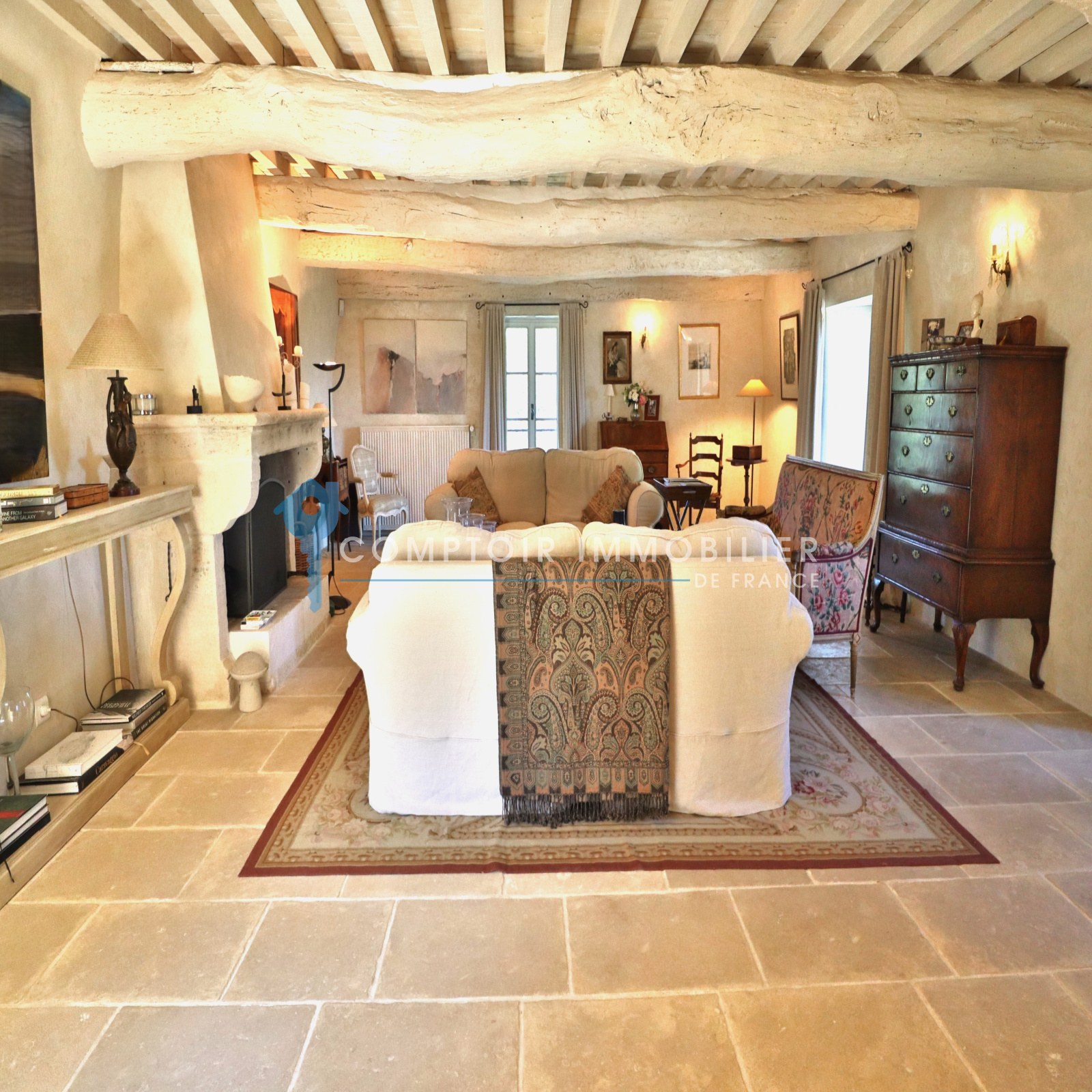 Salon avec cheminée donnant accès côté nord à une terrasse offrant une magnifique vue,