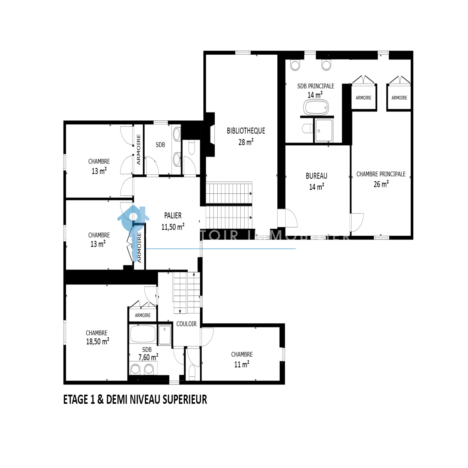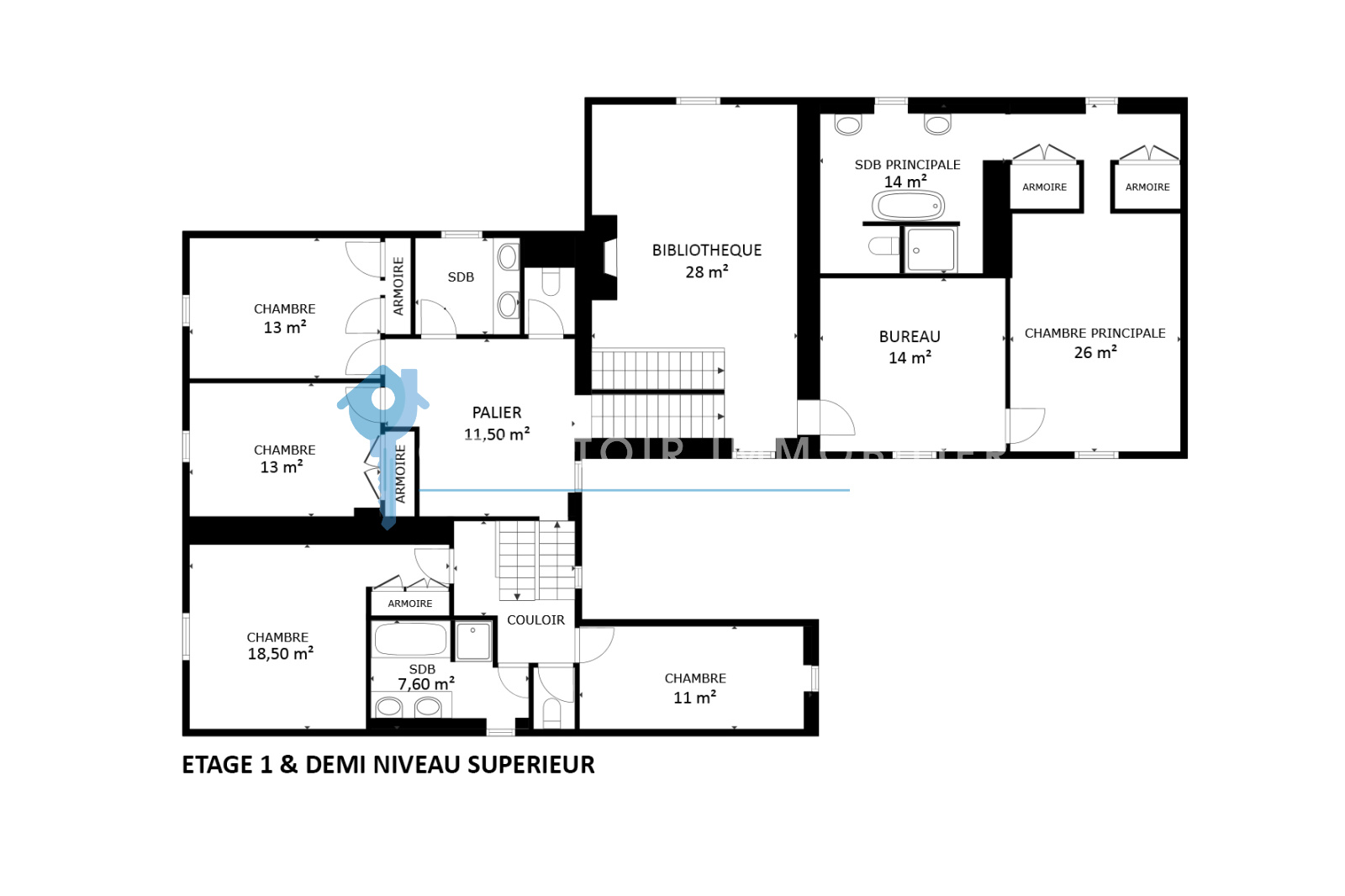 L’appartement de maître avec bureau, chambre, salle de bain complète et dressing.