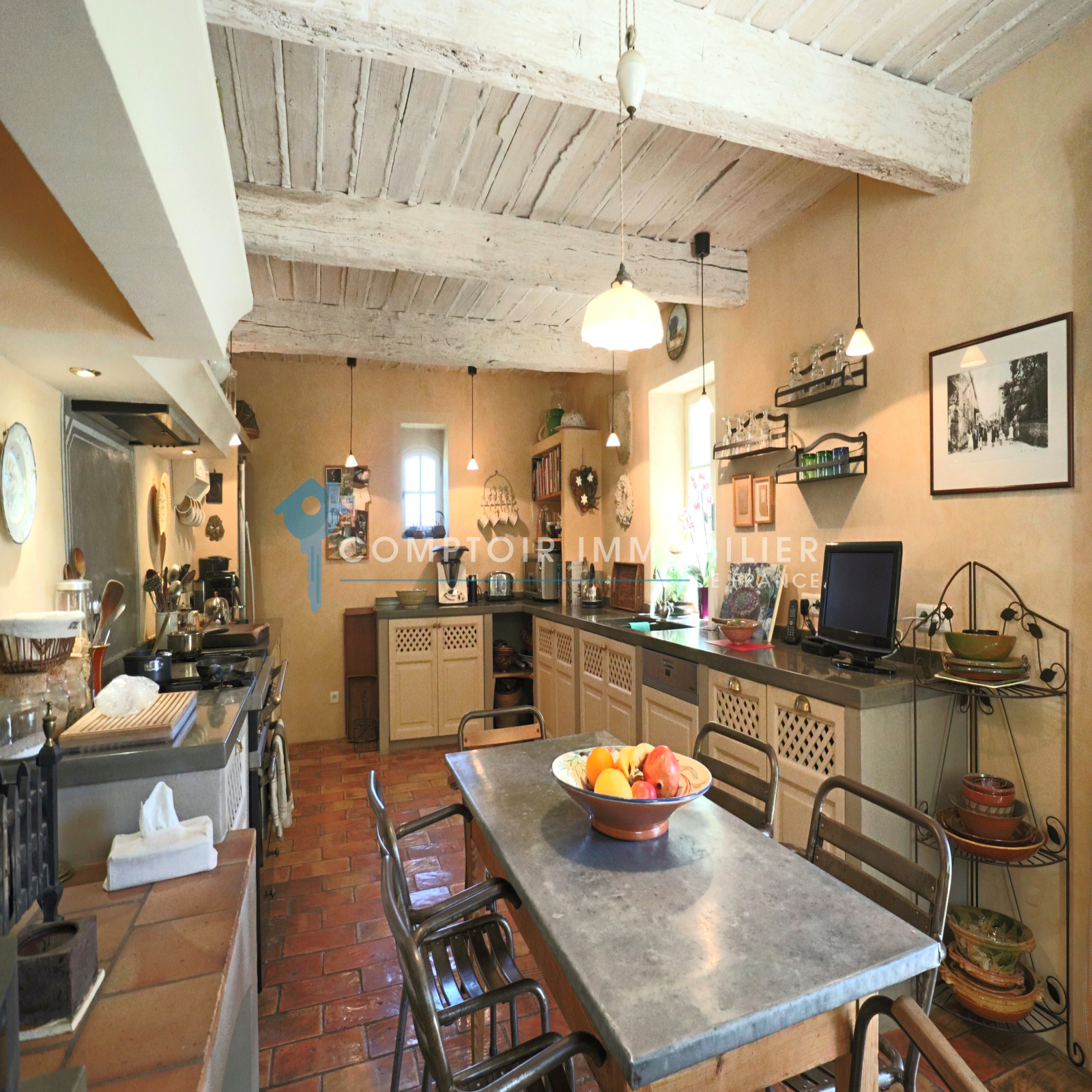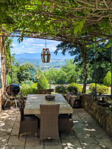 Cuisine entièrement équipée et aménagée s’ouvrant sur une terrasse sous treille à l’est et profitant de l’ombre d’un majestueux tilleul,