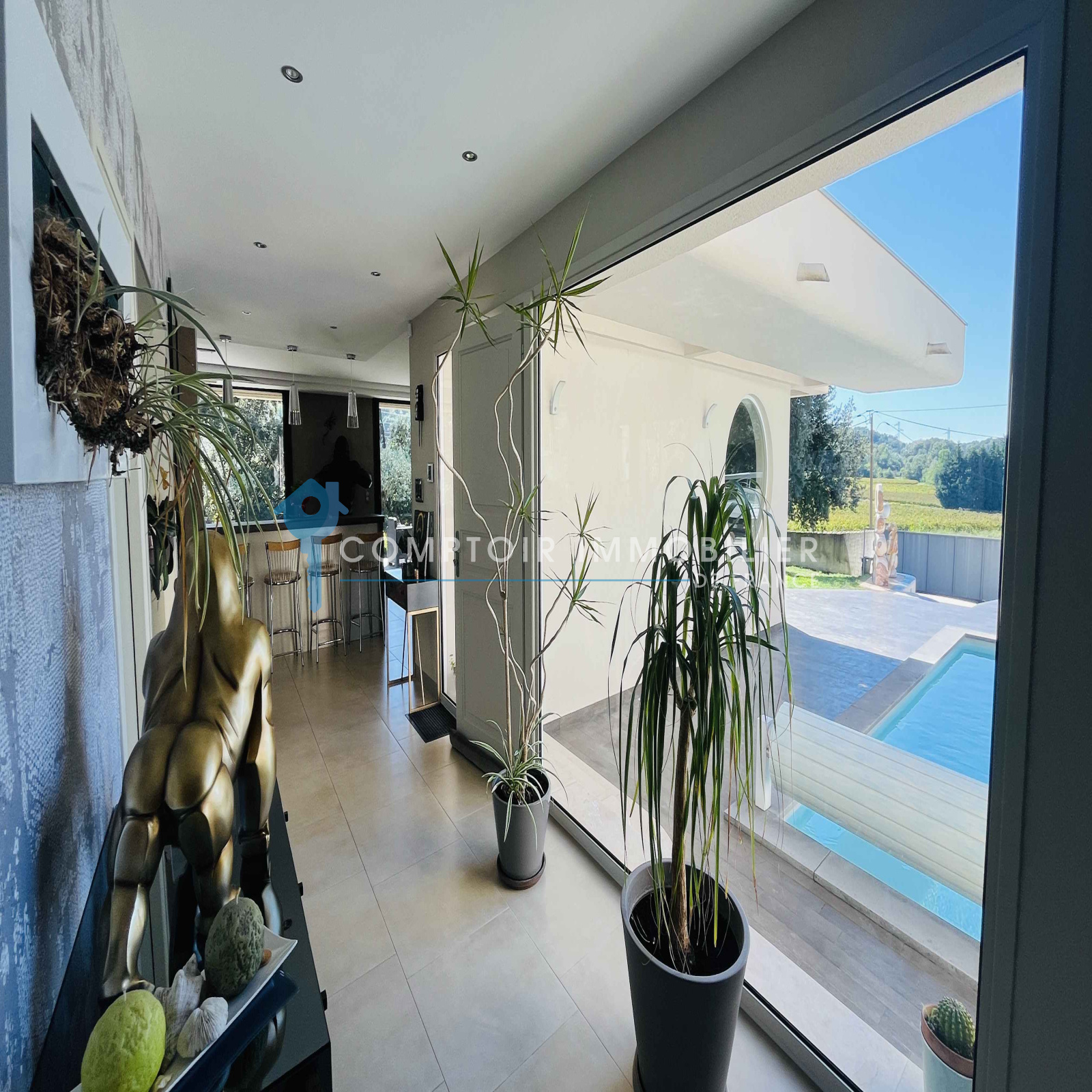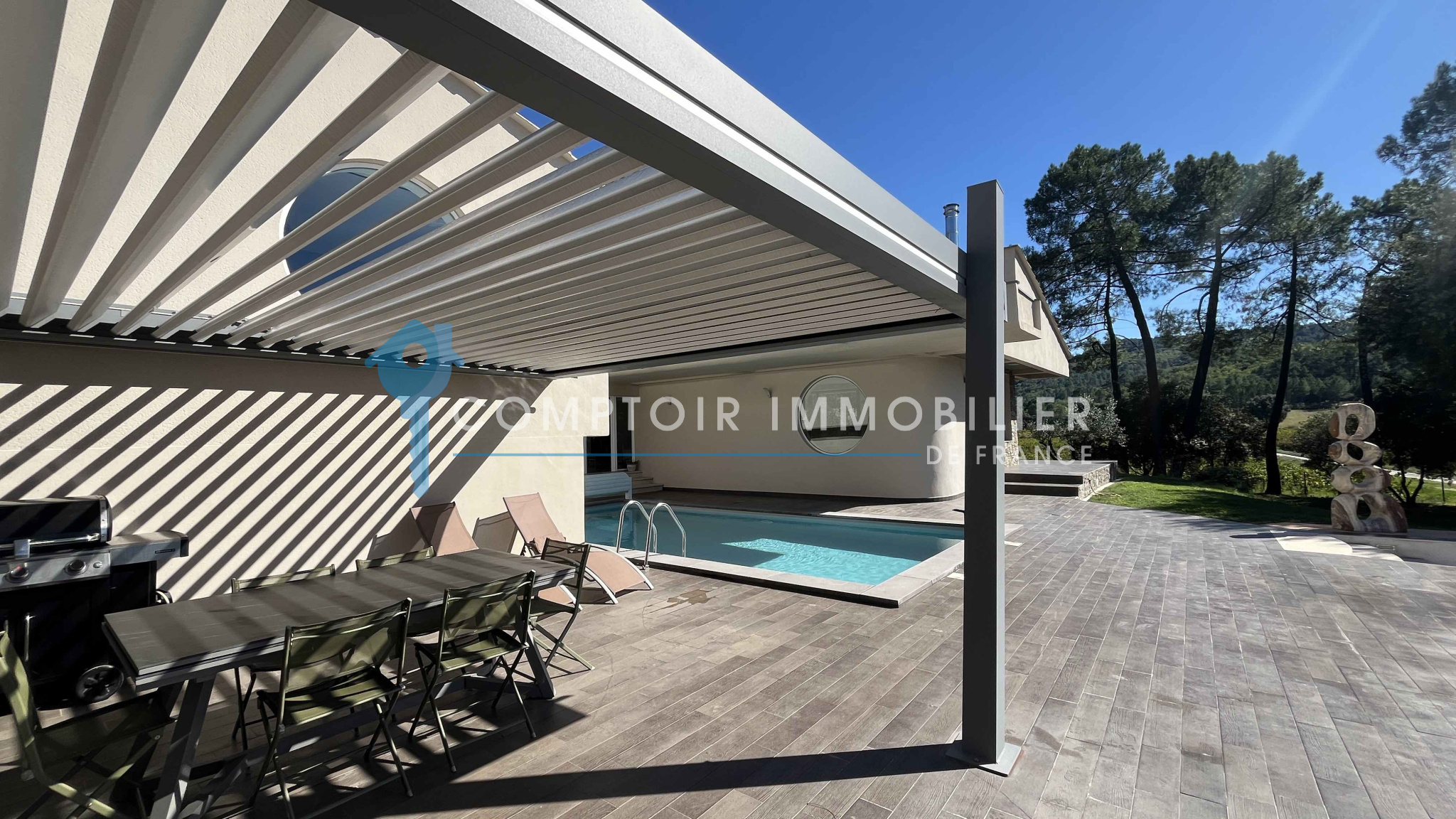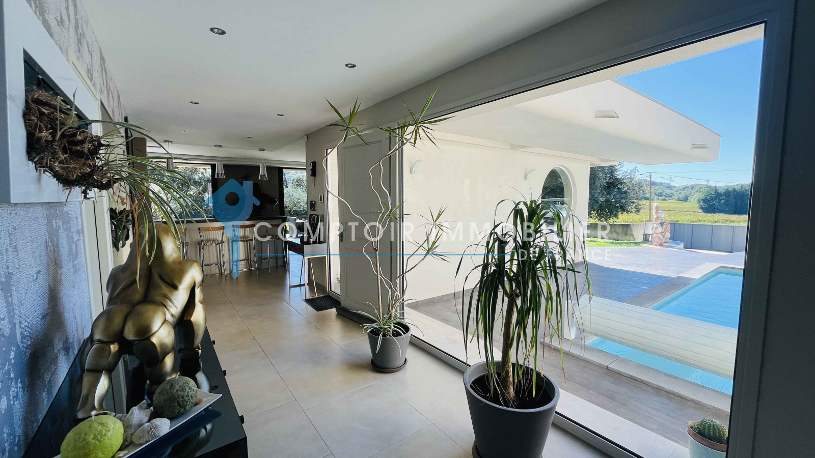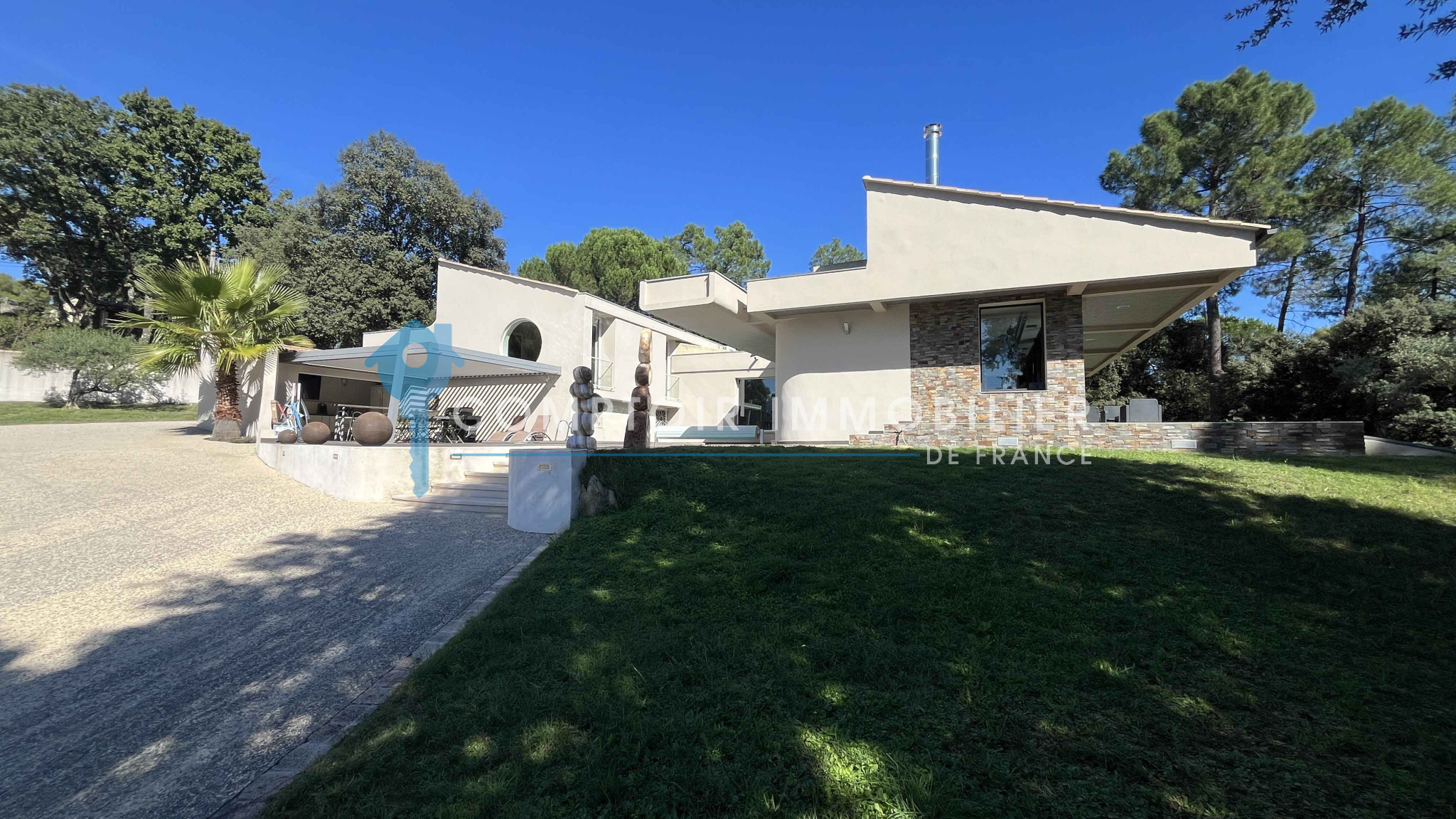 En bordure de la vallée de la Cèze et ses villages classés : Villa atypique, offrant un art de vivre paisible et raffiné. Signée d'un architecte, de style contemporain de grand standing, elle se niche au cœur d’un immense parc boisé de presque 7000 m2, parfaitement entretenu. Dès l’entrée, vous serez séduits par les volumes généreux offrant plus de 250m2 habitables, avec une luminosité exceptionnelle qu’offrent les larges baies vitrées ouvertes sur la nature. La villa se compose de 4 chambres spacieuses, dont une suite parentale avec dressing et salle d'eau privative avec patio zen. Une salle de bain et 2 wc viennent compléter ses prestations. Le vaste espace de vie et son poêle à bois chaleureux s’ouvre sur une superbe terrasse menant à la piscine et à son pool house, invitant à la détente et à la convivialité. En souplex vous attendent pour votre bien être, une salle de sport de grand volume et une buanderie. Les prestations sont de très belles factures : Architecture contemporaine et lignes épurées, Vue dégagée, Garage de 70m2 (transformable en habitation) et double carport, Climatisation réversible par pompe à chaleur, domotique, et finitions haut de gamme, Un espace extérieur clôturé de plus de 6700m2 avec tennis. Un bien rare où confort moderne, esthétique et cadre naturel se conjuguent à la perfection. Localisation : en campagne à proximité des commodités et des axes principaux (30 mn environ A9 et A7. Un Bien d’exception.