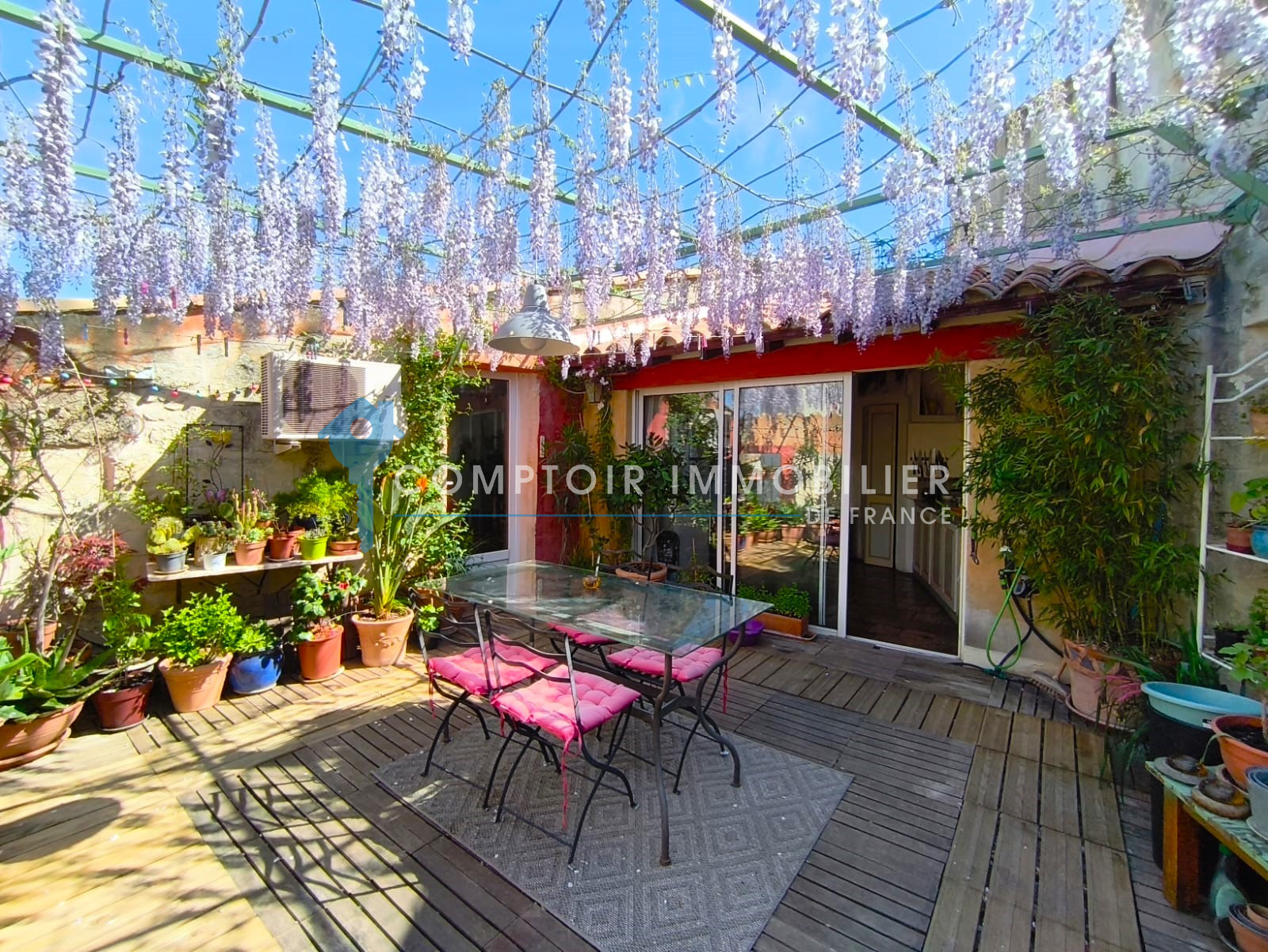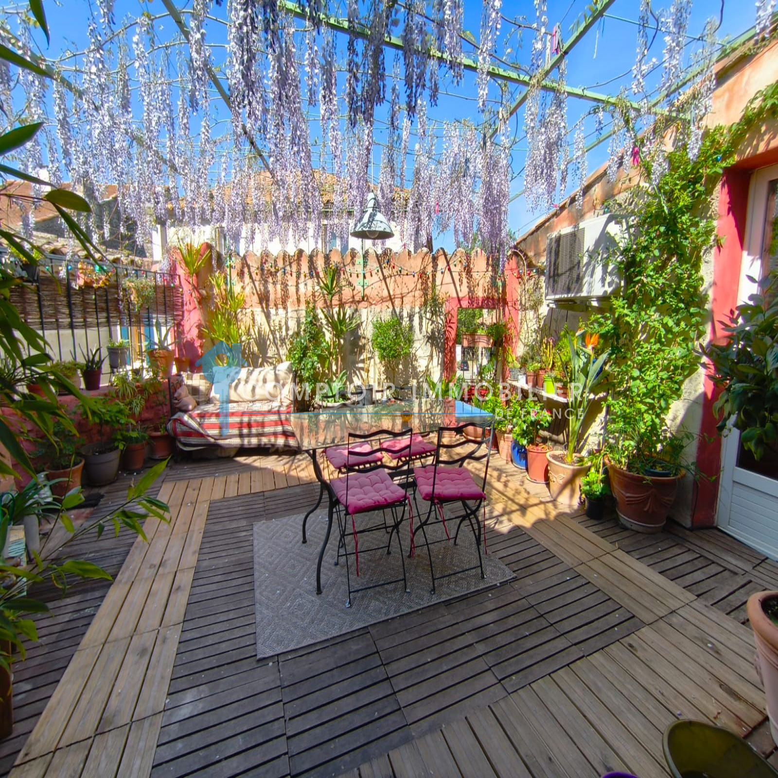 - Une terrasse ensoleillée offrant un espace extérieur privilégié pour vos repas, moments de détente et soirées conviviales avec vue sur les toits du village.