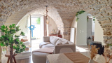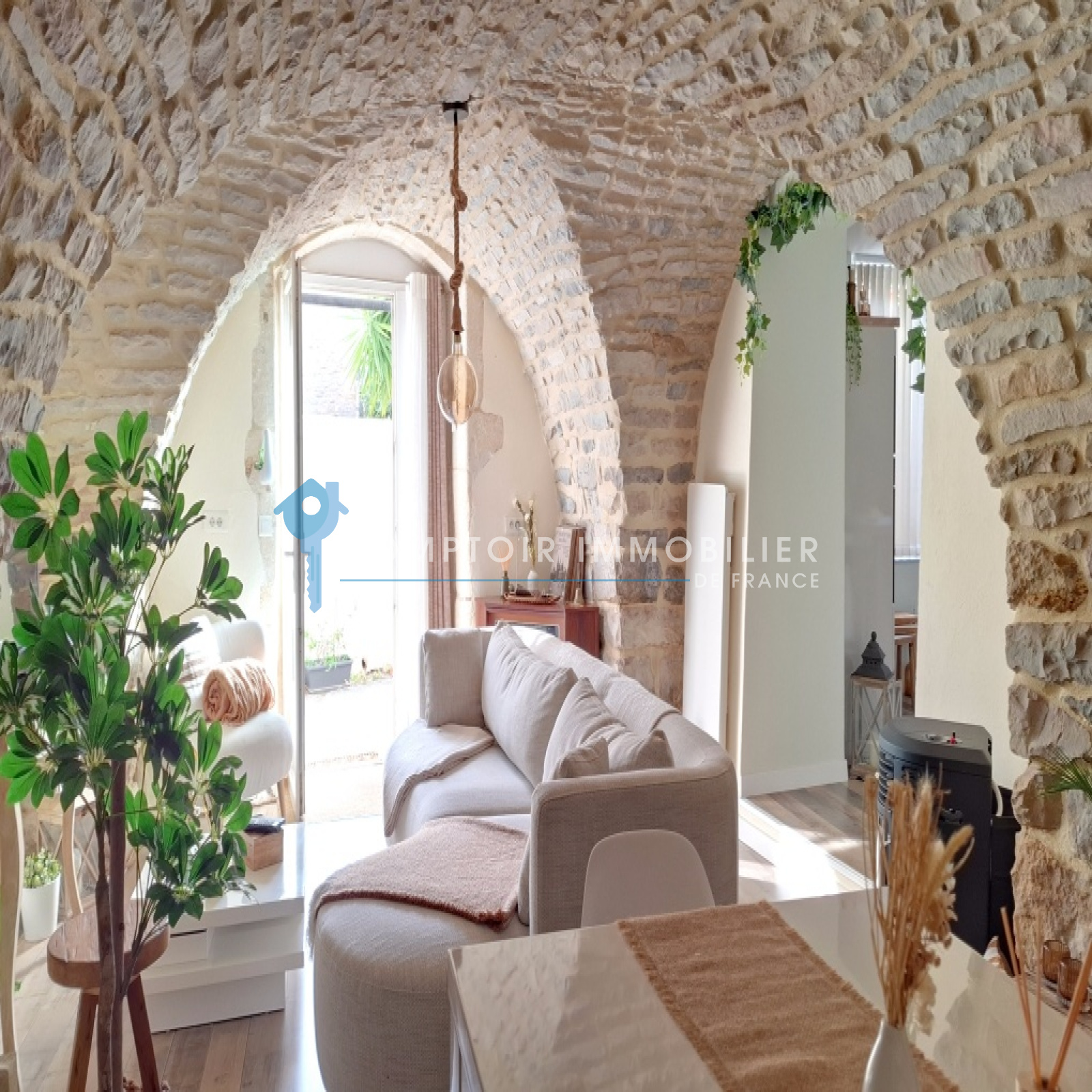 L'entrée s'ouvre sur une pièce de vie au charme authentique avec ses plafonds en pierre vouté, une cuisine moderne entièrement équipée ainsi qu'un wc.