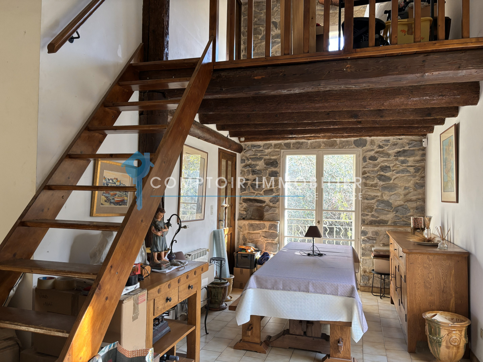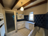 En RdC il y a le garage et le sous sol totalisant environ 80m2. Un escalier vous mène à l'habitation qui est composée d'une entrée avec placards, un salon cathédrale avec cheminée, murs en pierre, ouverture menant à la terrasse donnant sur le jardin. La mezzanine du salon donne accès aux combles. La cuisine équipée est séparée mais peut être ouverte côté salle à manger. Le couloir dessert 3 chambres, la salle de bain avec douche et baignoire, toilette.