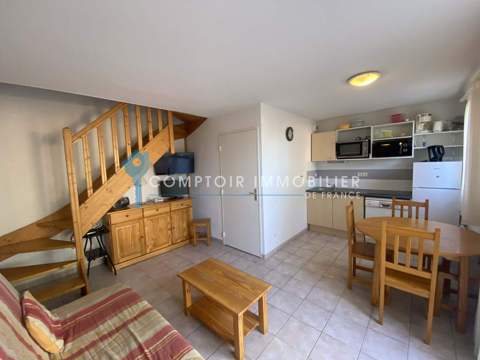 - Au rez-de-chaussée : Un salon lumineux avec kitchenette équipée, un WC indépendant avec placard.