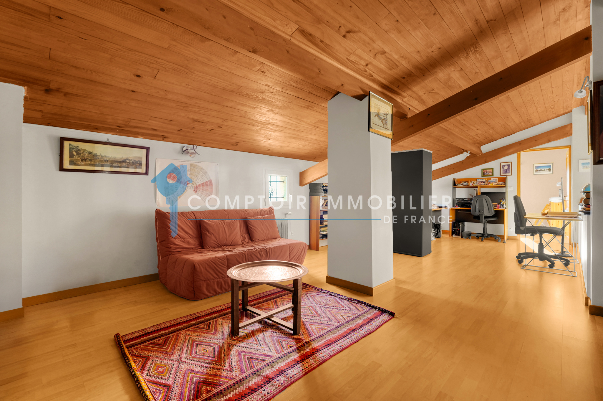 Une mezzanine aménagée de 35 m² intégrant un bureau et une chambre supplémentaire, idéale pour un espace de travail, lecture ou suite d’adolescent