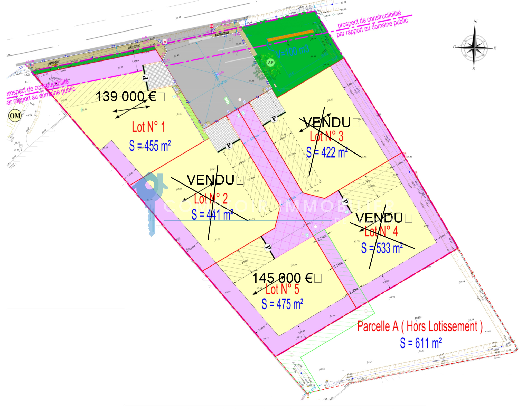 - Lot 5 - 475 m² - Surface de plancher maximale 200 m² - emprise au sol 150 m² - Prix 145 000 €