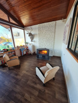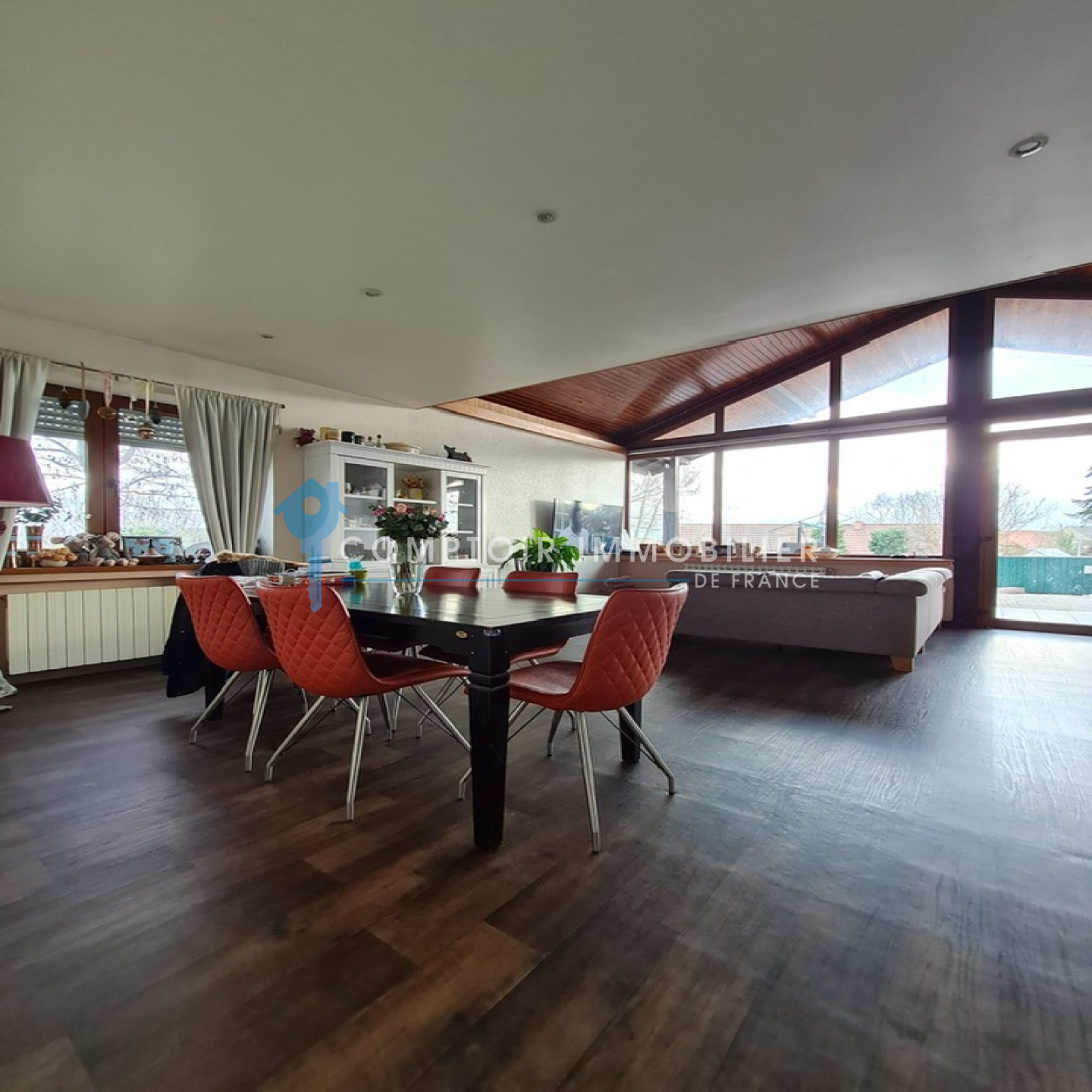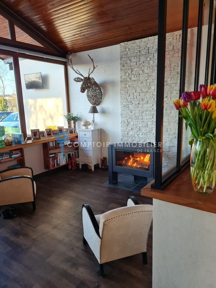 Entrée, vaste pièce de vie lumineuse avec plafond cathédrale, salon cosy avec cheminée cuisine équipée