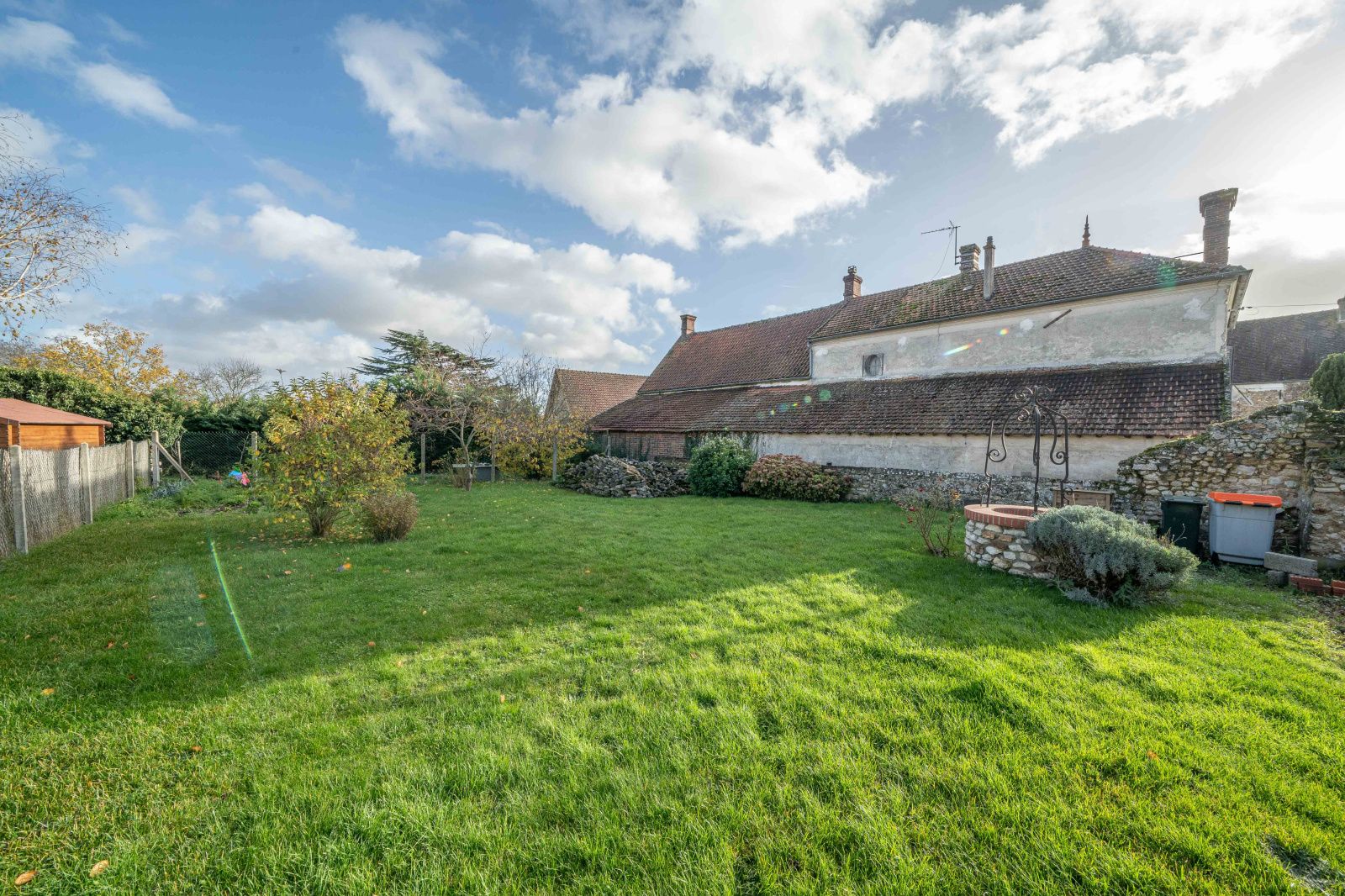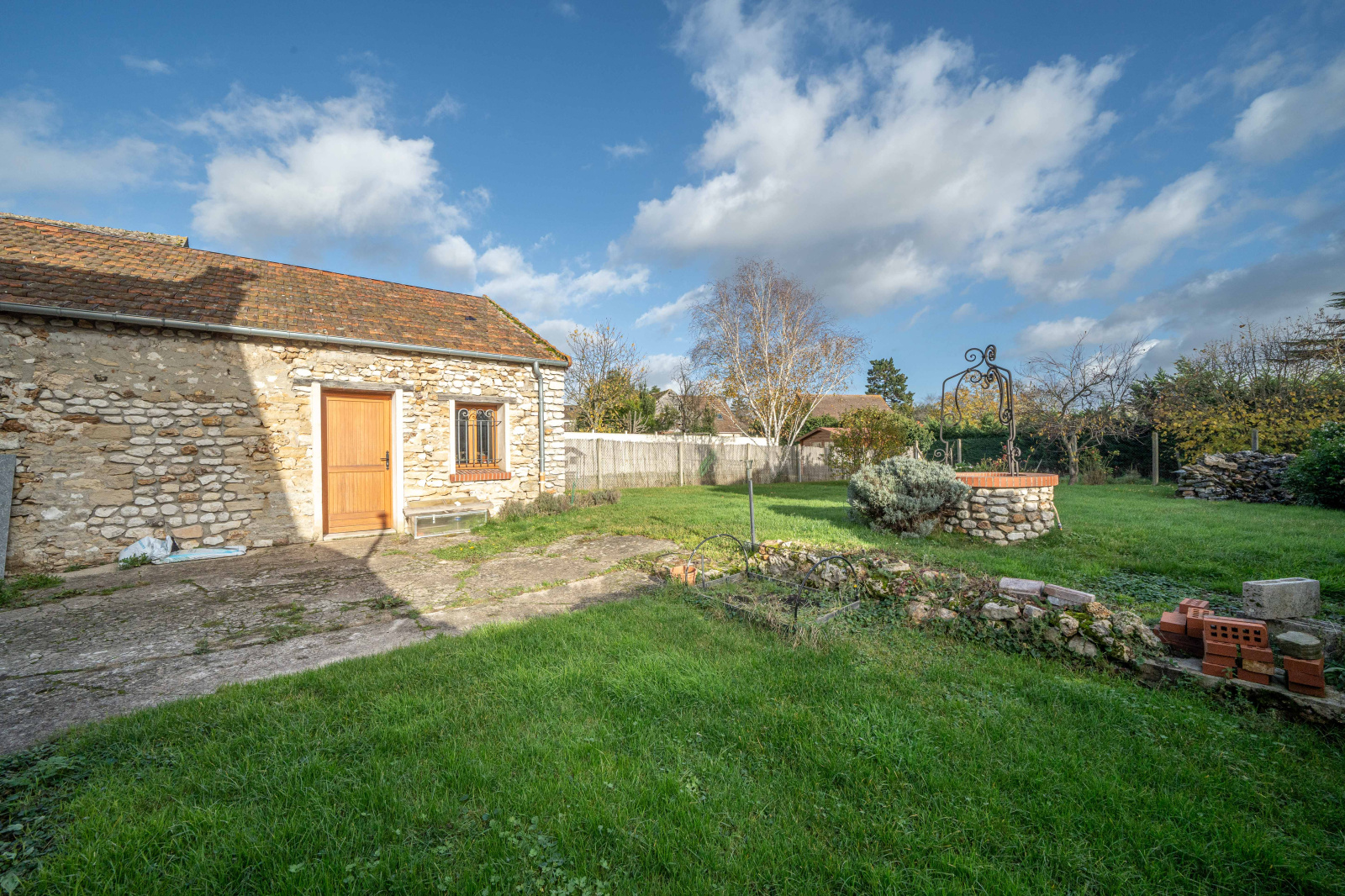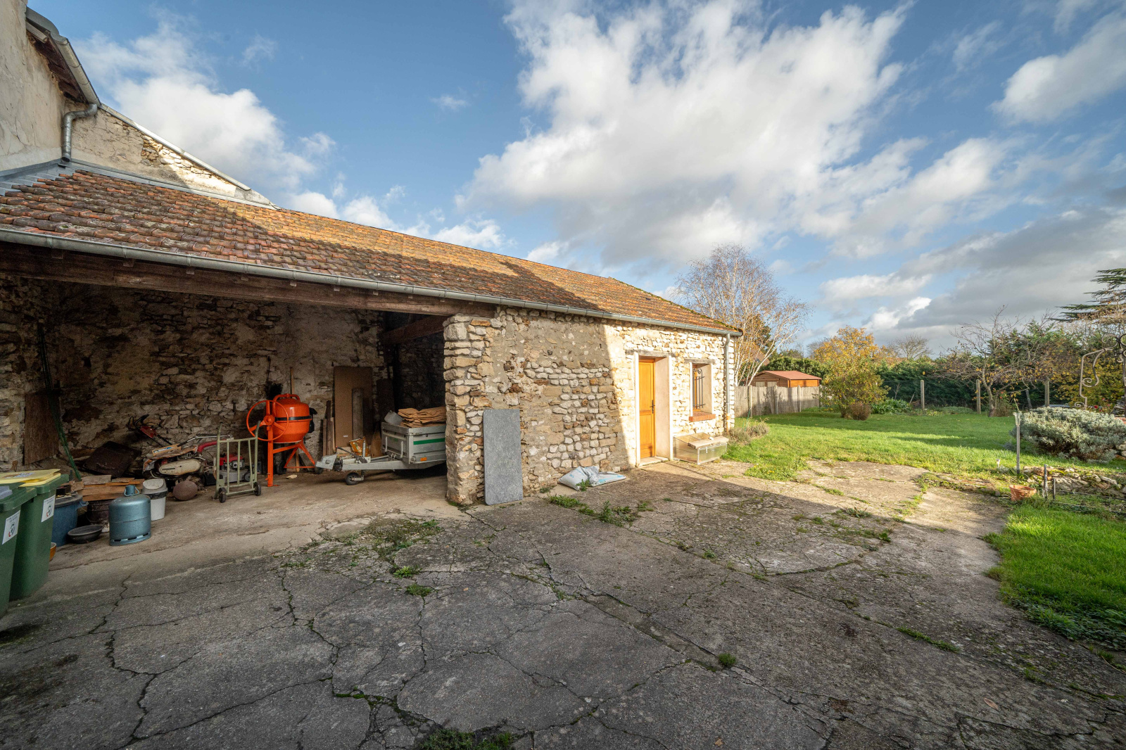 Jardin clos avec un atelier et un auvent pour voitures.