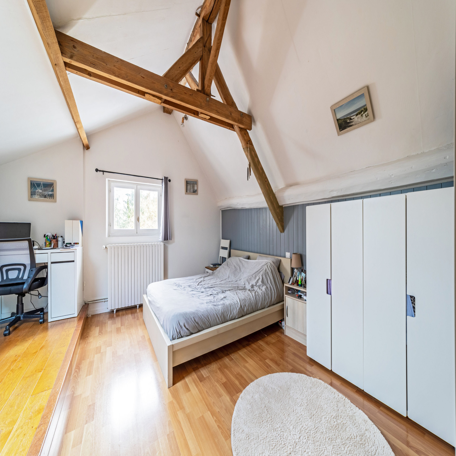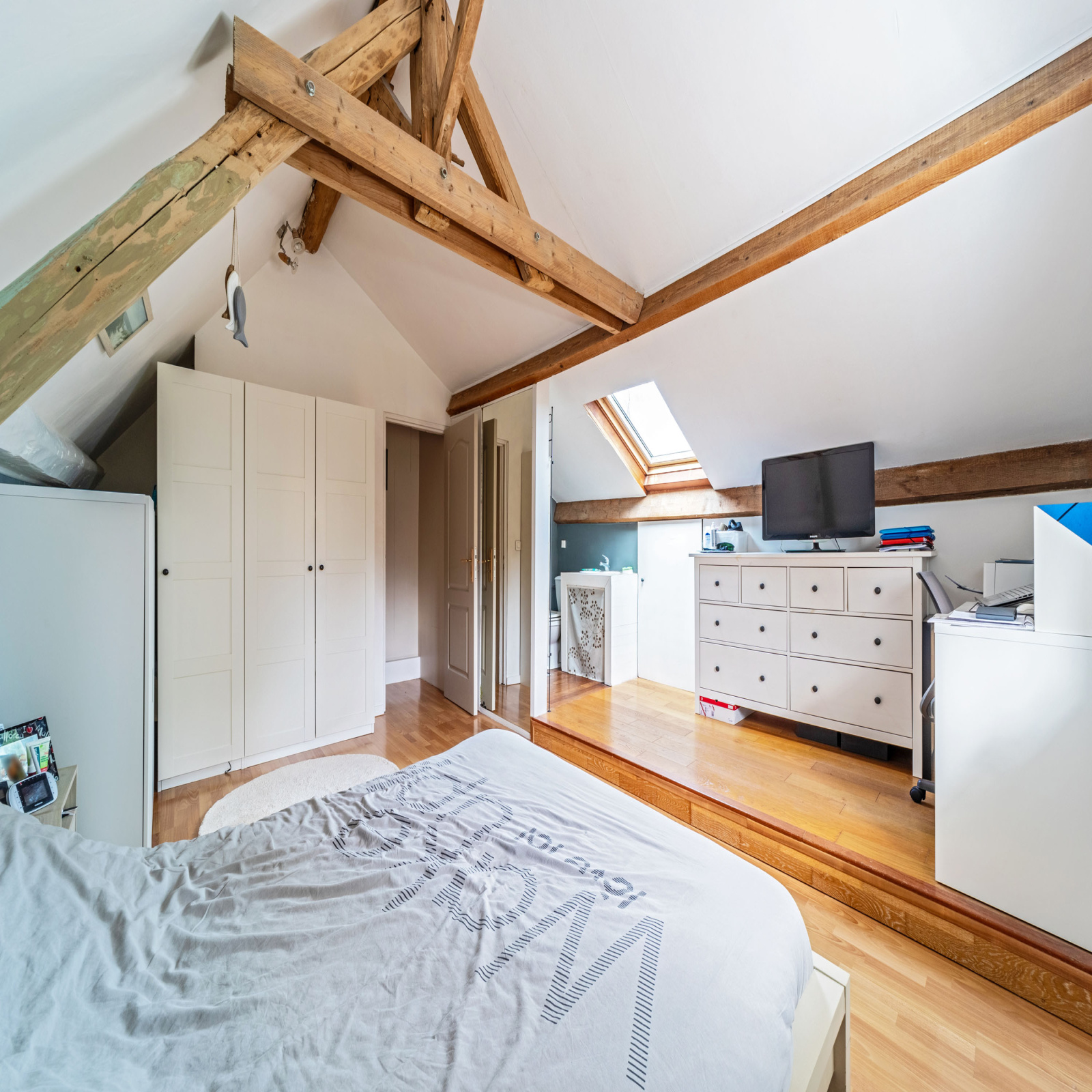 A l'étage, une chambre avec une salle de douche et un WC.
