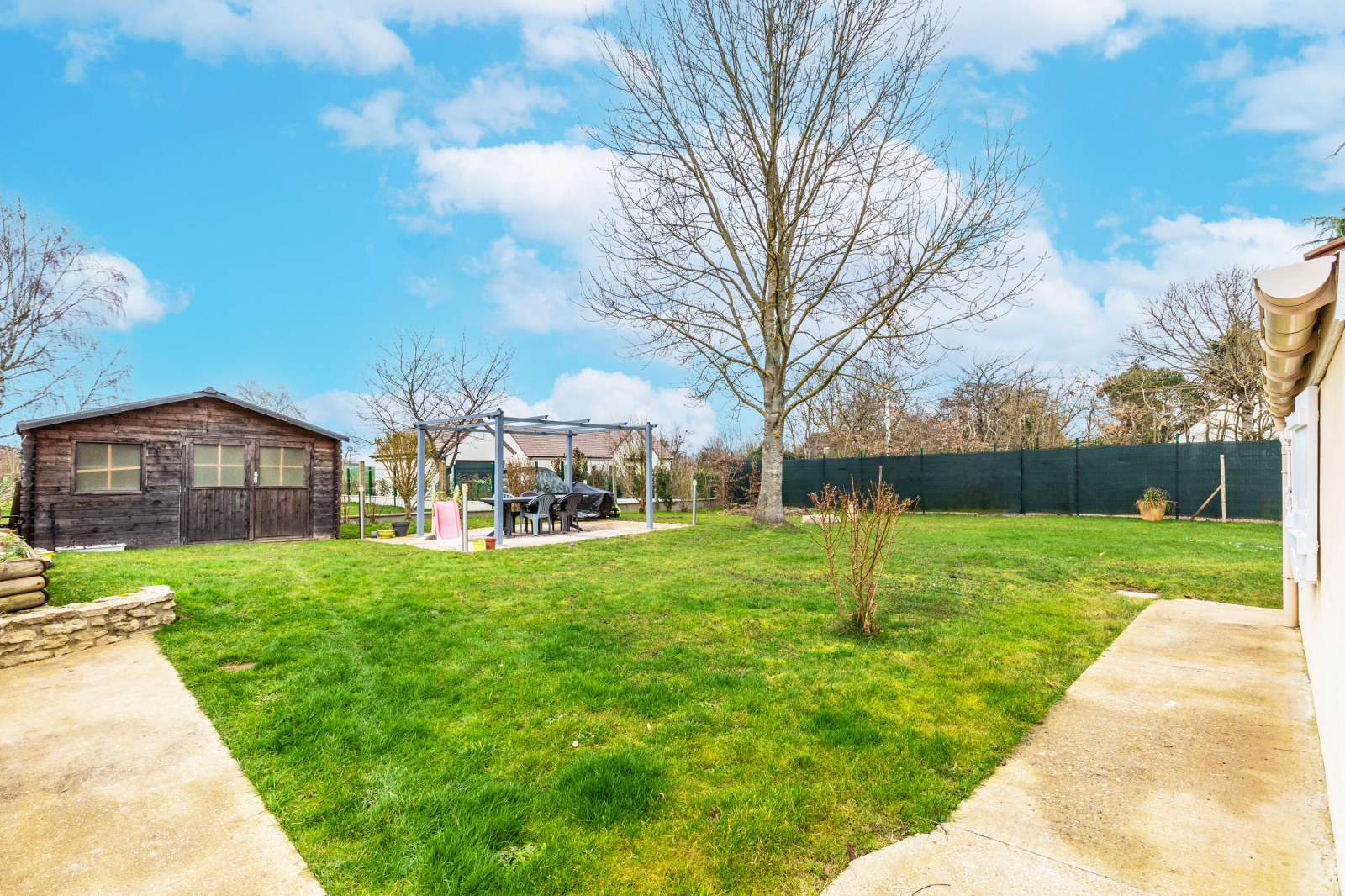 Jardin clos avec terrasse et une cave.