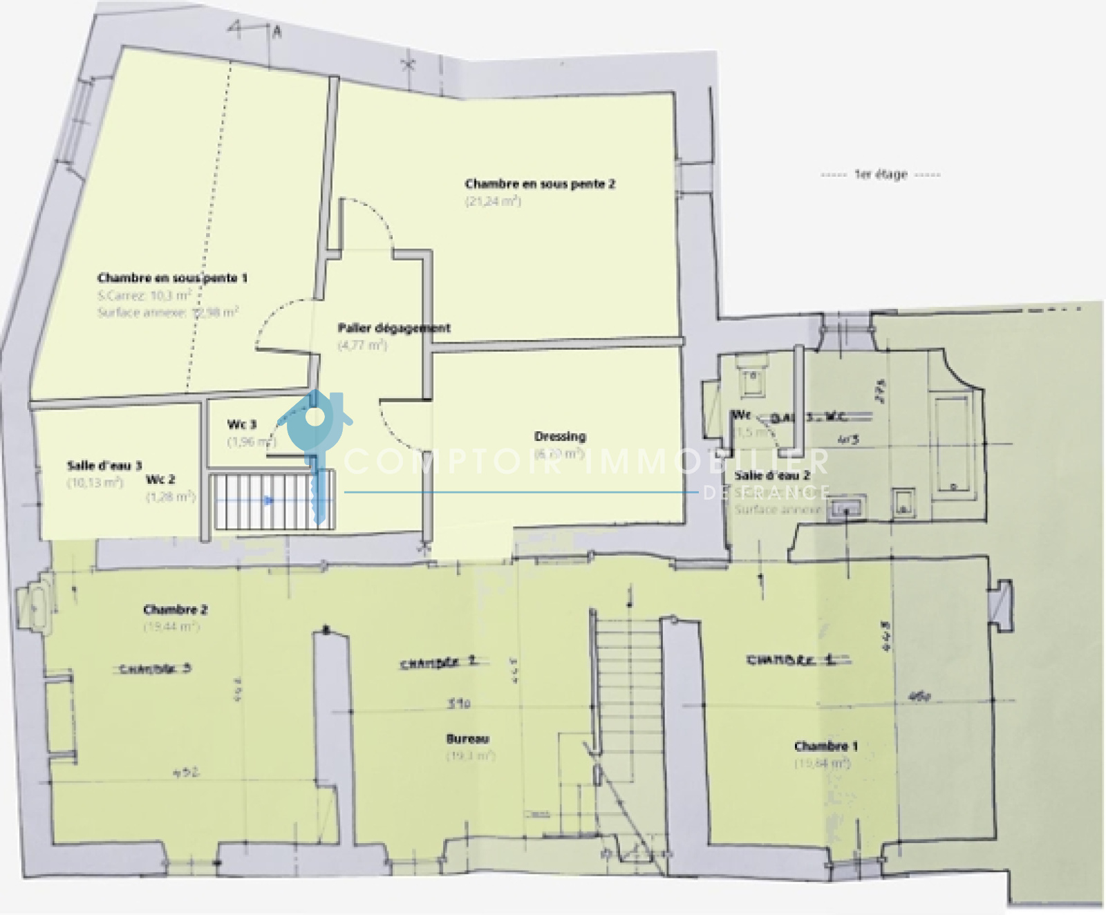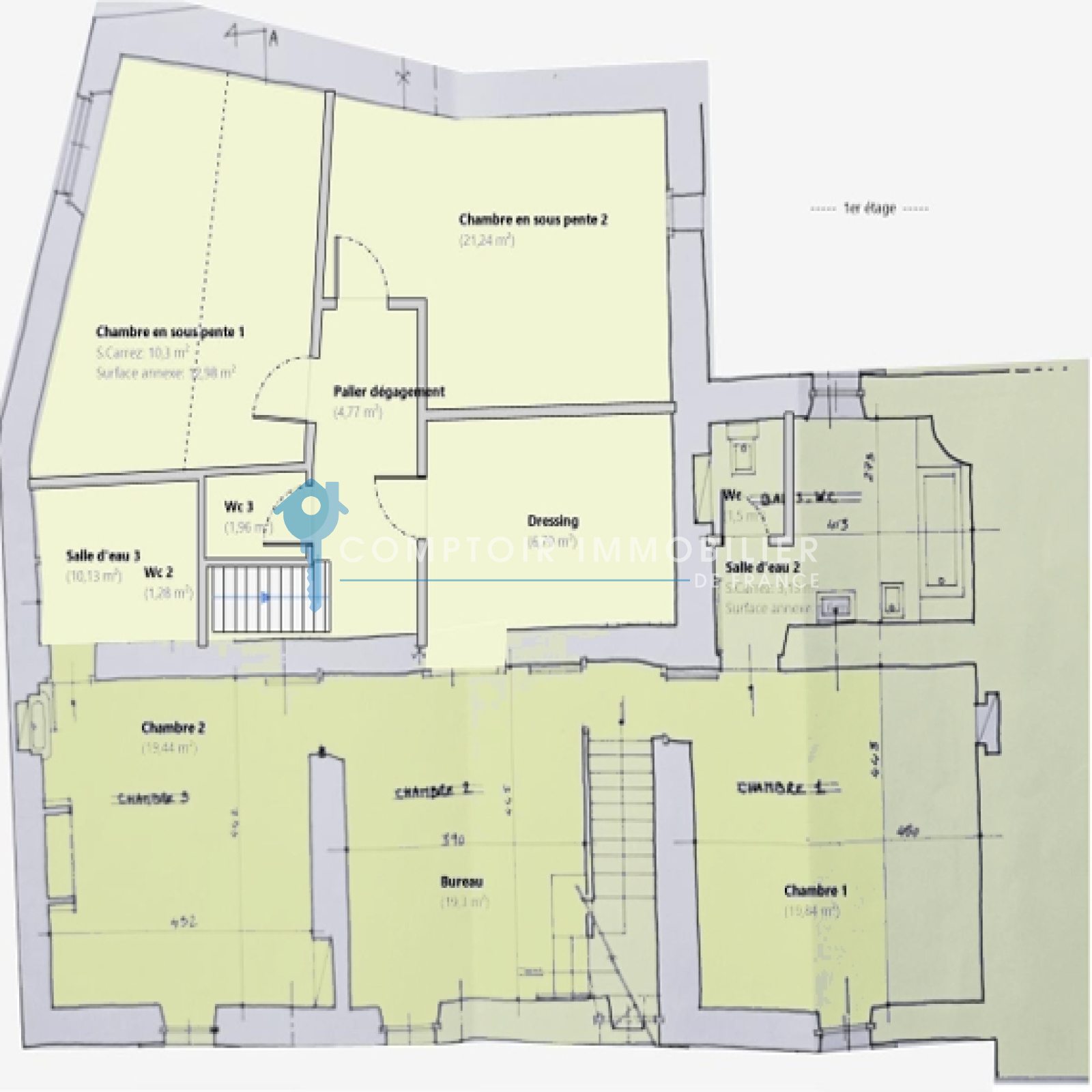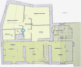 Premier étage : 4 chambres spacieuses (environ 20 m² chacune) : lumineuses, conservant le charme des pierres et poutres apparentes, Salon TV / bureau (20,46 m²) : espace polyvalent pour la lecture, le travail ou la détente, 2 salles d’eau avec WC (7,22 m² et 11,20 m²), 1 WC indépendant(1,92 m²).