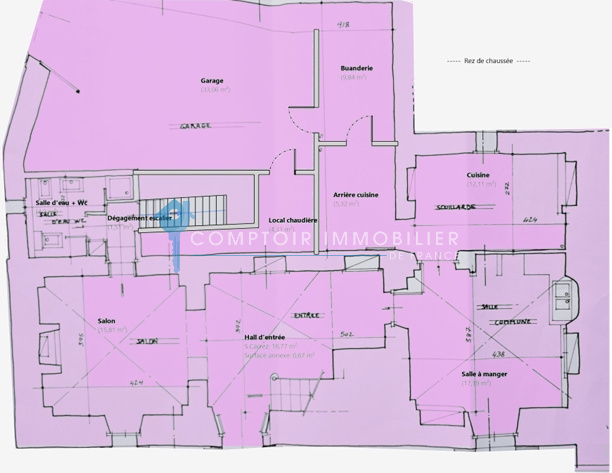 Rez-de-chaussée : Entrée (19,98 m²) : spacieuse et accueillante, menant naturellement aux pièces de vie, Salon (17,07 m²) : lumineux et confortable, offrant une belle fluidité entre les espaces, Salle à manger (16,43 m²) : conviviale, parfaite pour les repas en famille, attenante à la cuisine principale (11,26 m²) : fonctionnelle et bien agencée avec accès à une arrière-cuisine (5,87 m²), Local technique (9,88 m²) : abritant le chauffage, la buanderie et les installations, Salle d’eau avec WC (4,19 m²) : idéalement située au rez-de-chaussée et un Garage (32 m²) : vaste espace pour véhicule et rangement, avec accès direct à la maison et stationnement privé.