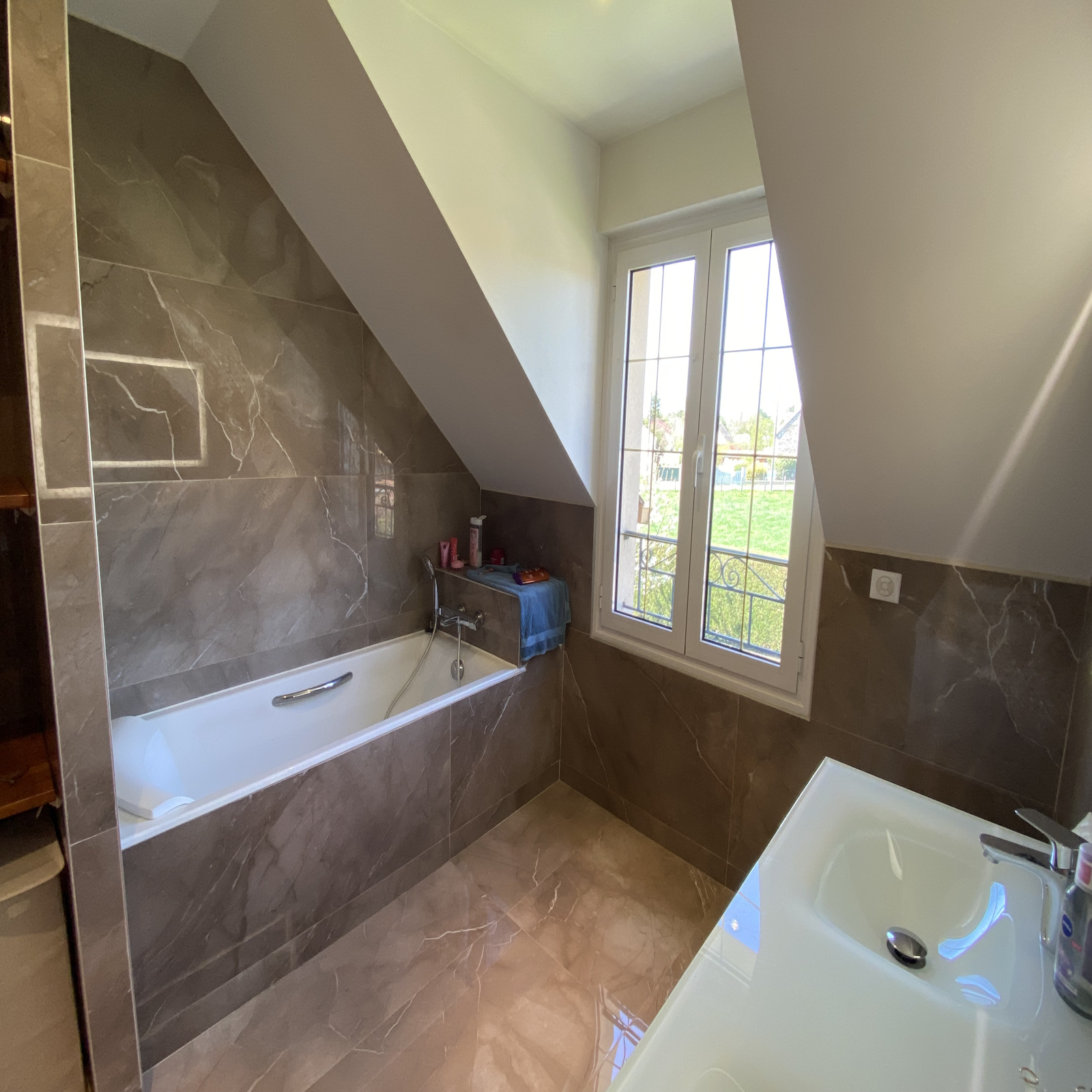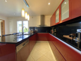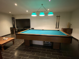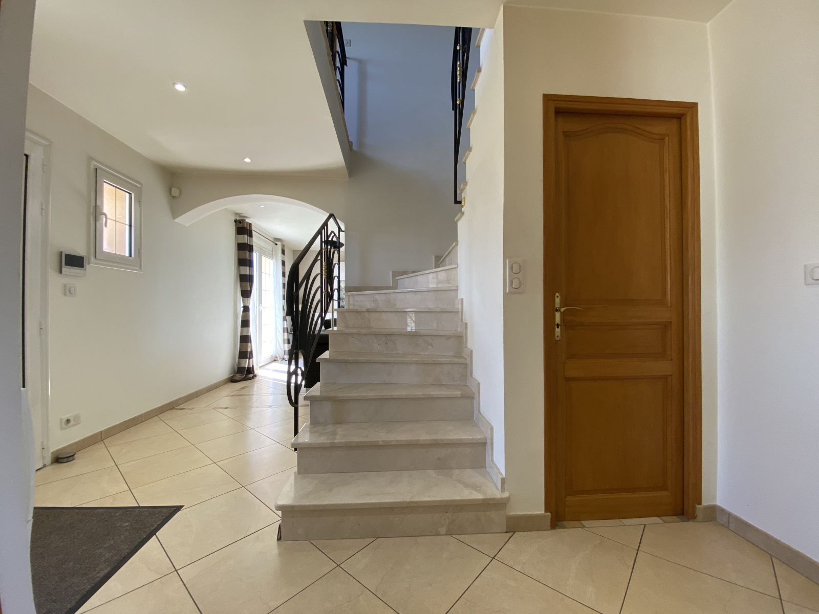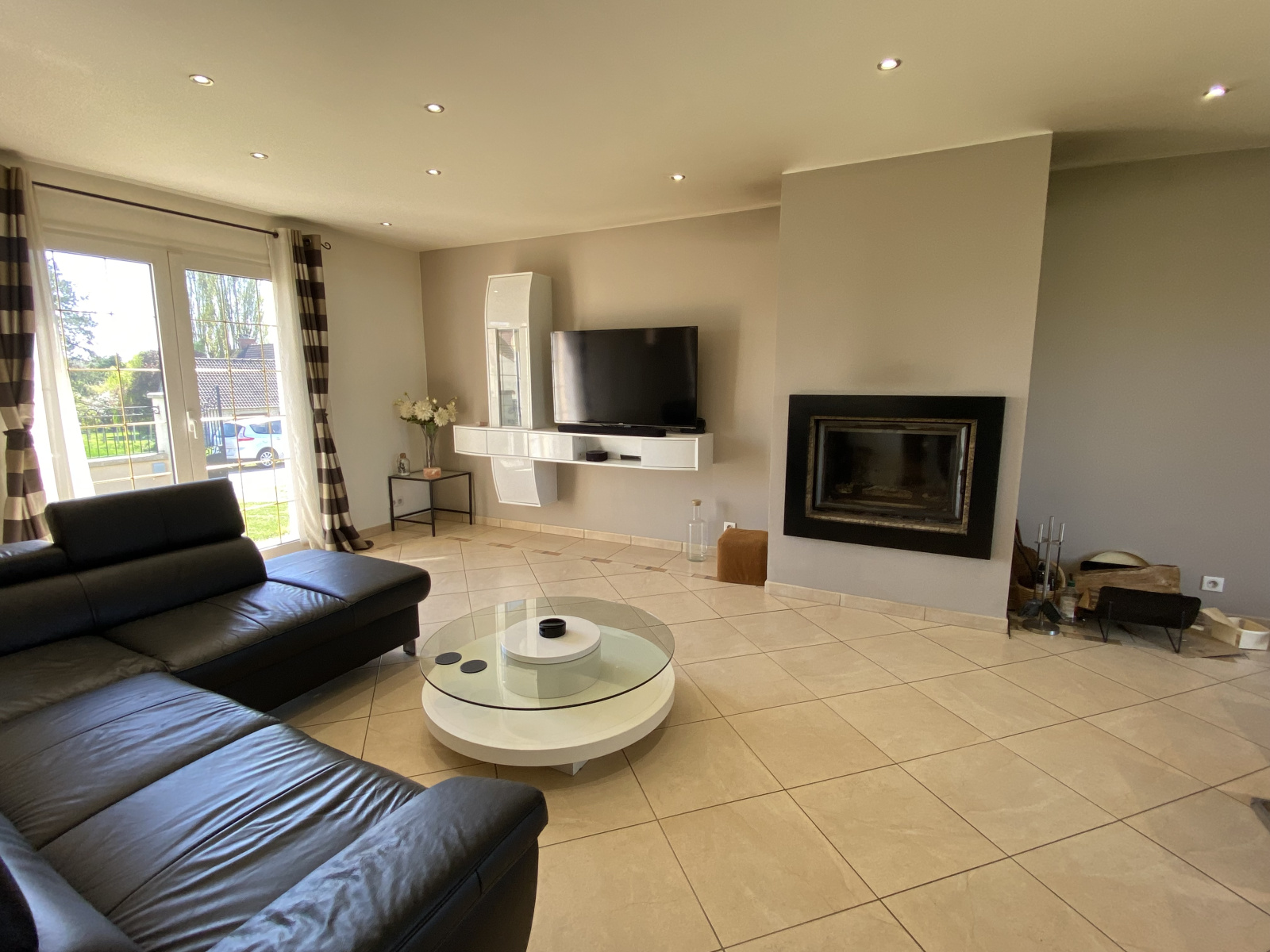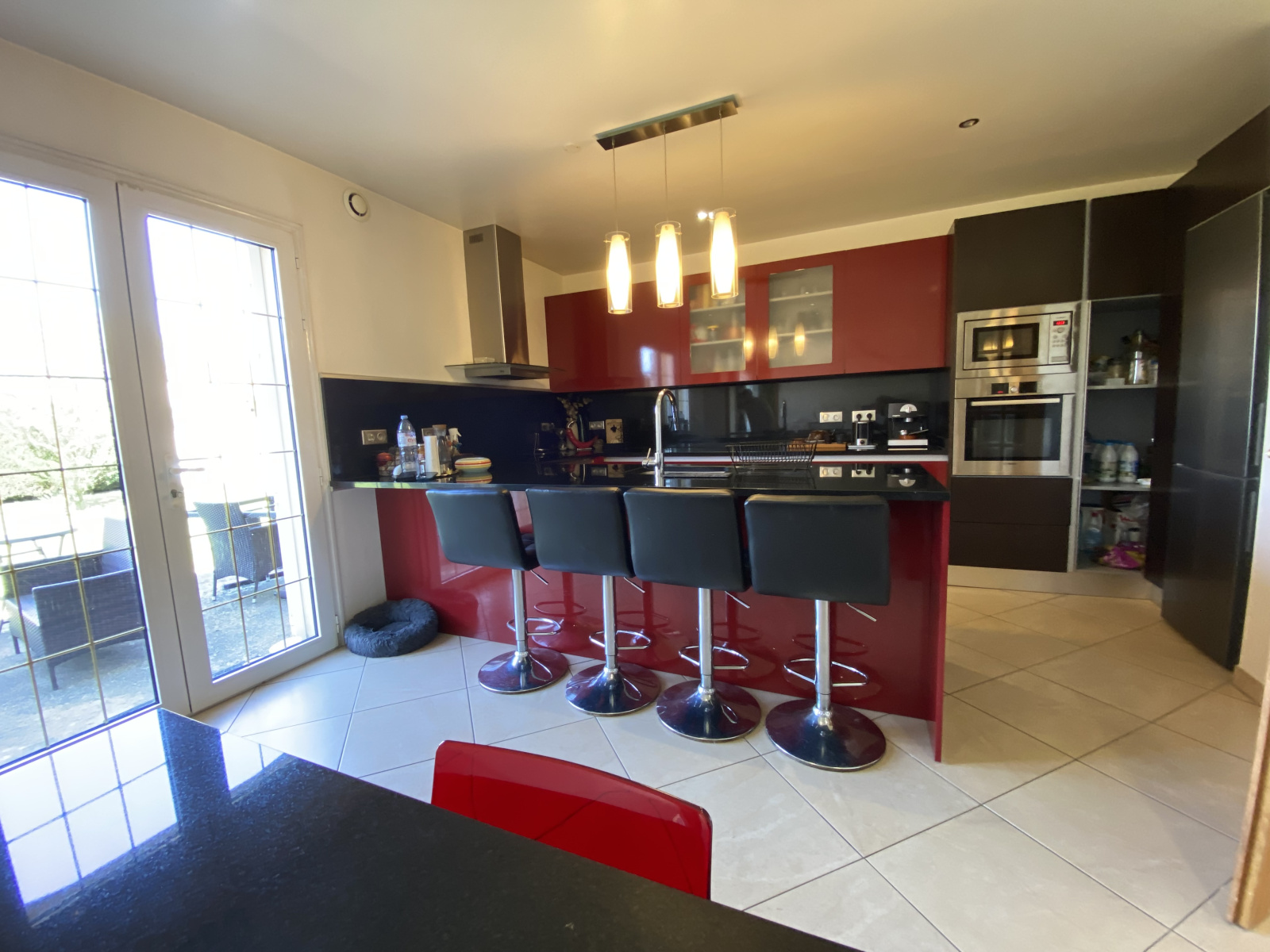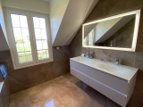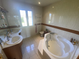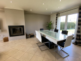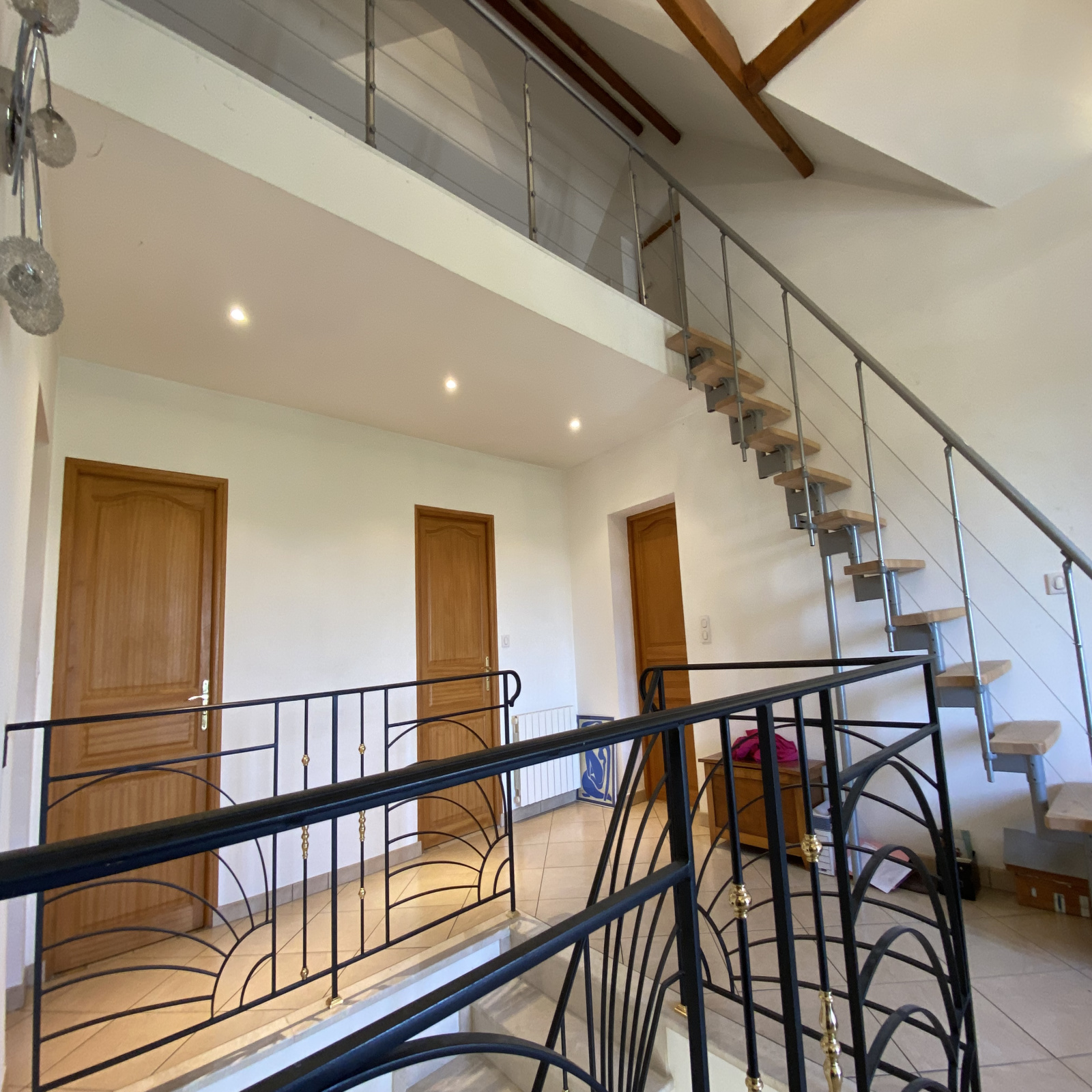 À l'étage : une mezzanine de 23 m² avec belle hauteur sous plafond desservant 3 chambres avec placards dont une suite de 23 m² avec son dressing et sa salle-d'eau, une salle-de-bains/douche en marbre et un wc/lave-mains. Un sous-sol total: double garage motorisé, salle de jeux-cinéma, buanderie et cave.