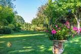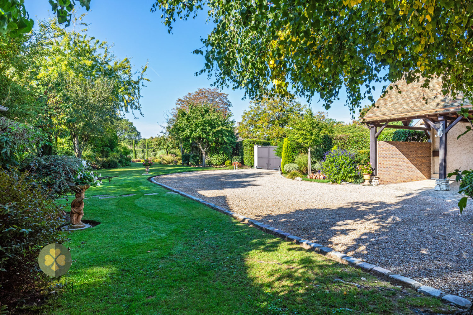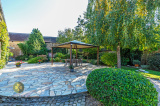 Extérieur : Charretterie avec 2 emplacements voitures + prise recharge électrique auto, 2 abris de jardin dont un en briquettes et un autre en bois avec électricité, vaste terrasse avec pergola. Exposition Est-Ouest.