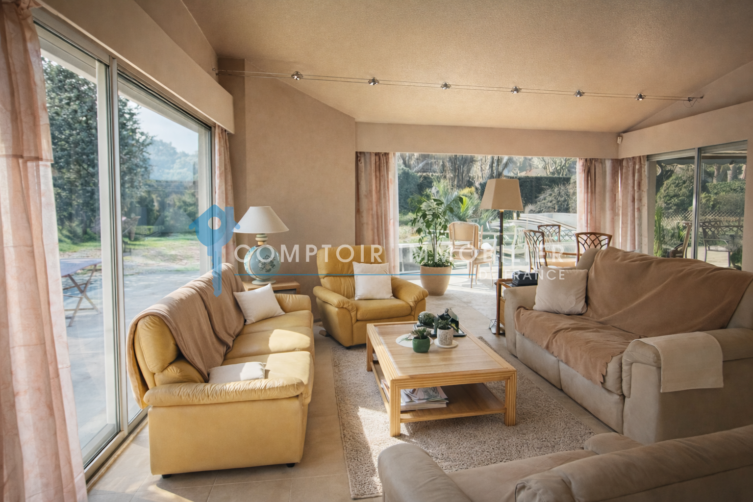 La pièce de vie, spacieuse et lumineuse, est sublimée par de larges baies vitrées ouvertes sur le jardin, les terrasses et la piscine chauffée et couverte, idéale pour en profiter toute l’année.