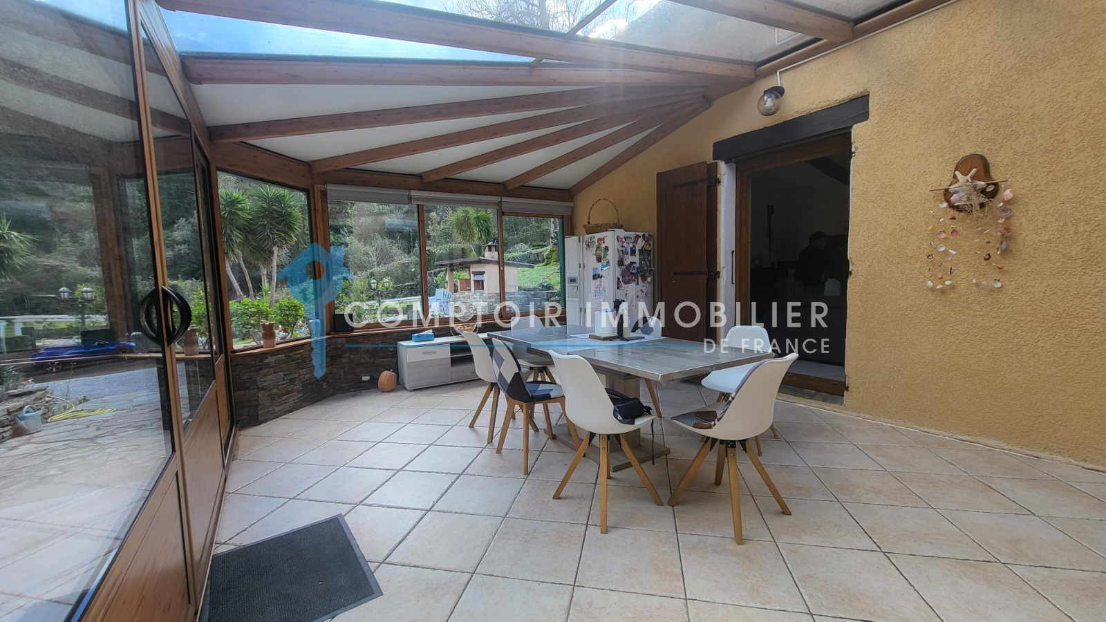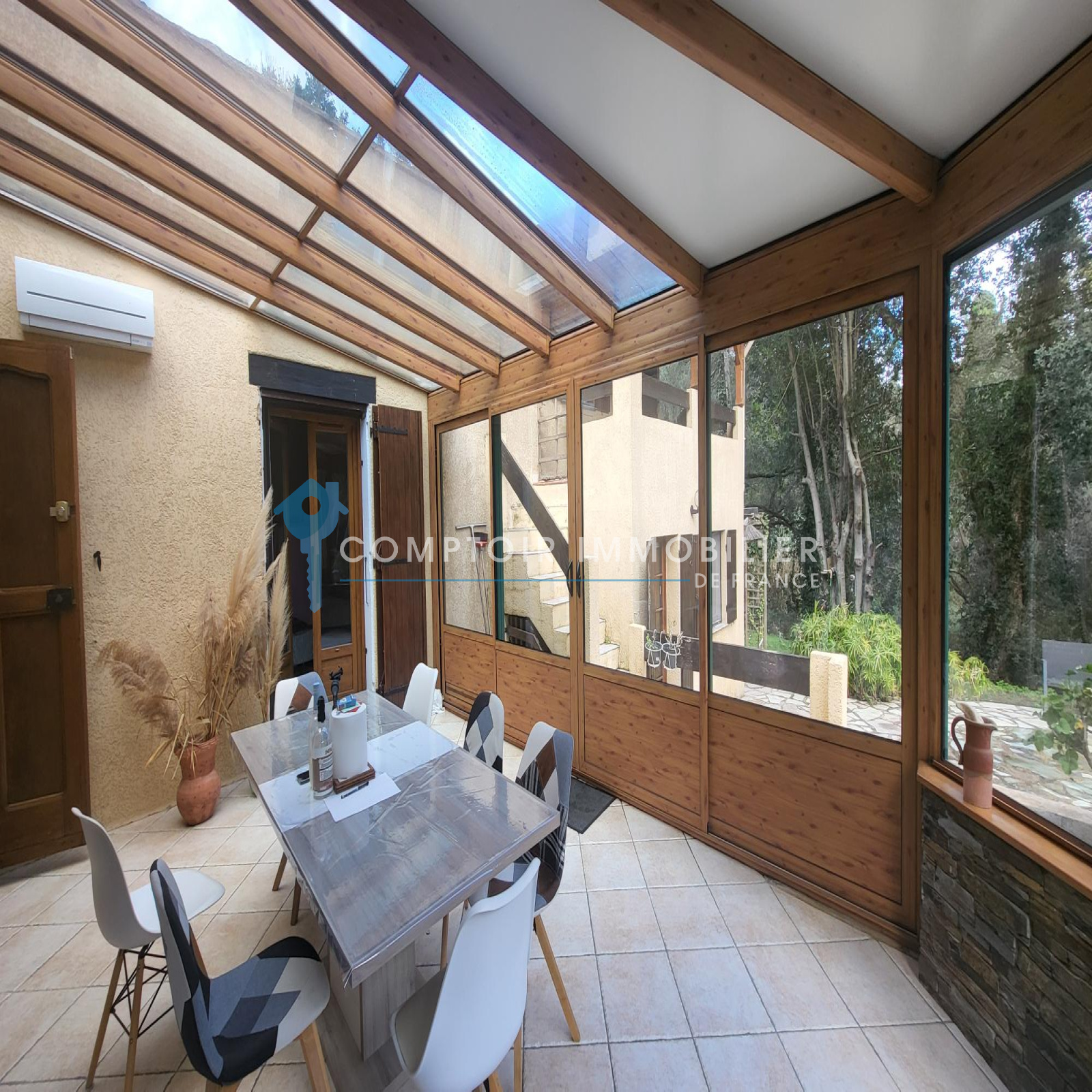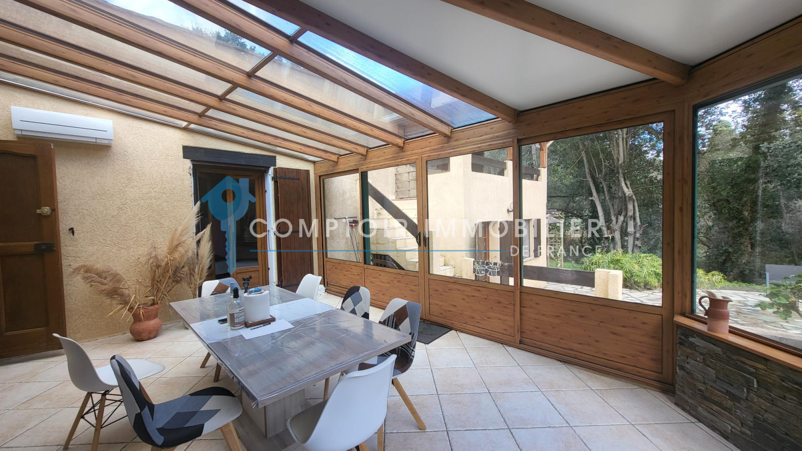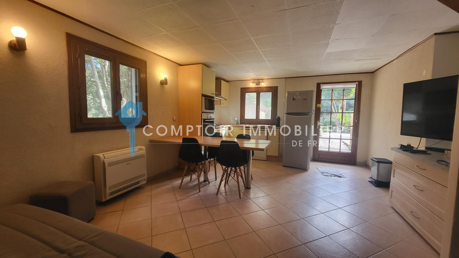 Le bien principal est composé d'une véranda lumineuse de 25 m² avec climatisation réversible, d'un salon séjour avec cuisine ouverte de 38 m² environ, d'une chambre ou bureau de 9 m², d'une 2 ème chambre avec placard dressing de 19 m², d'une salle de bain avec WC.