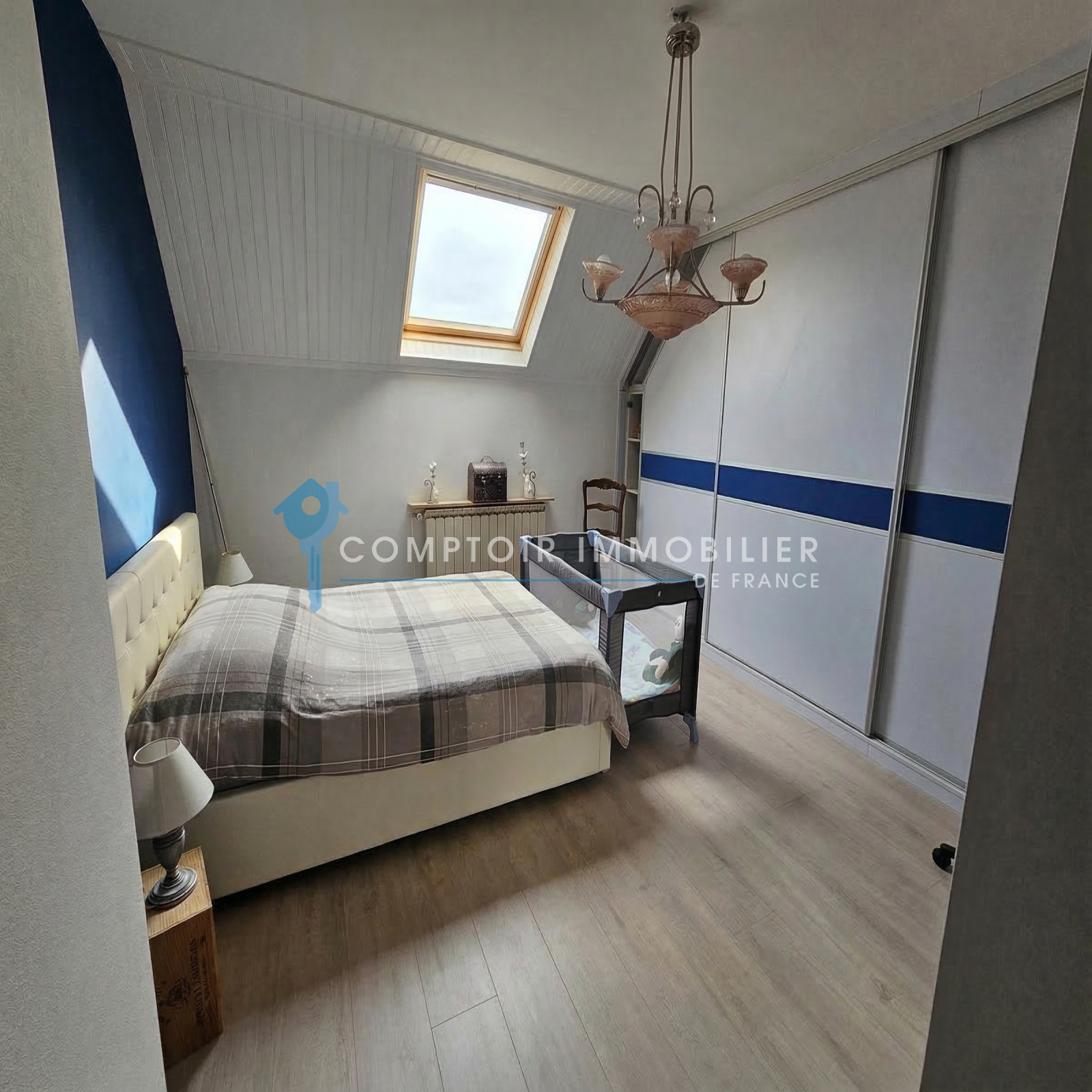 À l’étage, l’espace nuit se compose de trois belles chambres ainsi que d’une salle de bains.