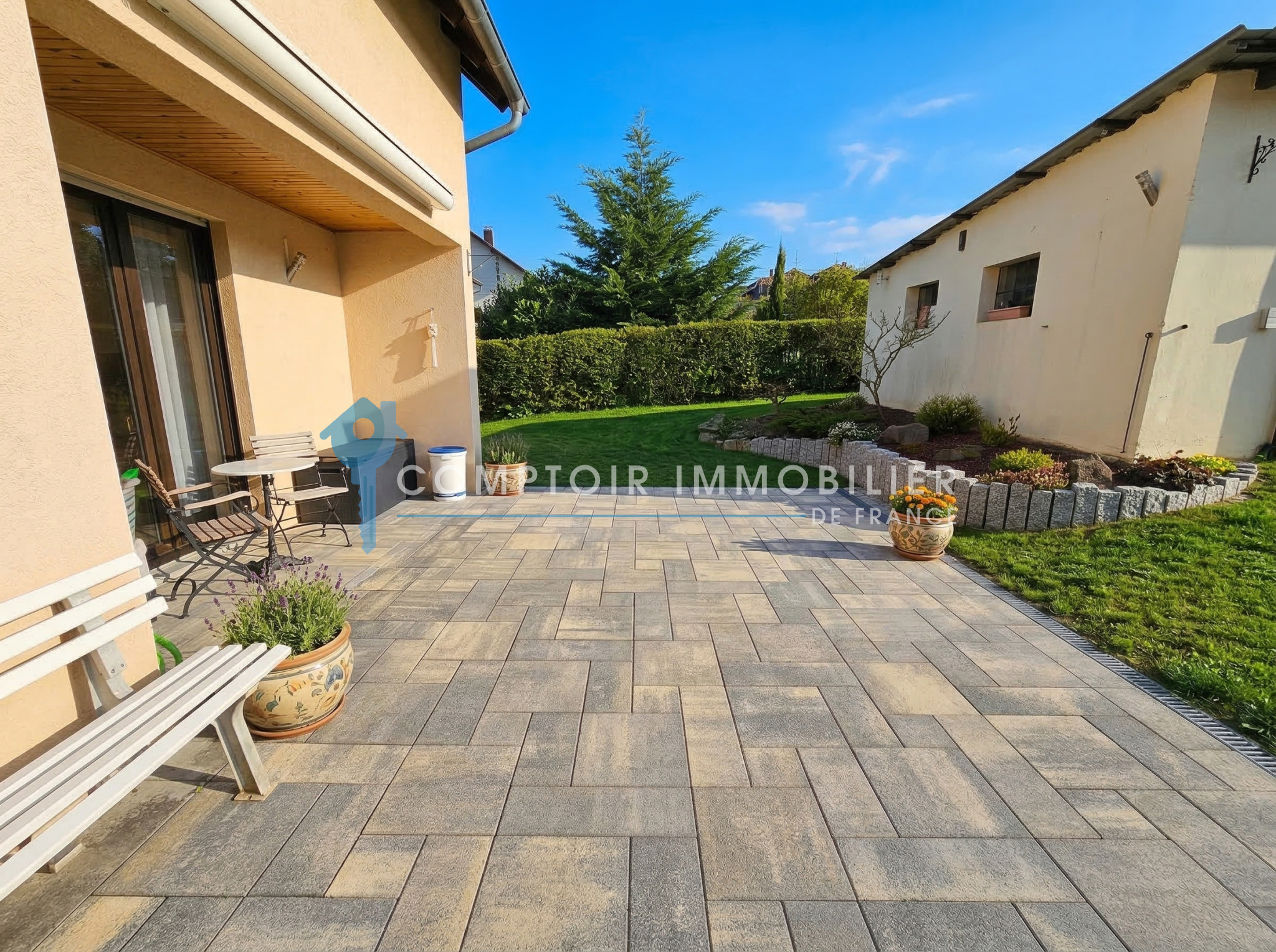 Au rez-de-chaussée, vous découvrirez un spacieux et lumineux séjour double avec accès direct à la terrasse et au jardin, idéal pour profiter des beaux jours. La cuisine équipée offre également une sortie vers l’extérieur, apportant confort et praticité au quotidien. Un WC invité complète ce niveau.