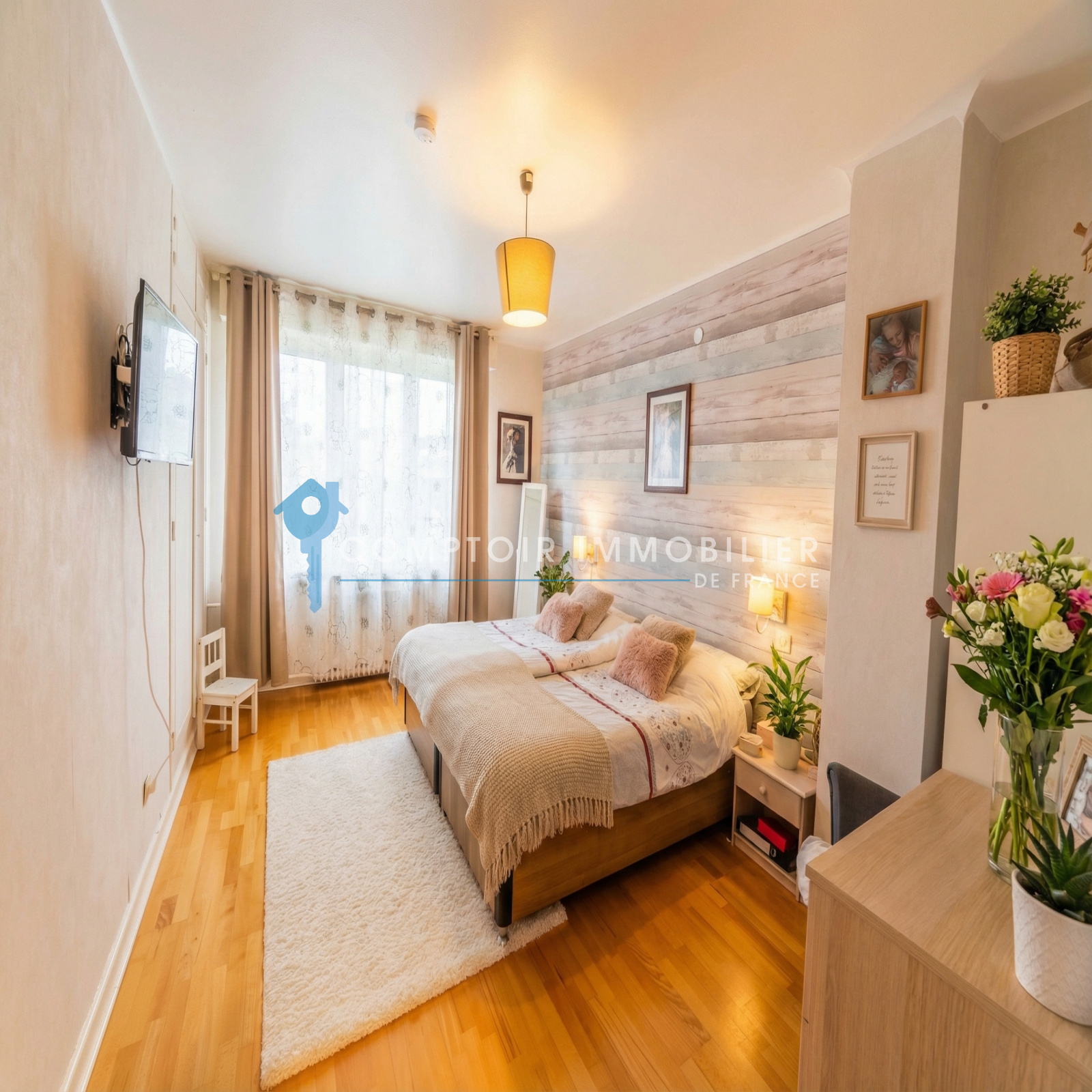 À l’étage, l’espace nuit se compose d’une chambre parentale avec salle de bains, de quatre chambres pour enfants et d’une salle d’eau.