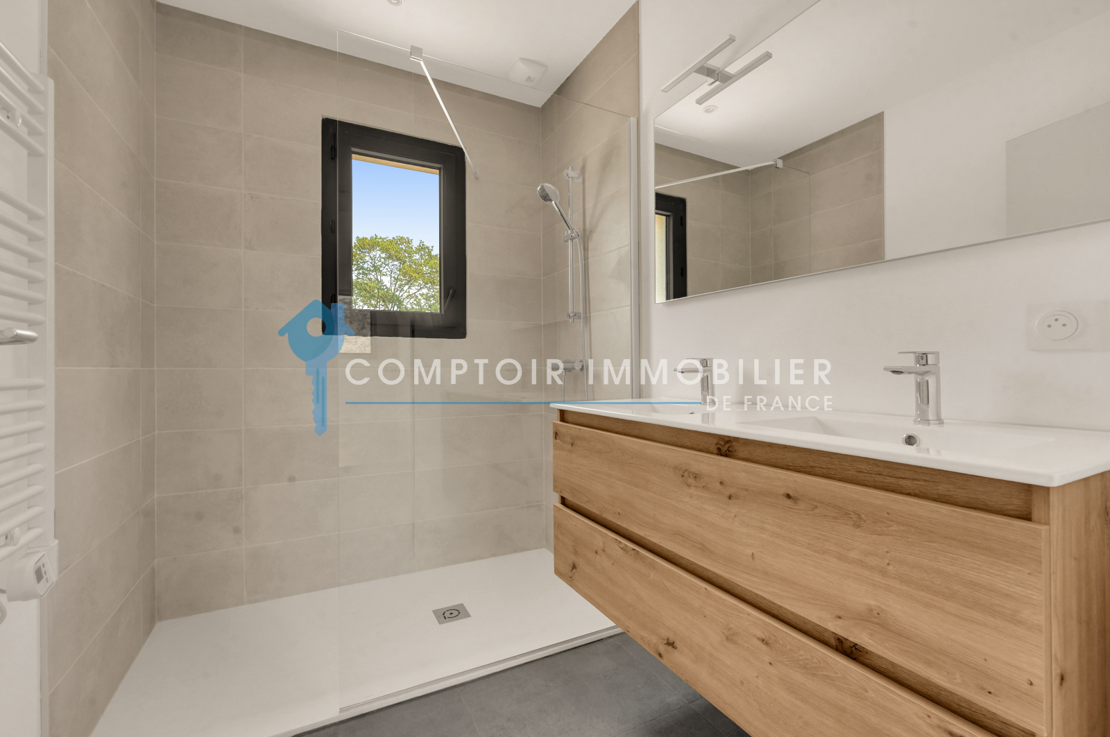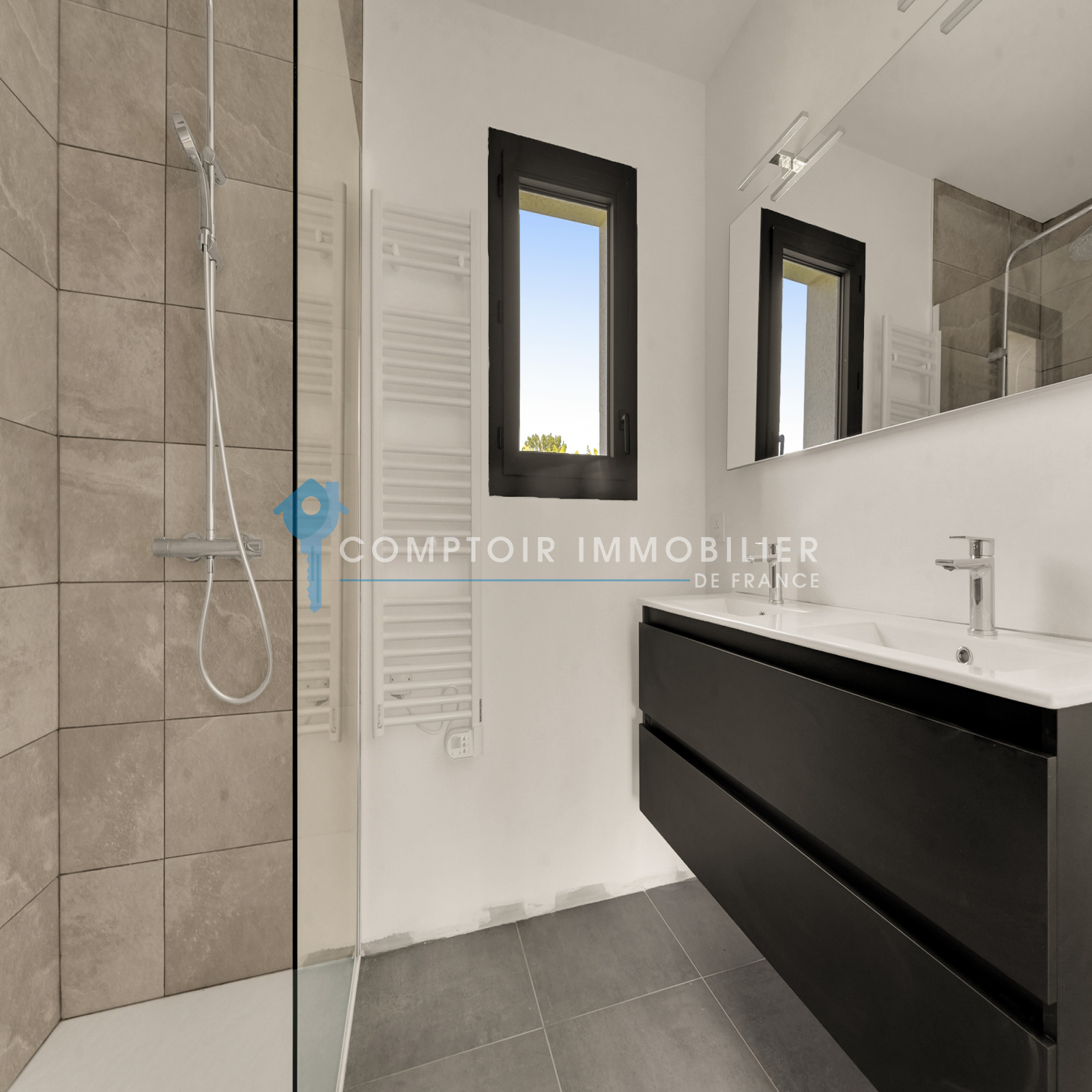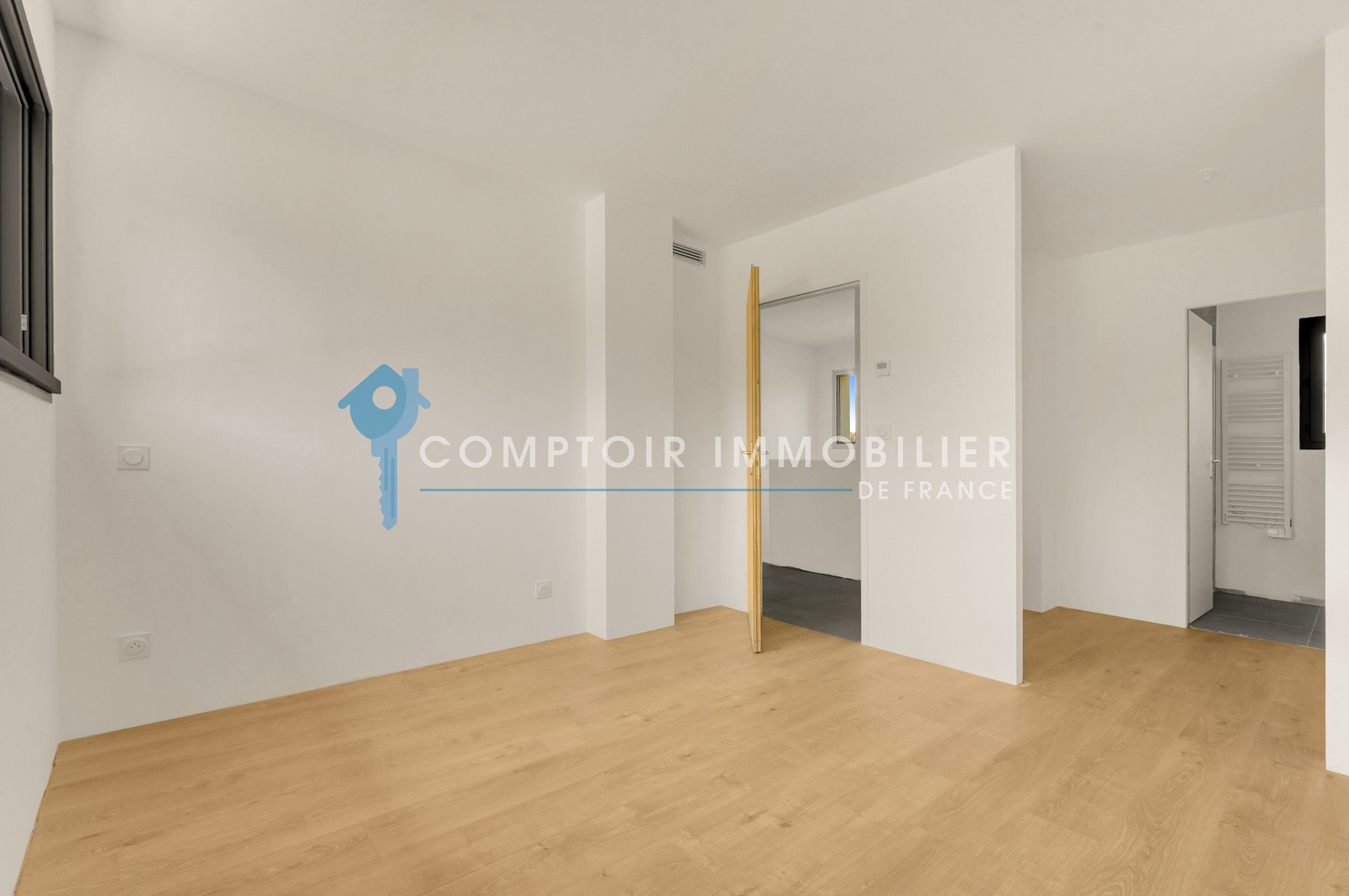 Carrelage contemporain, parquet dans les chambres, finitions élégantes
