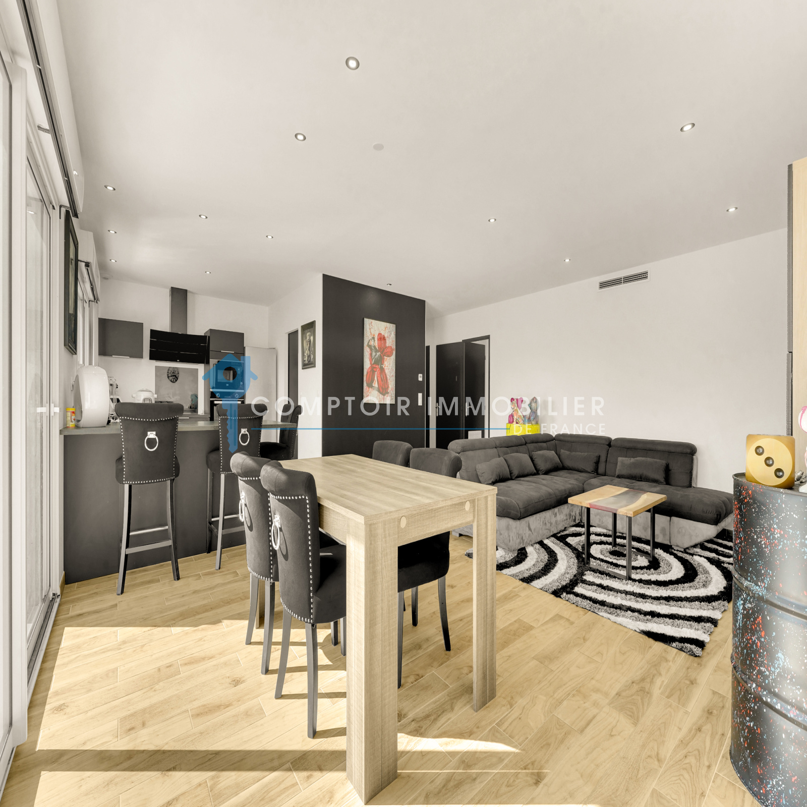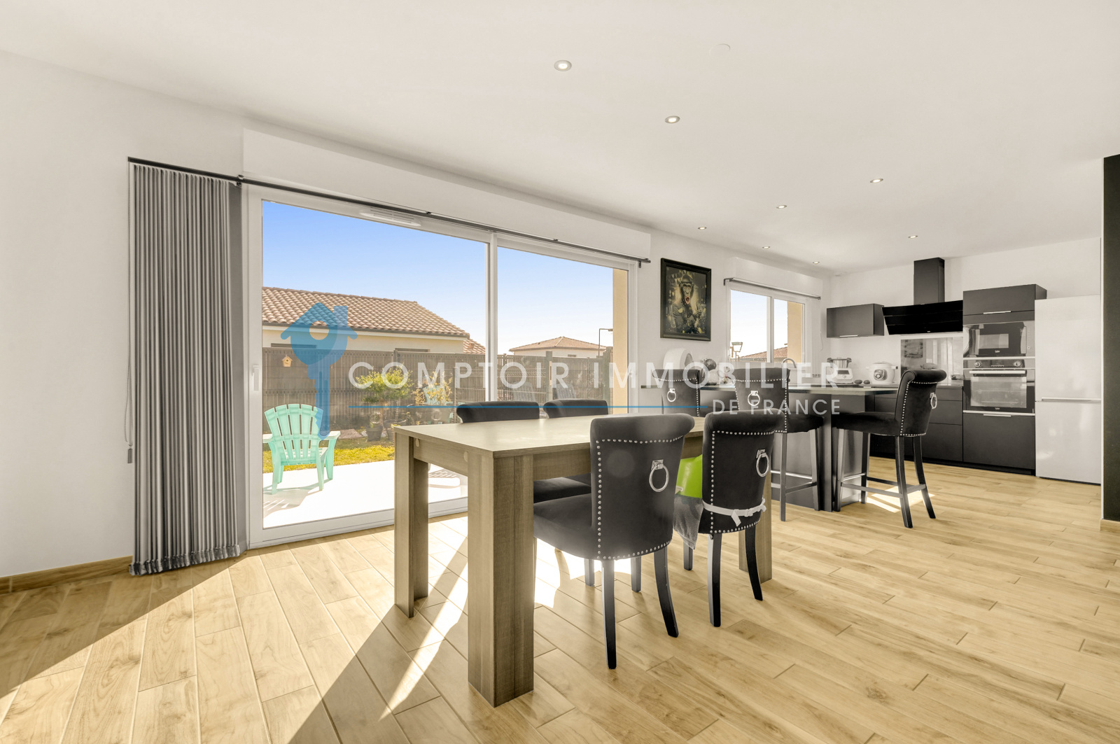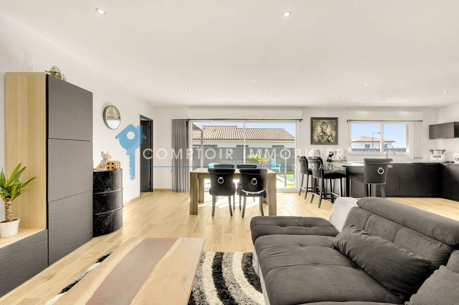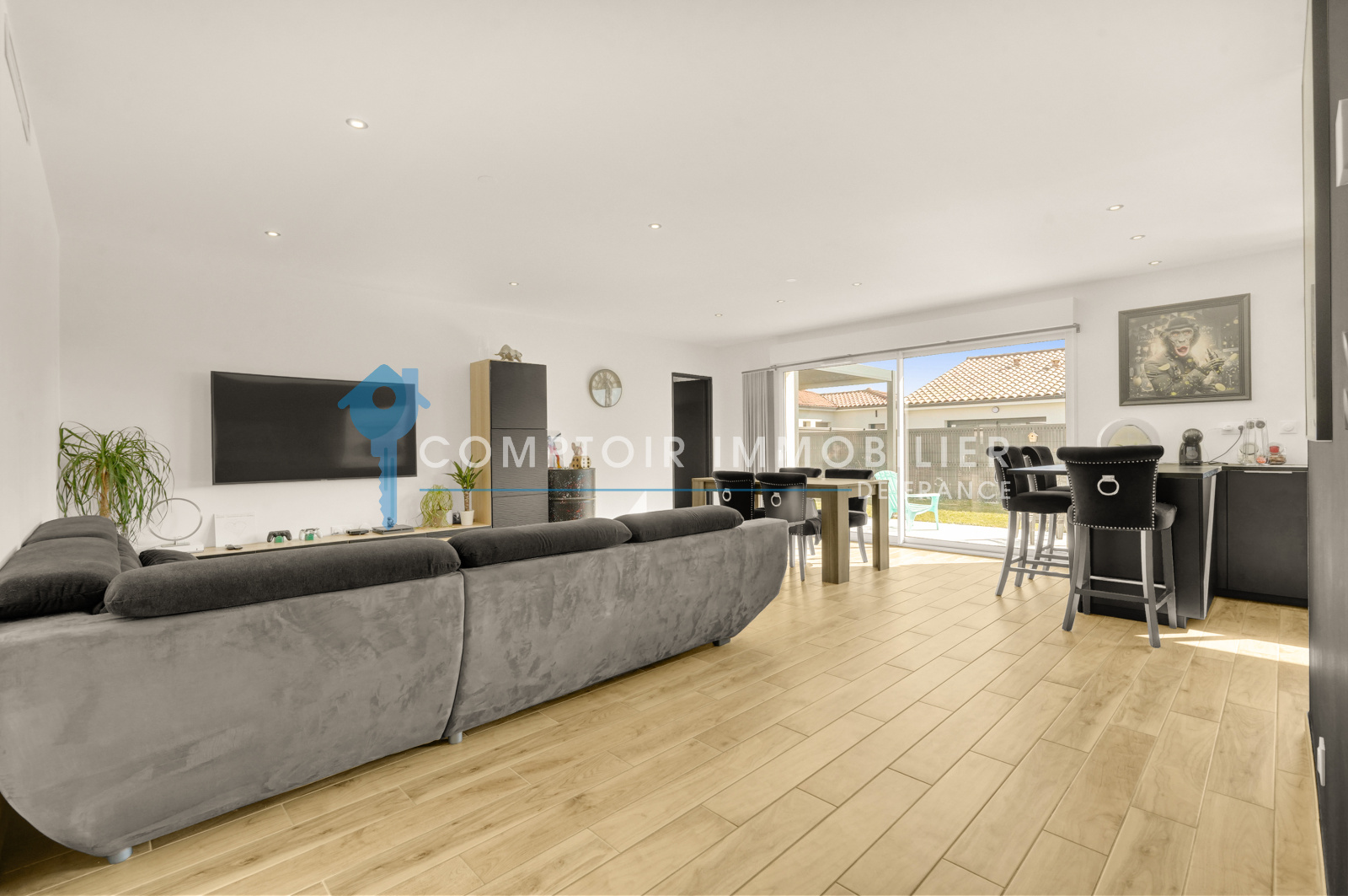 Une pièce de vie lumineuse vous accueille, généreusement ouverte sur l’extérieur grâce à ses grandes baies vitrées donnant sur la terrasse et la piscine neuve (2023). Un vrai lieu de vie où intérieur et extérieur se fondent en parfaite harmonie.