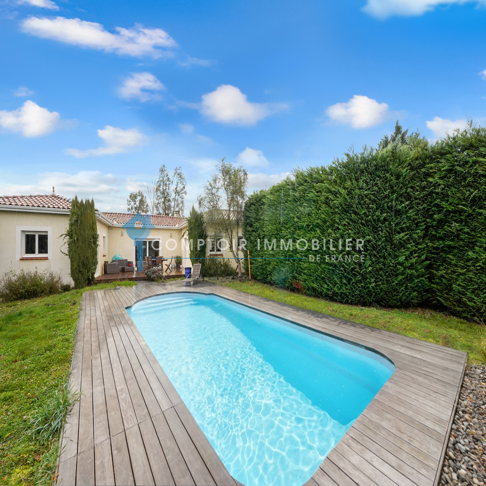 À l’extérieur, profitez d’un terrain de 2 373 m² offrant espace, sérénité et intimité. Deux terrasses aux expositions opposées : l’une côté piscine avec terrasse en bois pour profiter du soleil, et l’autre côté jardin, au calme, avec vue sur les coteaux. La piscine intégrée crée un cadre idéal pour moments conviviaux en famille ou entre amis.