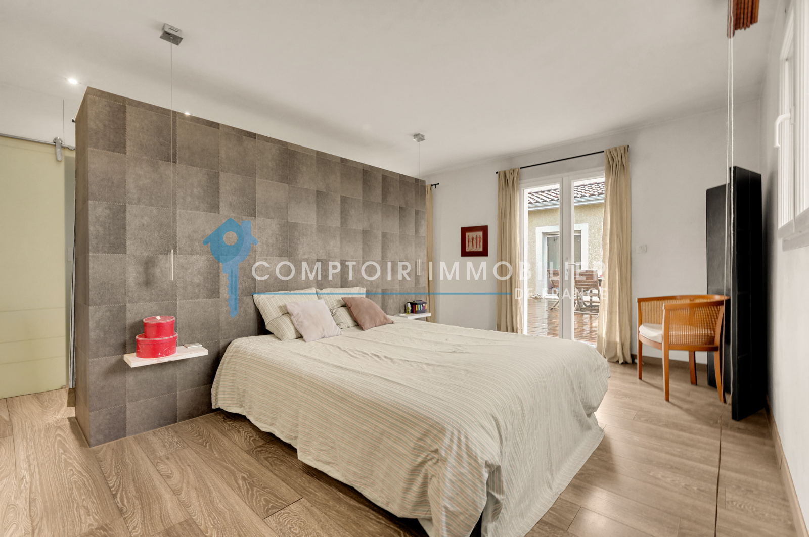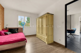 Le coin nuit principal, séparé, comprend trois chambres spacieuses, dont une suite parentale de 32 m² avec dressing et salle d’eau privative, offrant intimité et confort. Les deux autres chambres partagent une salle de bain, et deux WC complètent le confort quotidien.