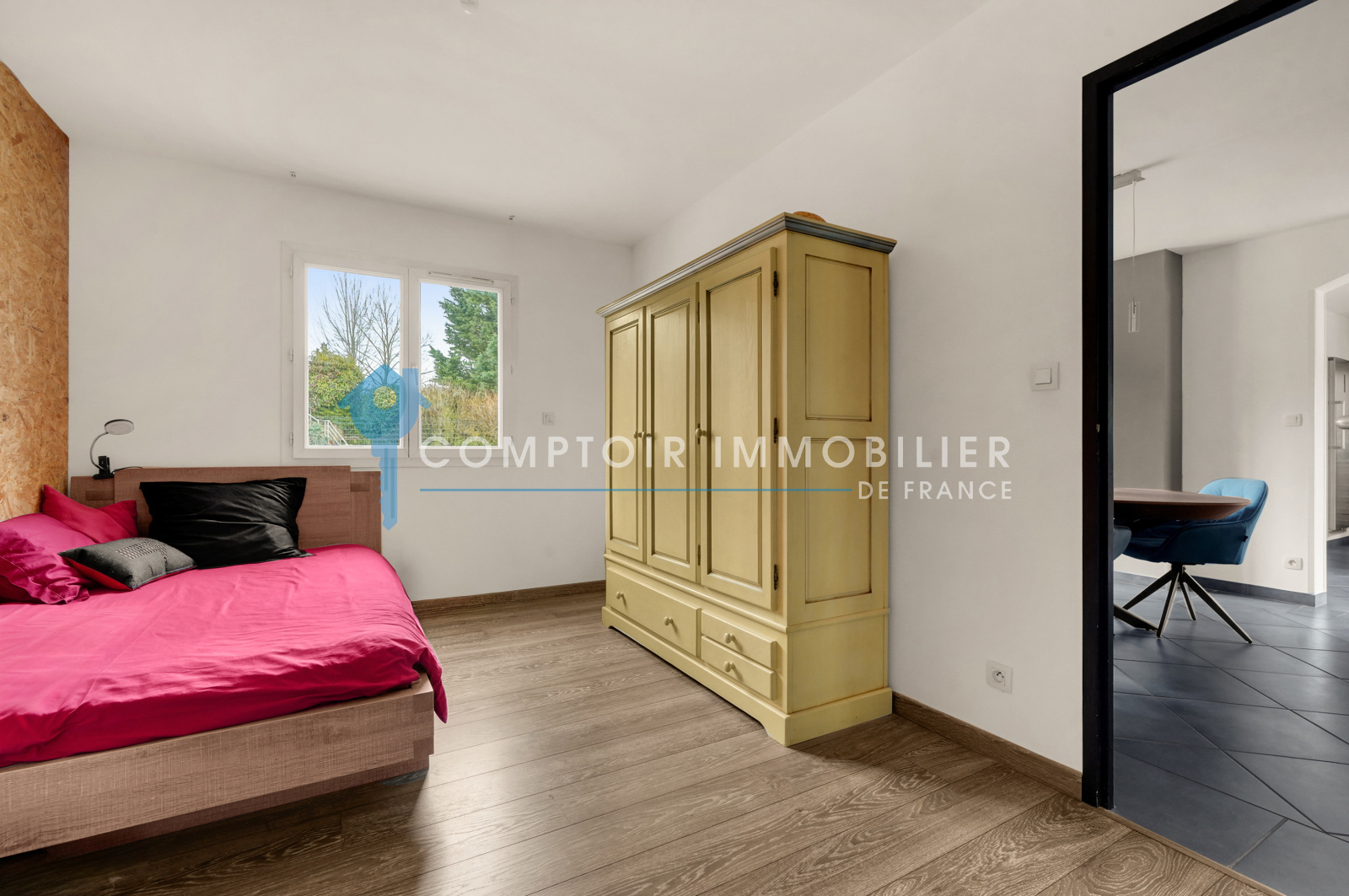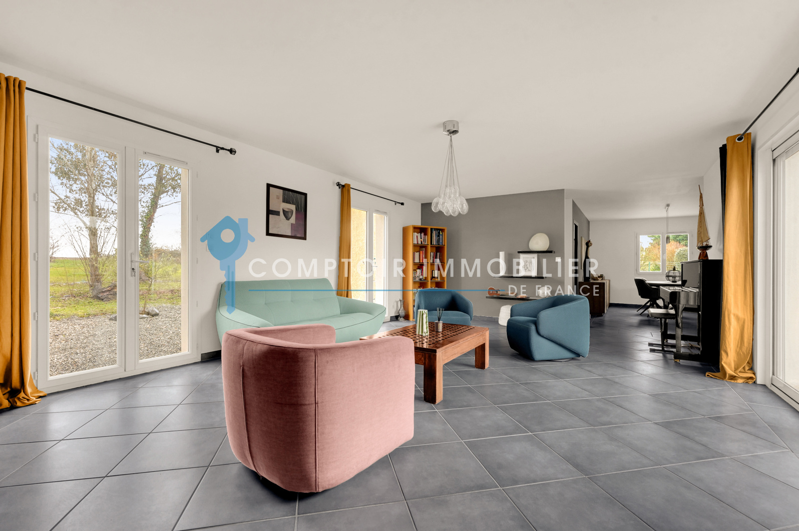 Dès l’entrée, laissez-vous séduire par la lumière naturelle et l’harmonie des espaces. La cuisine aménagée et équipée s’ouvre sur le séjour / salon de 70 m², prolongé par une baie galandage traversante orientée sud-ouest, créant un espace convivial et lumineux parfait pour recevoir ou se détendre. Le cellier attenant assure praticité et rangement.