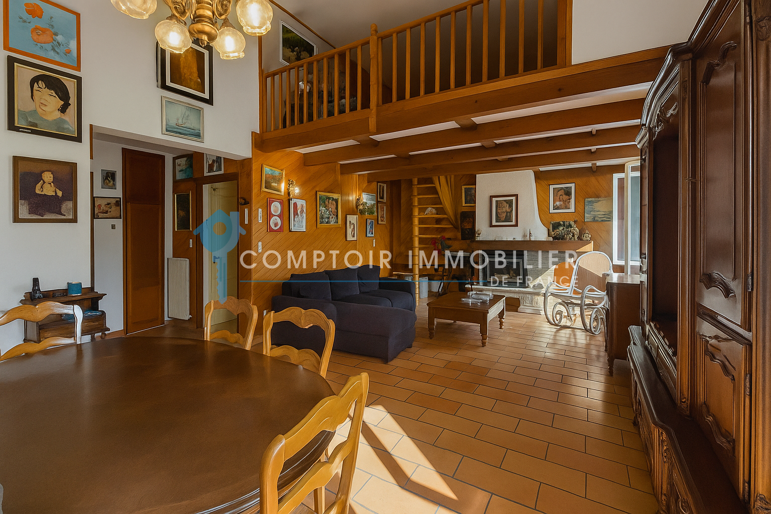 Dans un secteur résidentiel, cette maison offre un séjour spacieux profitant d’une partie en mezzanine, une cuisine, 3 chambres, salle d’eau, une véranda (climatisée), une chaufferie et une buanderie.