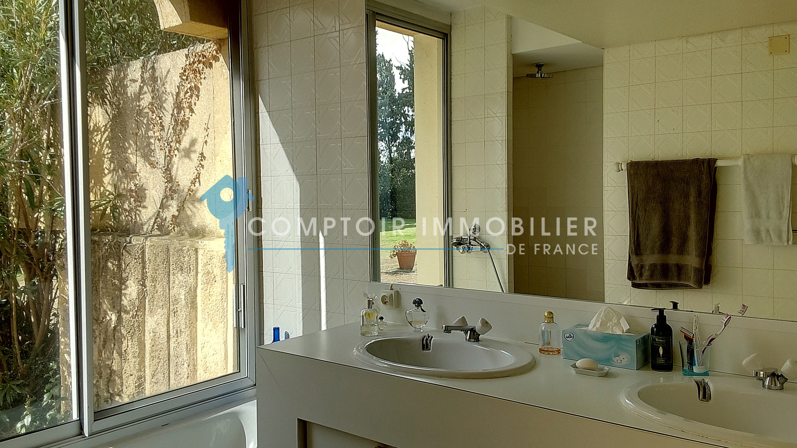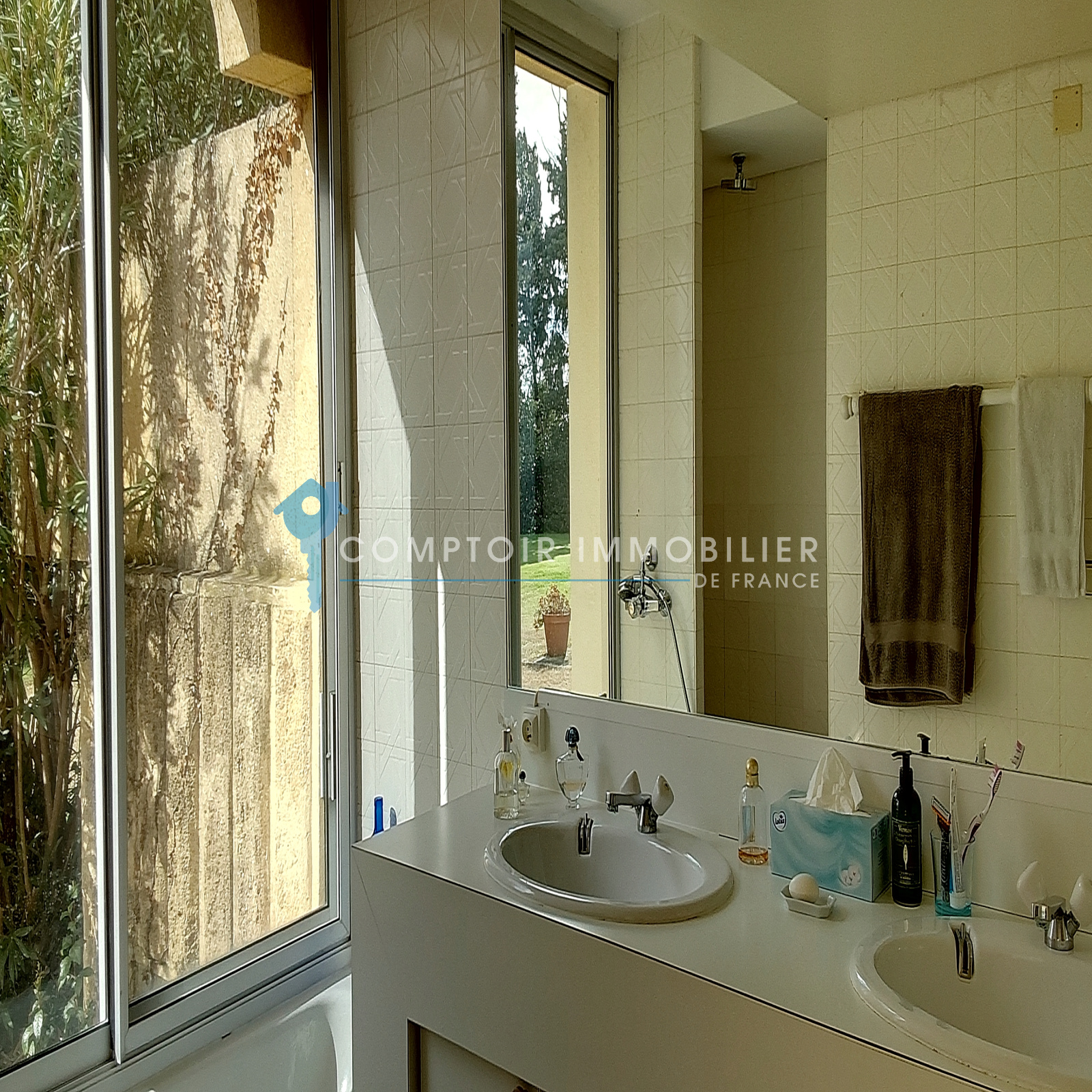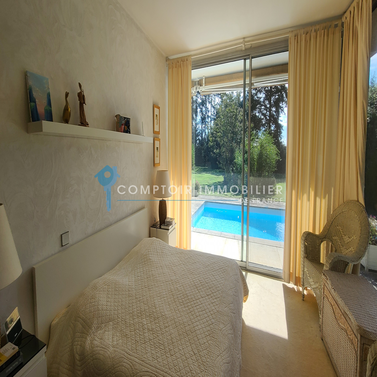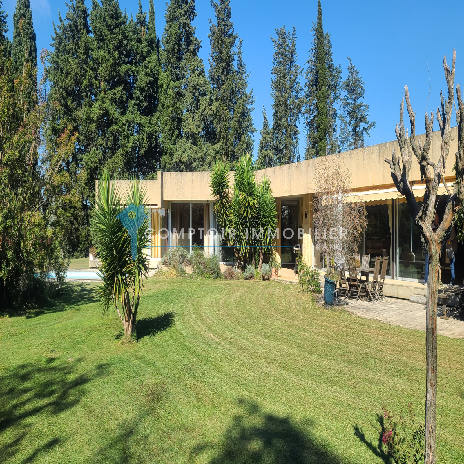 COMPROMIS SIGNE pour cette superbe villa contemporaine de plain-pied au Sud de Nîmes, signée de l'architecte Nîmois Pellier, au milieu d'une immense pelouse avec piscine, sur 1 ha de terrain clos et arboré, au calme absolu. L'ensemble lumineux aux lignes épurées, au toit terrasse blanc, aux larges baies vitrées, met en valeur la pierre blonde du Pont du Gard. La villa totalise 260 m². Belle entrée éclairée par un puits de lumière, séjour de 80 m² avec grande cheminée, jolie cuisine entièrement equipée, 4 chambres dont une suite ouvrant sur la verdure et la piscine, et 3 salles de bains . Nombreux placards et penderies, buanderie, cave à vin, atelier, garage couvert, terrain de pétanque complètent l'ensemble. Eau BRL, arrosage automatique.