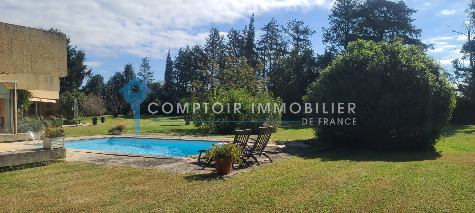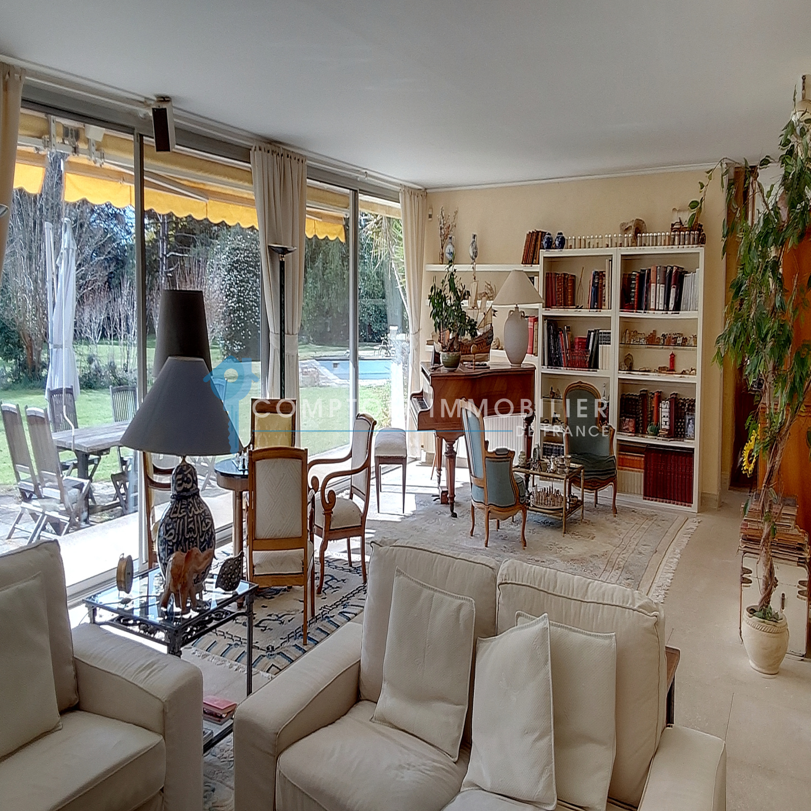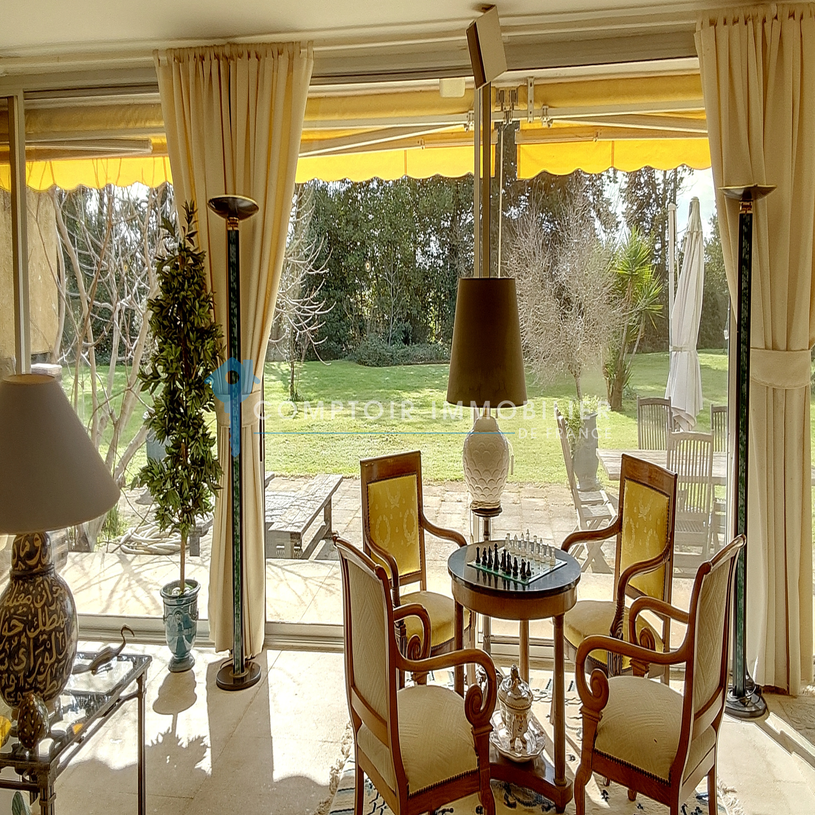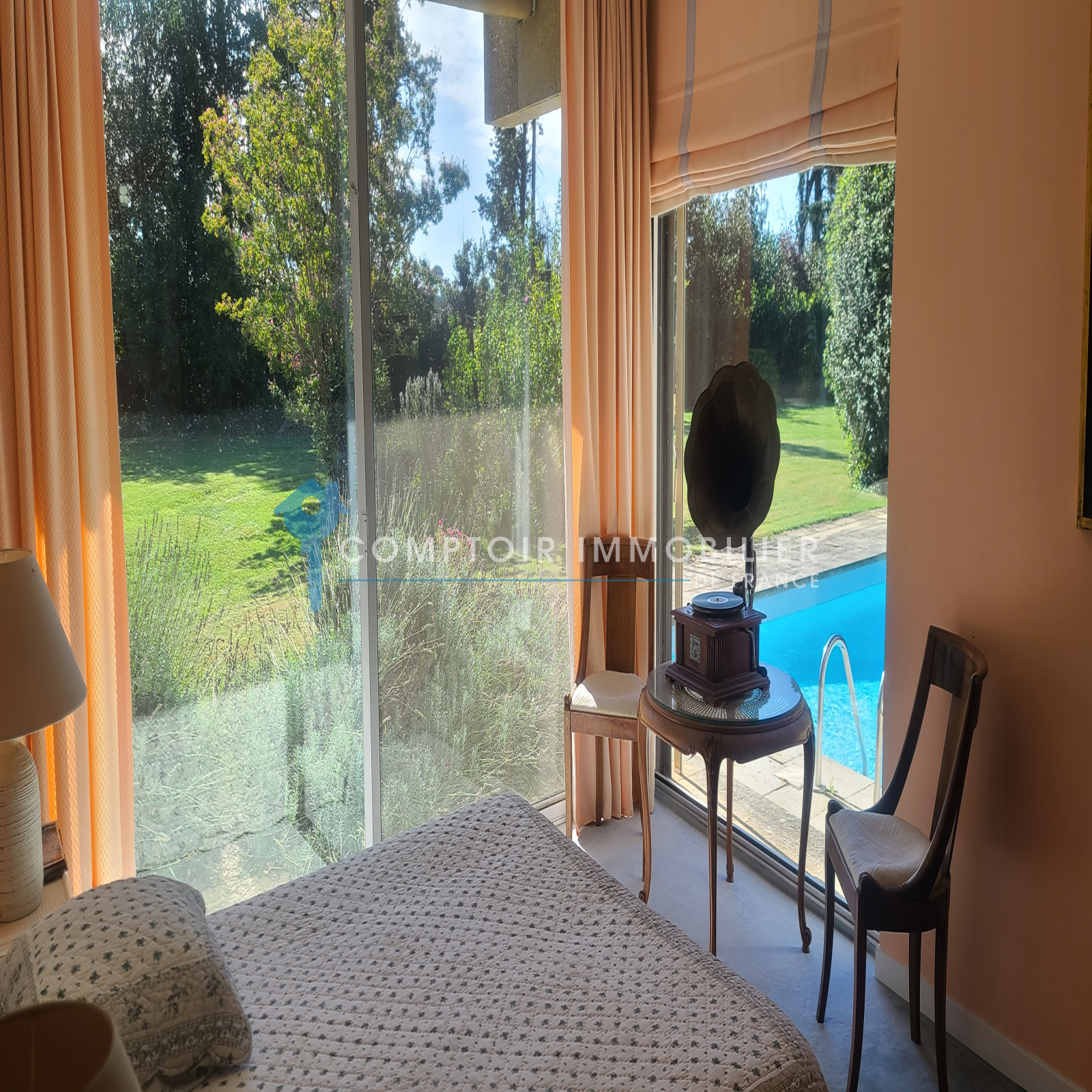 COMPROMIS SIGNE pour cette superbe villa contemporaine de plain-pied au Sud de Nîmes, signée de l'architecte Nîmois Pellier, au milieu d'une immense pelouse avec piscine, sur 1 ha de terrain clos et arboré, au calme absolu. L'ensemble lumineux aux lignes épurées, au toit terrasse blanc, aux larges baies vitrées, met en valeur la pierre blonde du Pont du Gard. La villa totalise 260 m². Belle entrée éclairée par un puits de lumière, séjour de 80 m² avec grande cheminée, jolie cuisine entièrement equipée, 4 chambres dont une suite ouvrant sur la verdure et la piscine, et 3 salles de bains . Nombreux placards et penderies, buanderie, cave à vin, atelier, garage couvert, terrain de pétanque complètent l'ensemble. Eau BRL, arrosage automatique.