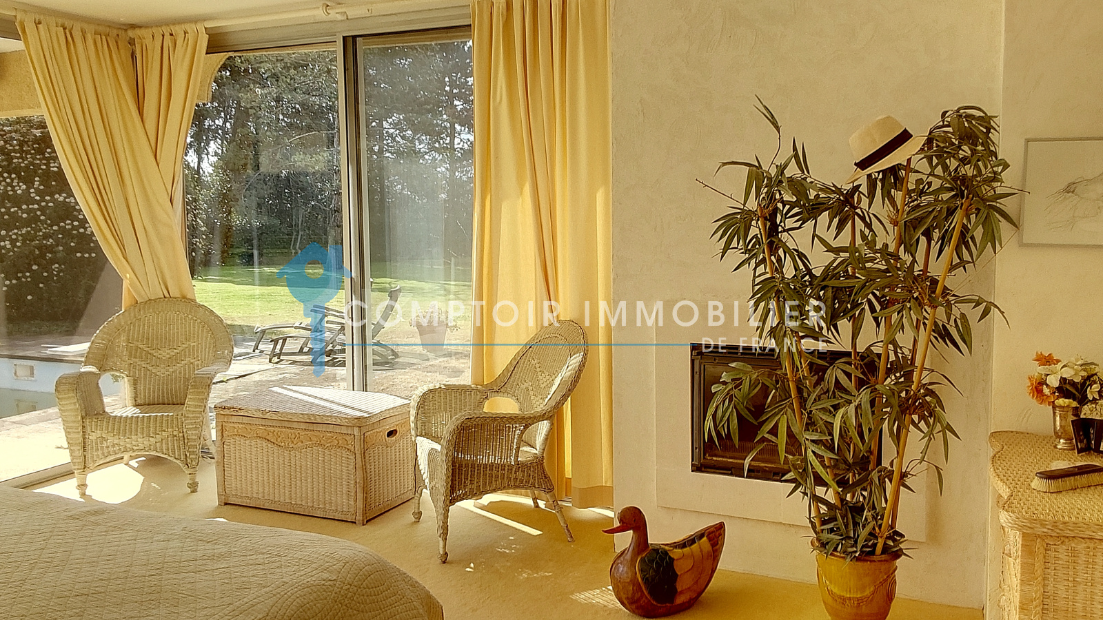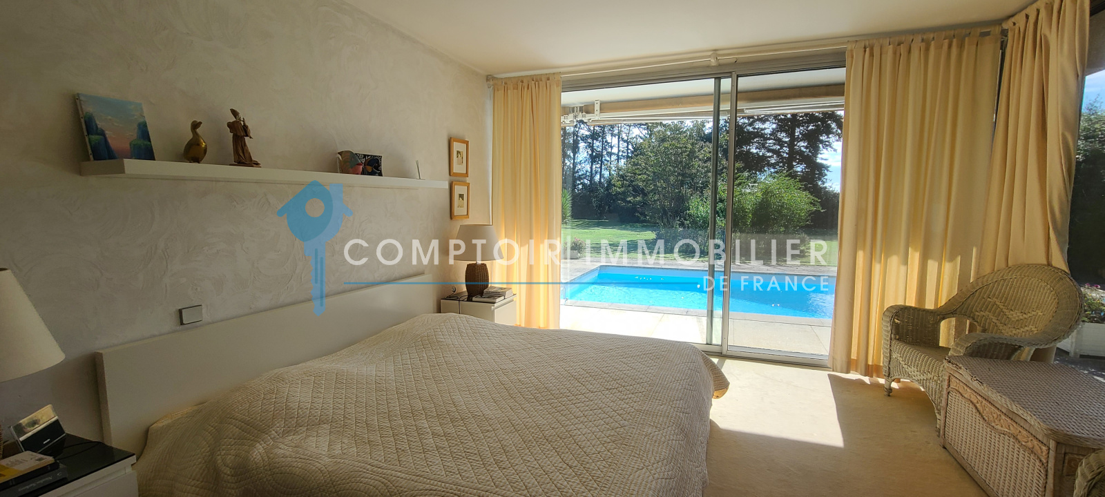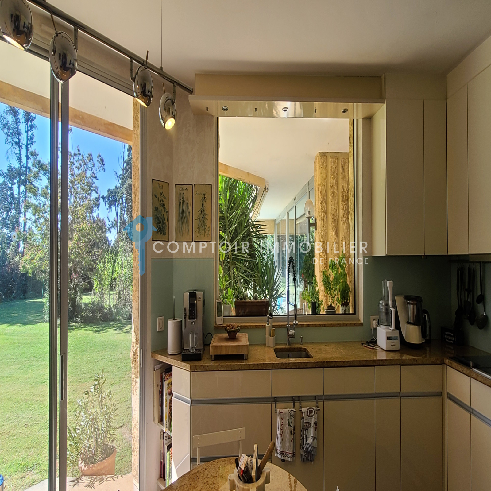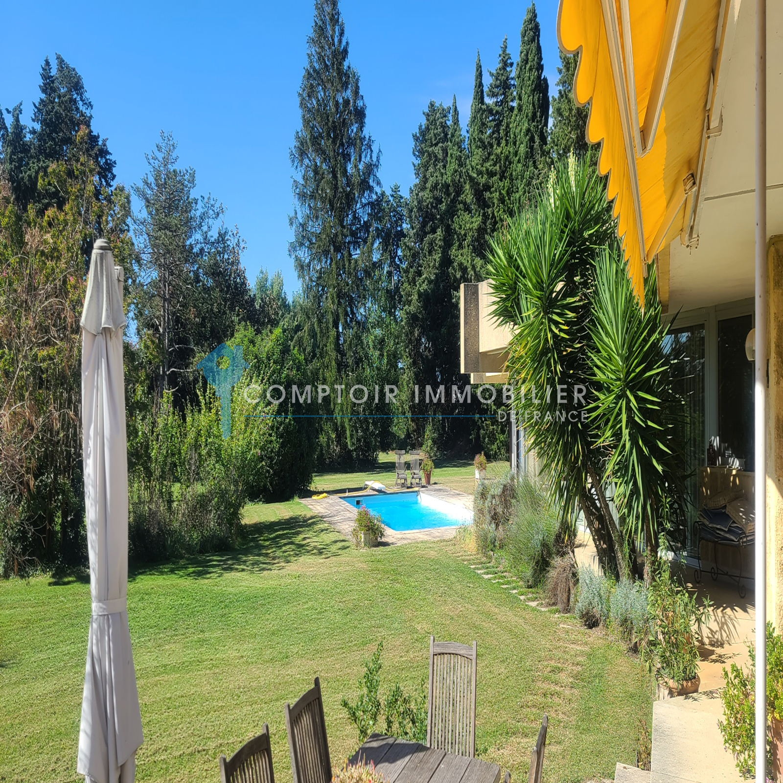 COMPROMIS SIGNE pour cette superbe villa contemporaine de plain-pied au Sud de Nîmes, signée de l'architecte Nîmois Pellier, au milieu d'une immense pelouse avec piscine, sur 1 ha de terrain clos et arboré, au calme absolu. L'ensemble lumineux aux lignes épurées, au toit terrasse blanc, aux larges baies vitrées, met en valeur la pierre blonde du Pont du Gard. La villa totalise 260 m². Belle entrée éclairée par un puits de lumière, séjour de 80 m² avec grande cheminée, jolie cuisine entièrement equipée, 4 chambres dont une suite ouvrant sur la verdure et la piscine, et 3 salles de bains . Nombreux placards et penderies, buanderie, cave à vin, atelier, garage couvert, terrain de pétanque complètent l'ensemble. Eau BRL, arrosage automatique.