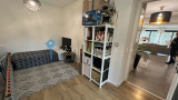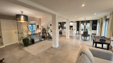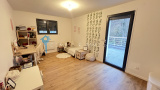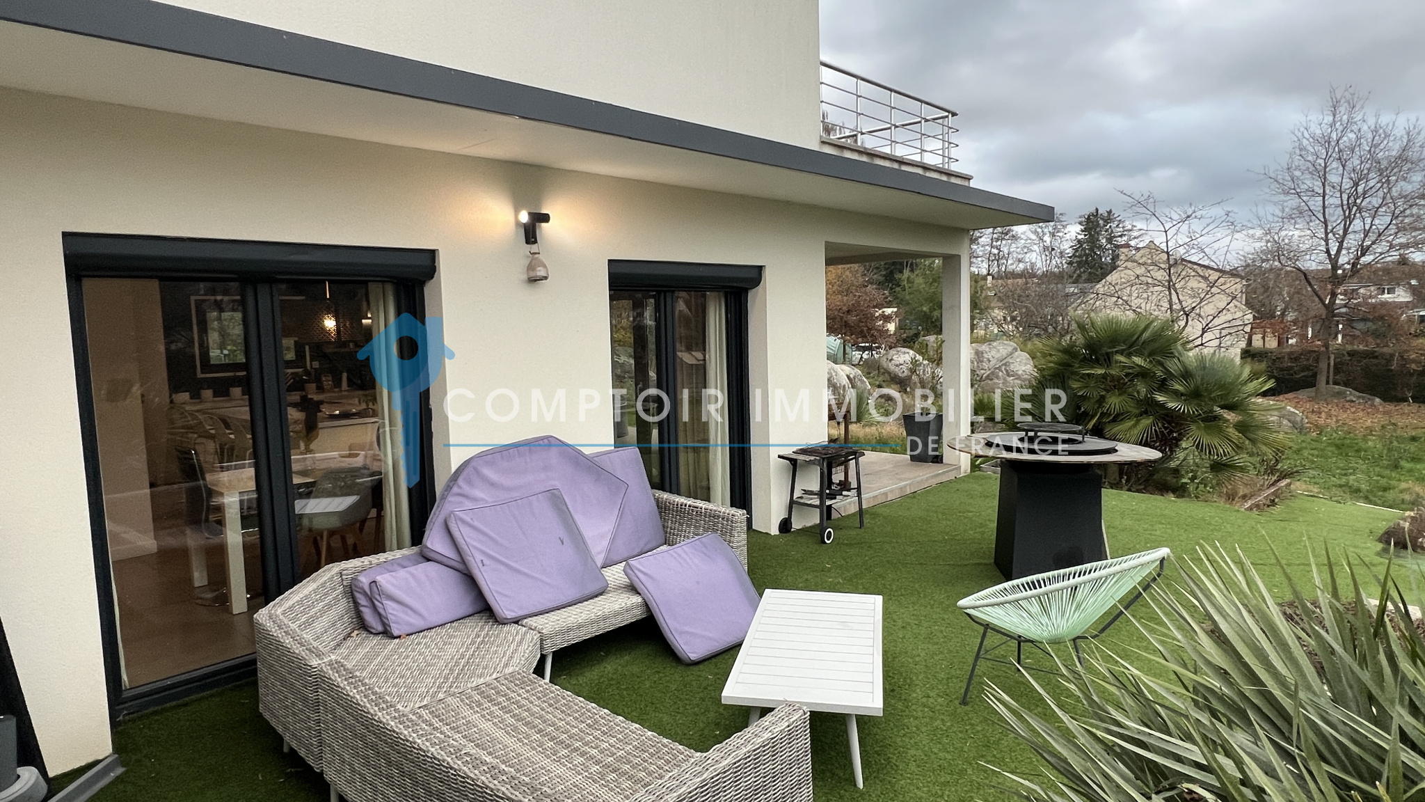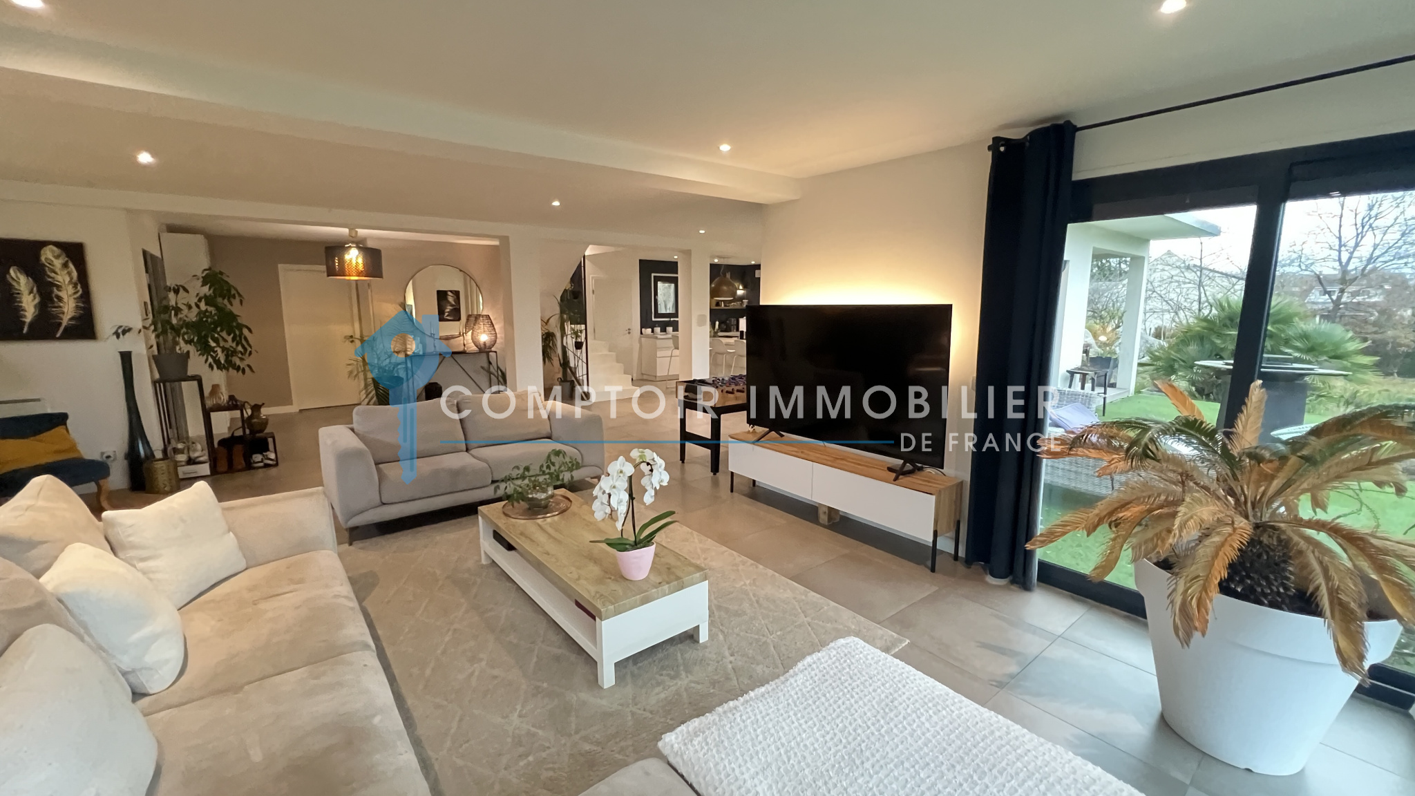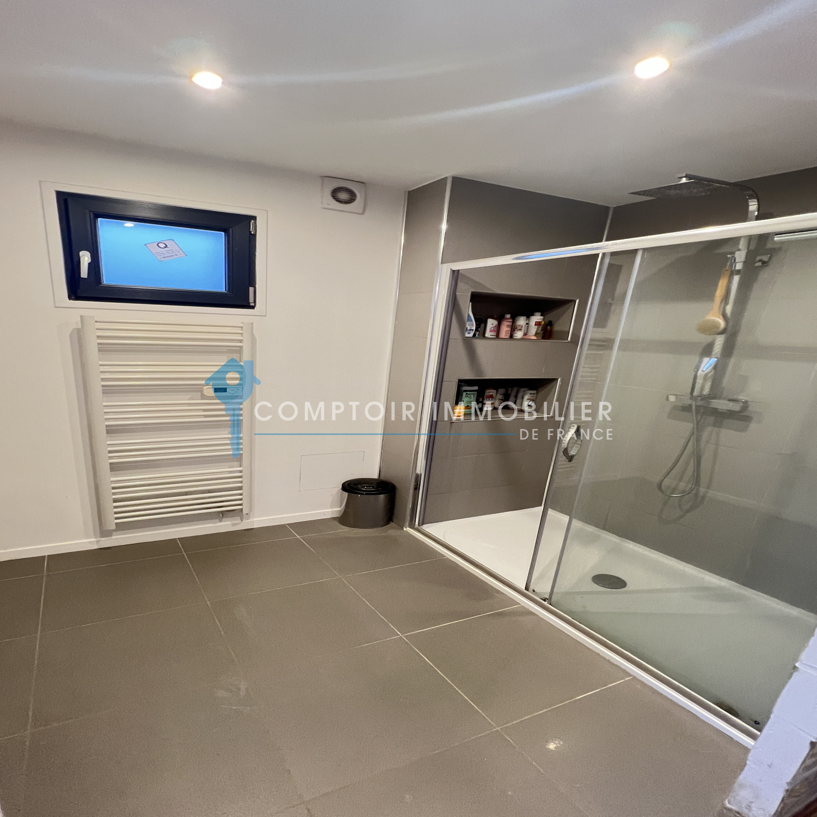 Au rdc la propriété dispose d'une vaste entrée ouverte sur salon, salle à manger et cuisine aménagée et équipée (l'ensemble = 84m2) et donnant sur deux terrasses (sud et est), une chambre, un cellier/arrière cuisine et un wc.