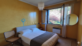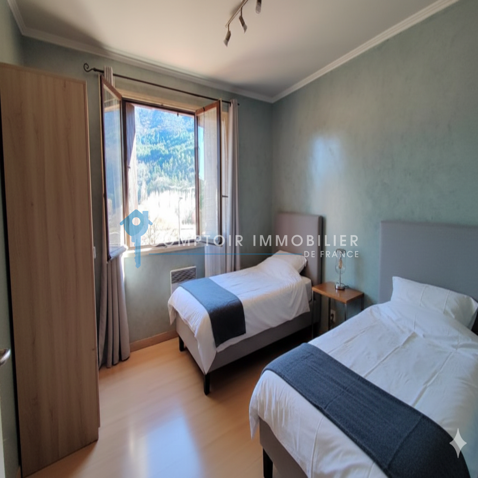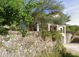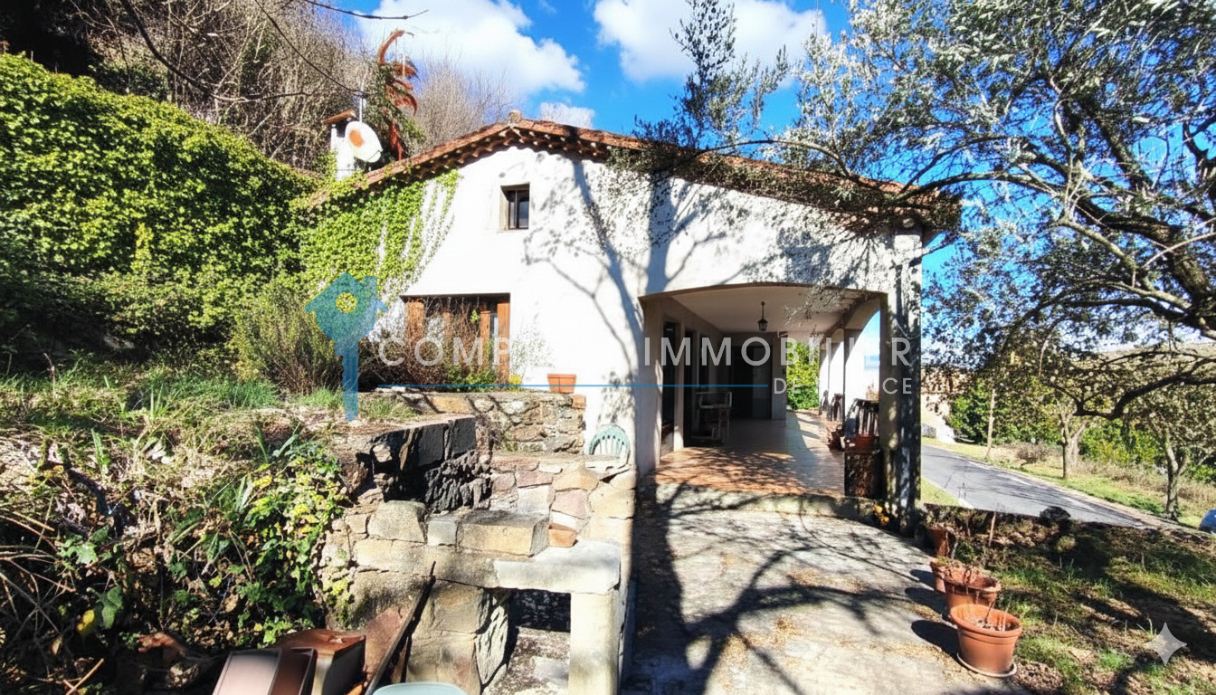 1er étage au niveau du terrain en restanque : grande terrasse avec vue dégagée accessible du salon avec cheminée foyer ouvert et de la cuisine indépendante semi-équipée, salle de bains, wc indépendant, 2 chambres .