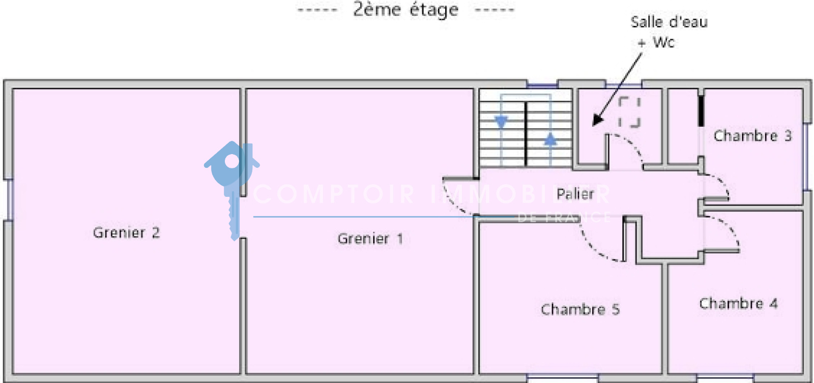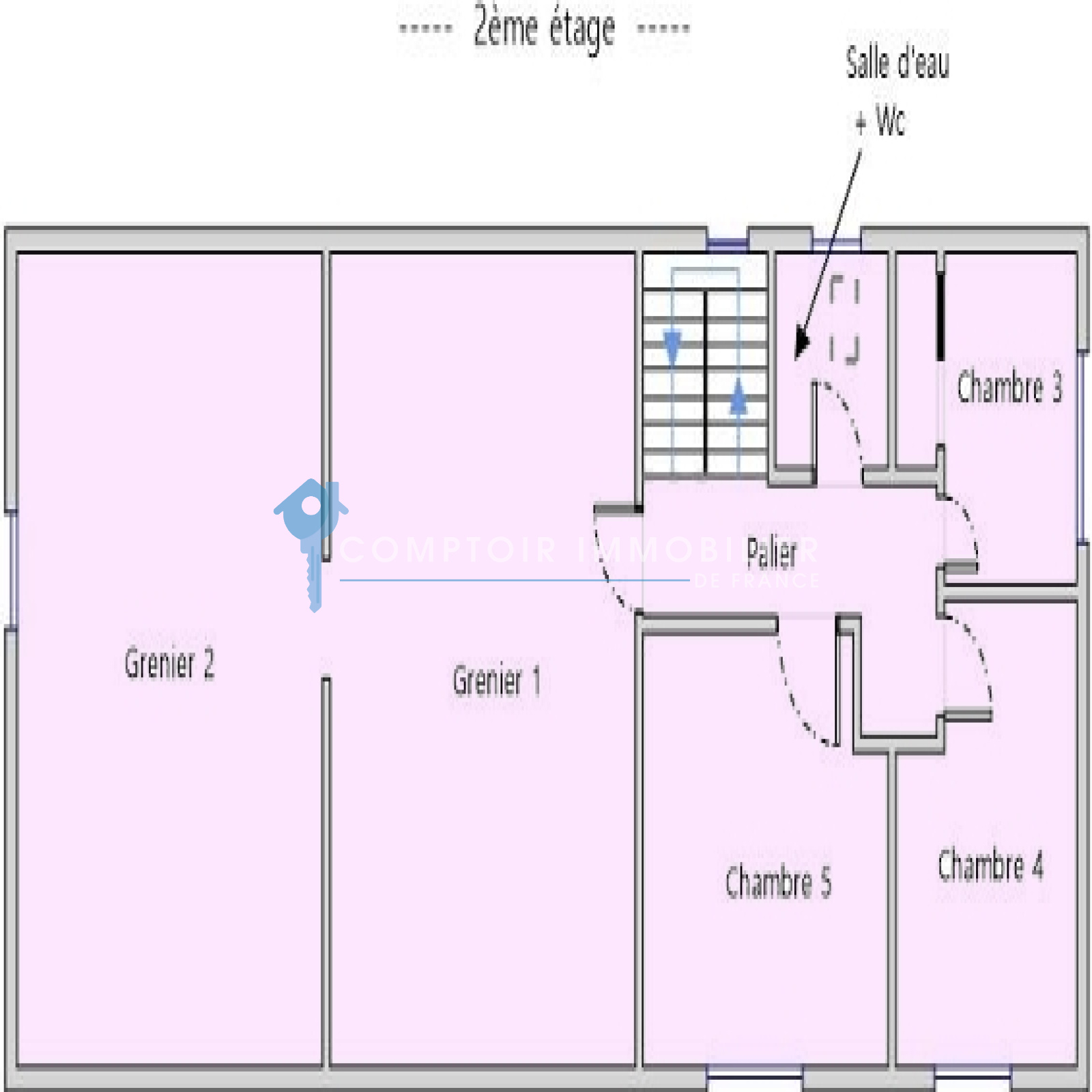 2ème étage : 3 chambres et une salle d'eau avec wc + 2 greniers accessibles par le pallier et aménageables avec possibilité de surélévation pour agrandir la surface habitable