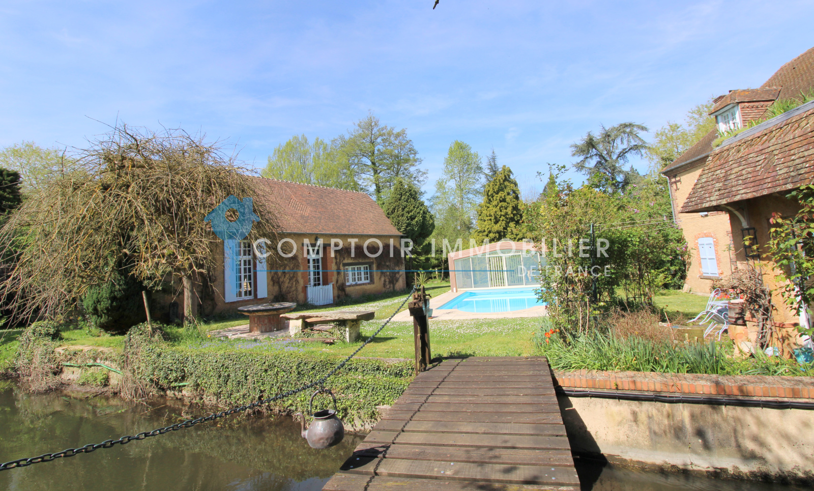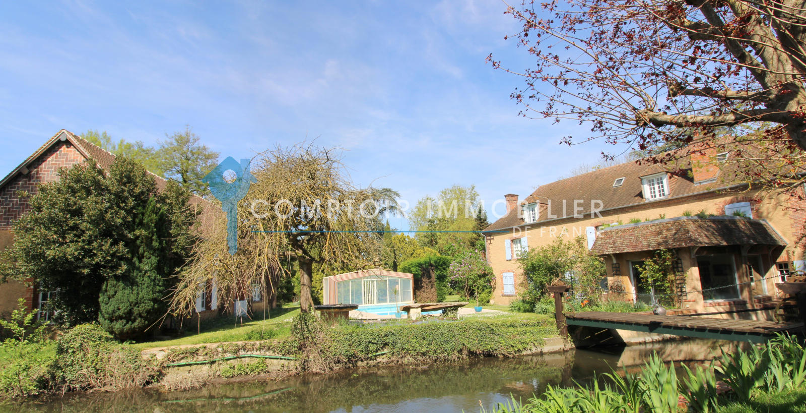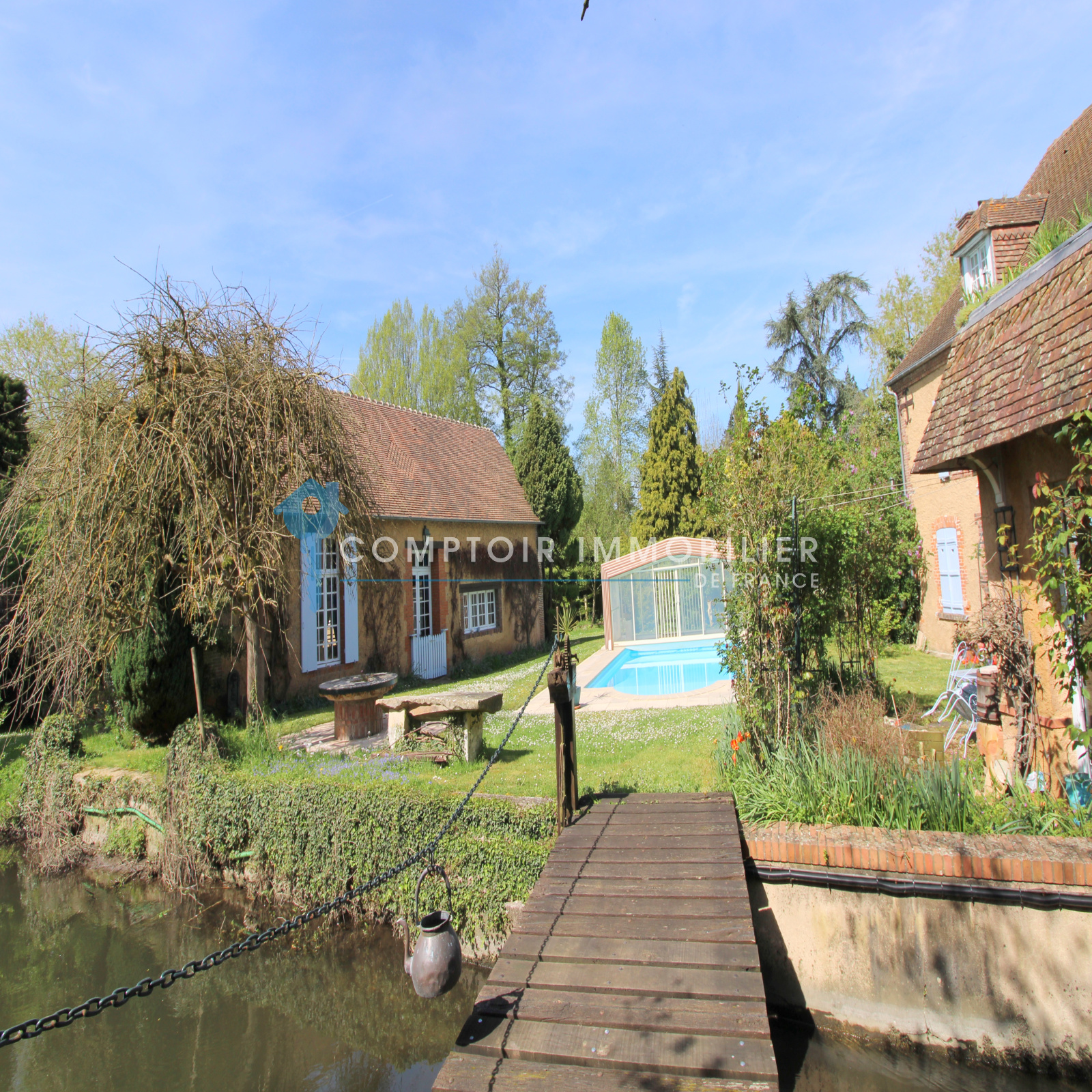 Proche Anet, dans un environnement verdoyant et en bordure de rivière, magnifique propriété comprenant 3 habitations dont un moulin du 17ème, qui dispose d'un beau salon/salle à manger, cuisine aménagée et équipée, veranda ouverte sur jardin et rivière. Au 1er étage, palier desservant 4 chambres dont 1 avec salle de douche et wc, salle de douche, salle de douche avec wc. Au 2ème étage, salle de jeux, 3 belles chambres, salle de bains/douche avec wc. Dépendance 1, elle dispose d'un beau salon/salle à manger avec coin cuisine, chambre avec salle de bains et wc, salle de douche. A l'étage, mezzanine, chambre. Grange disposant salle de réception, mezzanine. Atelier. Serre. Le tout agrémenté par une piscine et sauna finlandais, rivière et bras de rivière, et un beau parc de 3,5 ha environ.