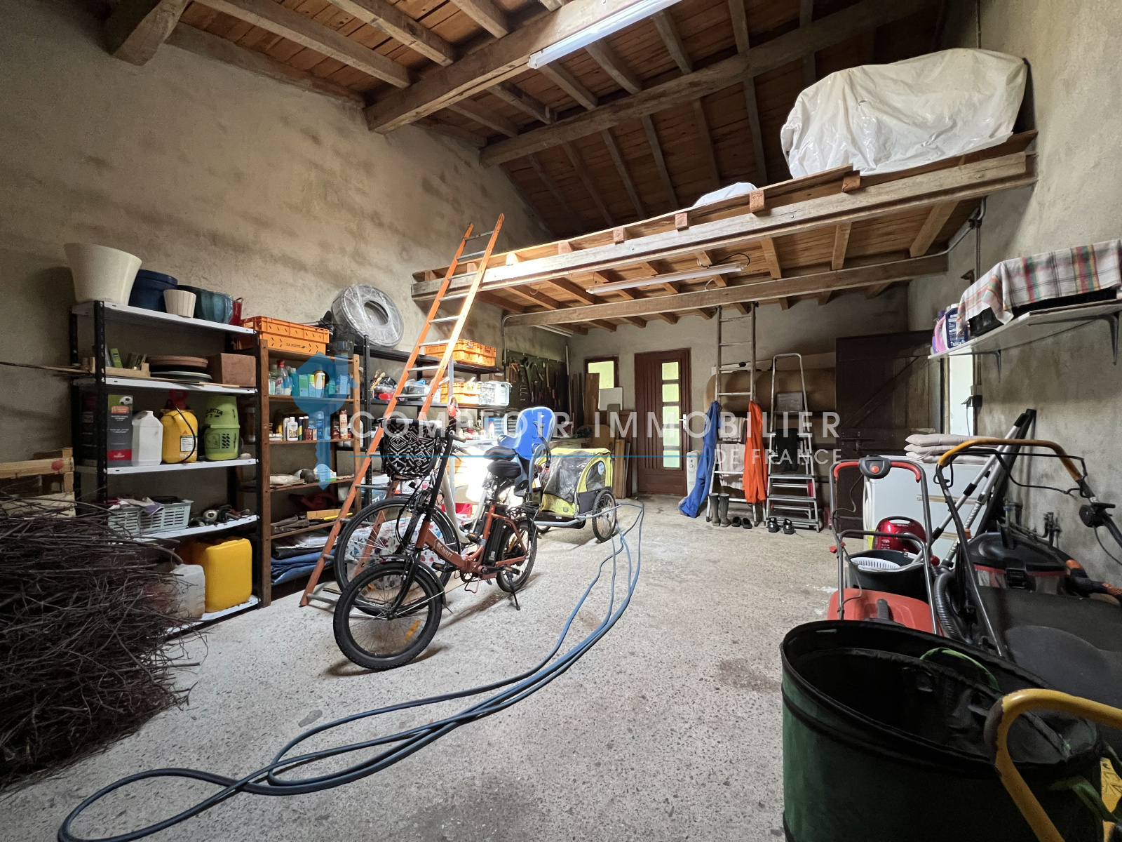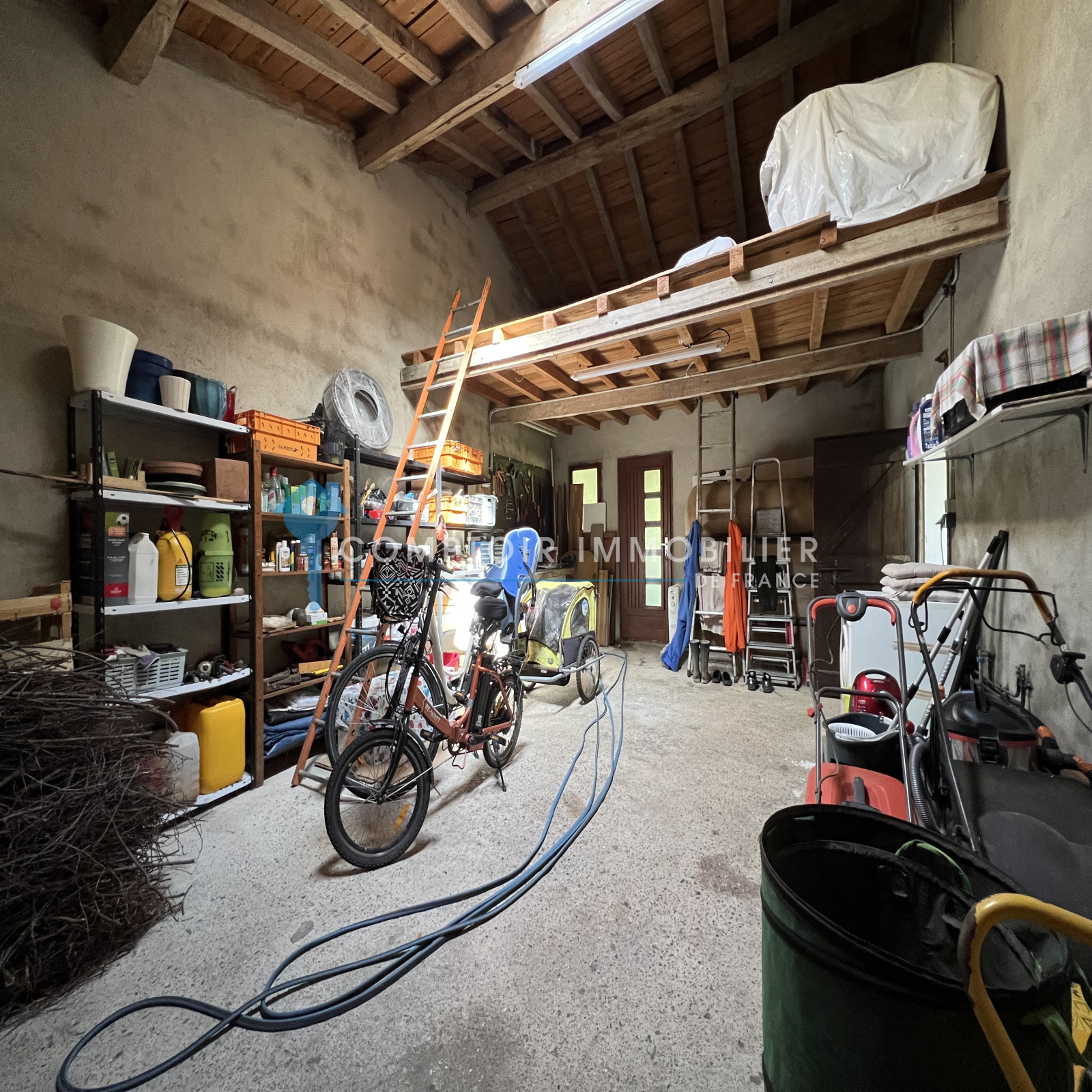 Grand garage de 40m² avec mezzanine, coin atelier.