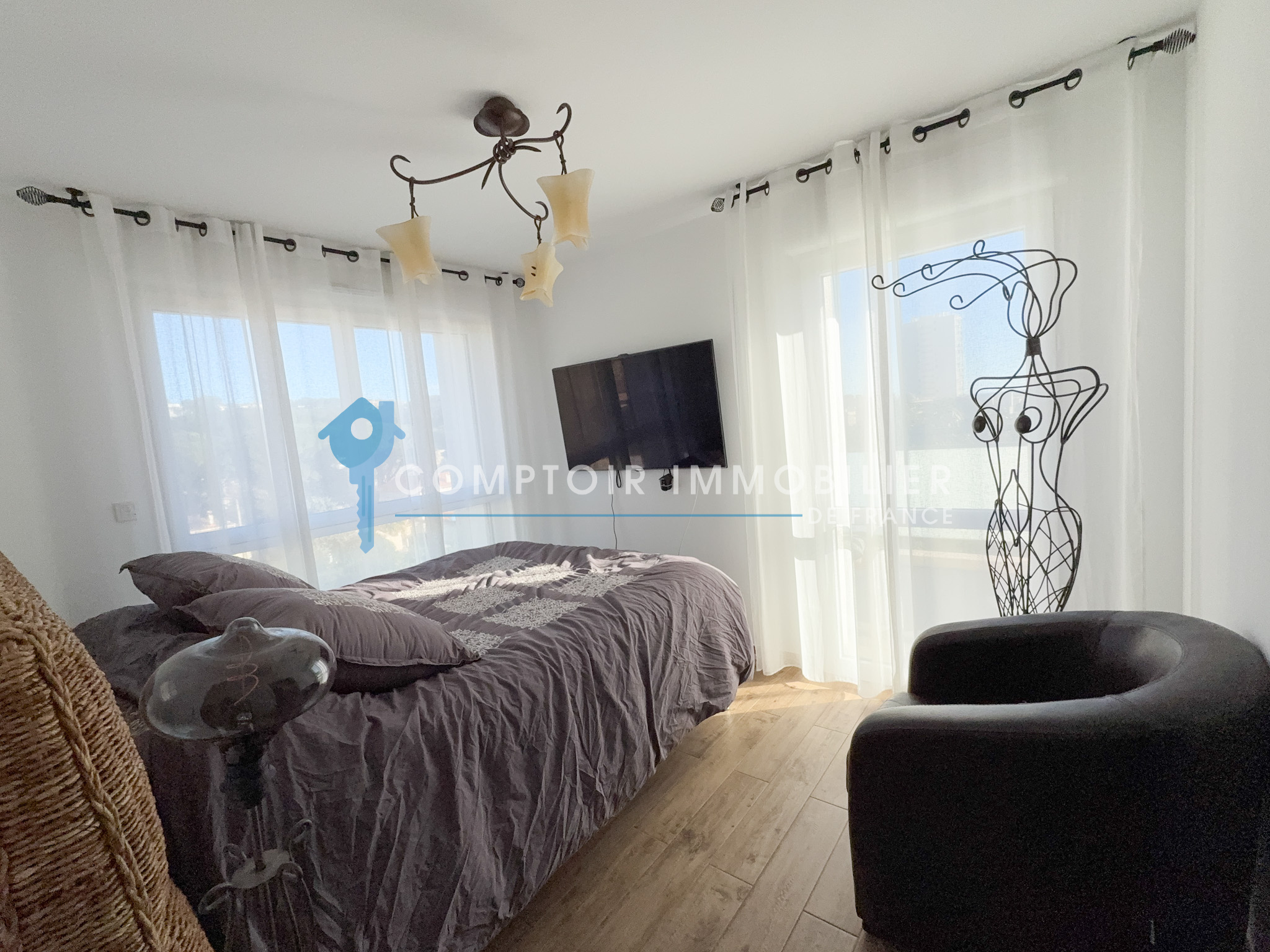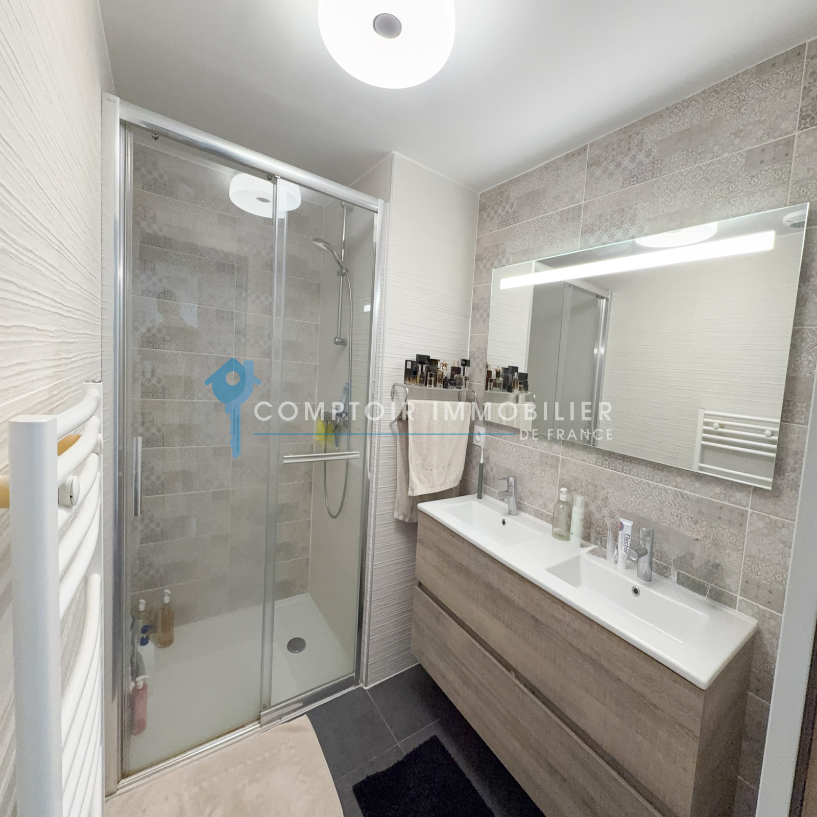 L’appartement offre deux chambres très lumineuses, toutes deux équipées de climatisation, ainsi qu’une salle d’eau moderne avec sèche-serviettes.
